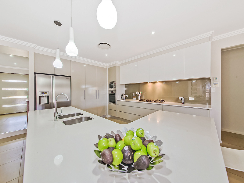 The generous designer kitchen has great bench space, plenty of storage, a large gas stove top, electric oven, Caesar stone bench tops, concealed rangehood, Miele integrated dishwasher, and there's an island bench with breakfast bar return.