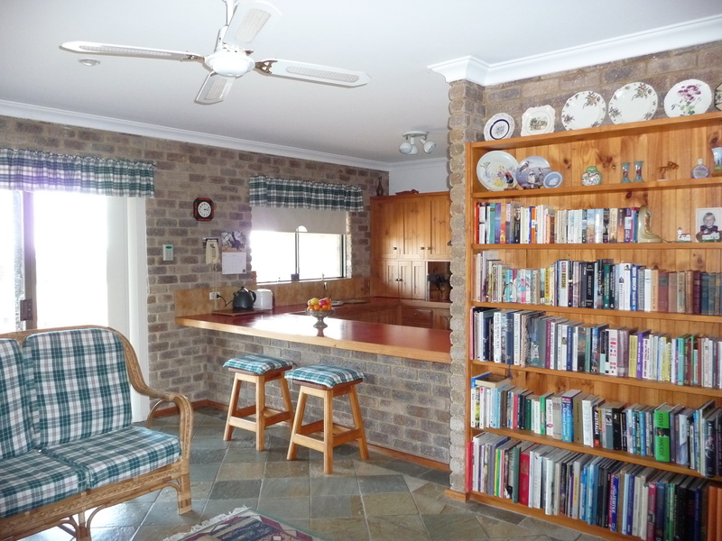 Country style kitchen with ample solid pine cupboards and large walk-in pantry, opening onto family room.