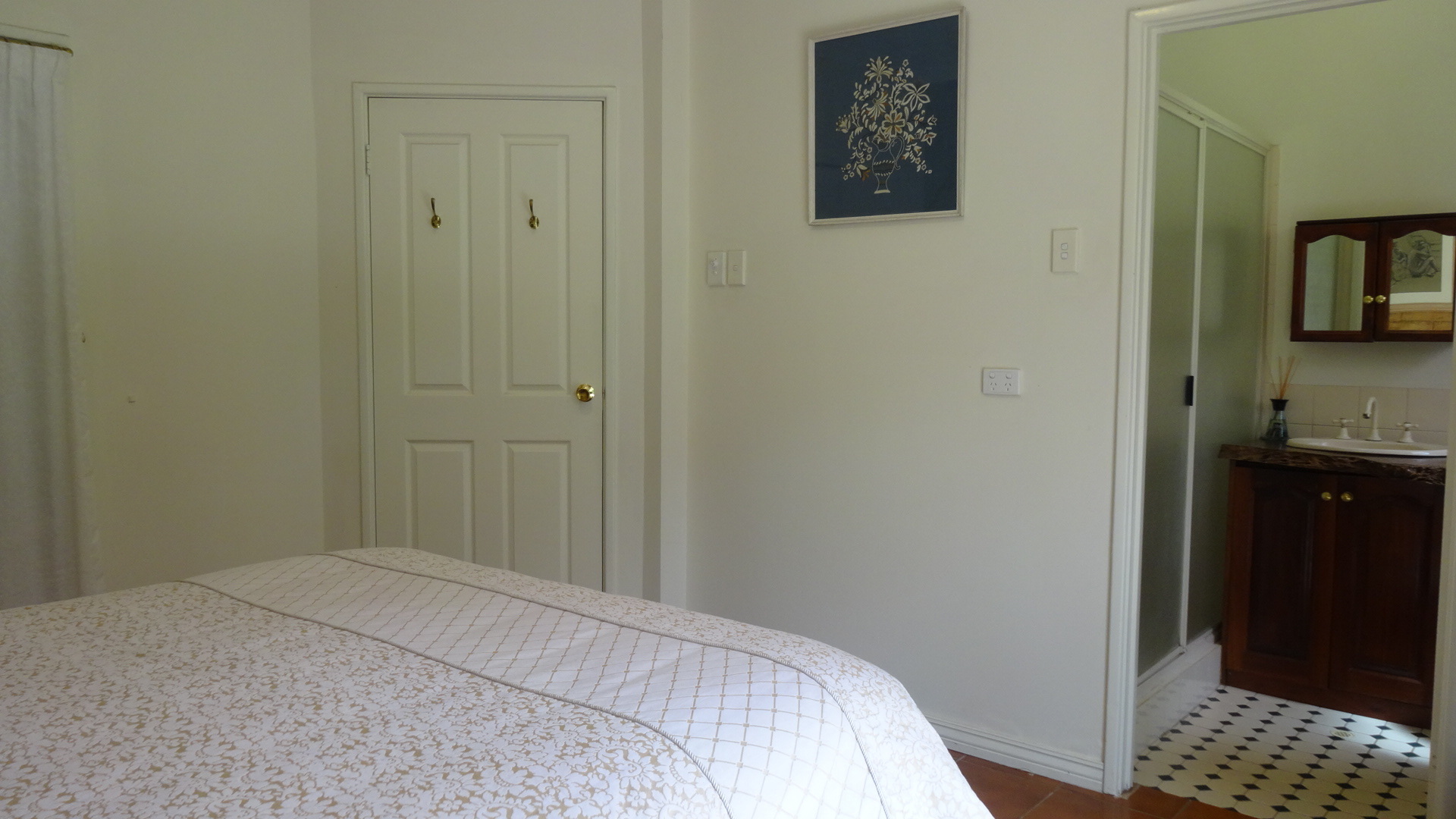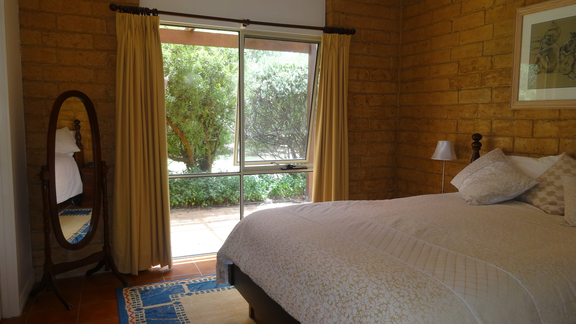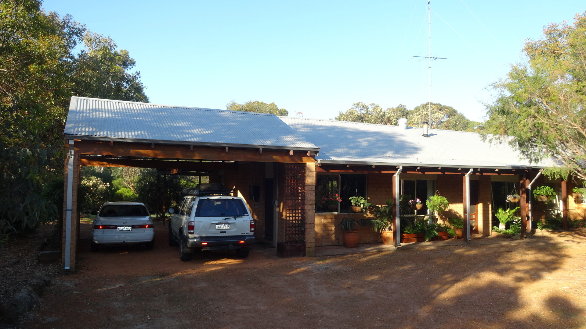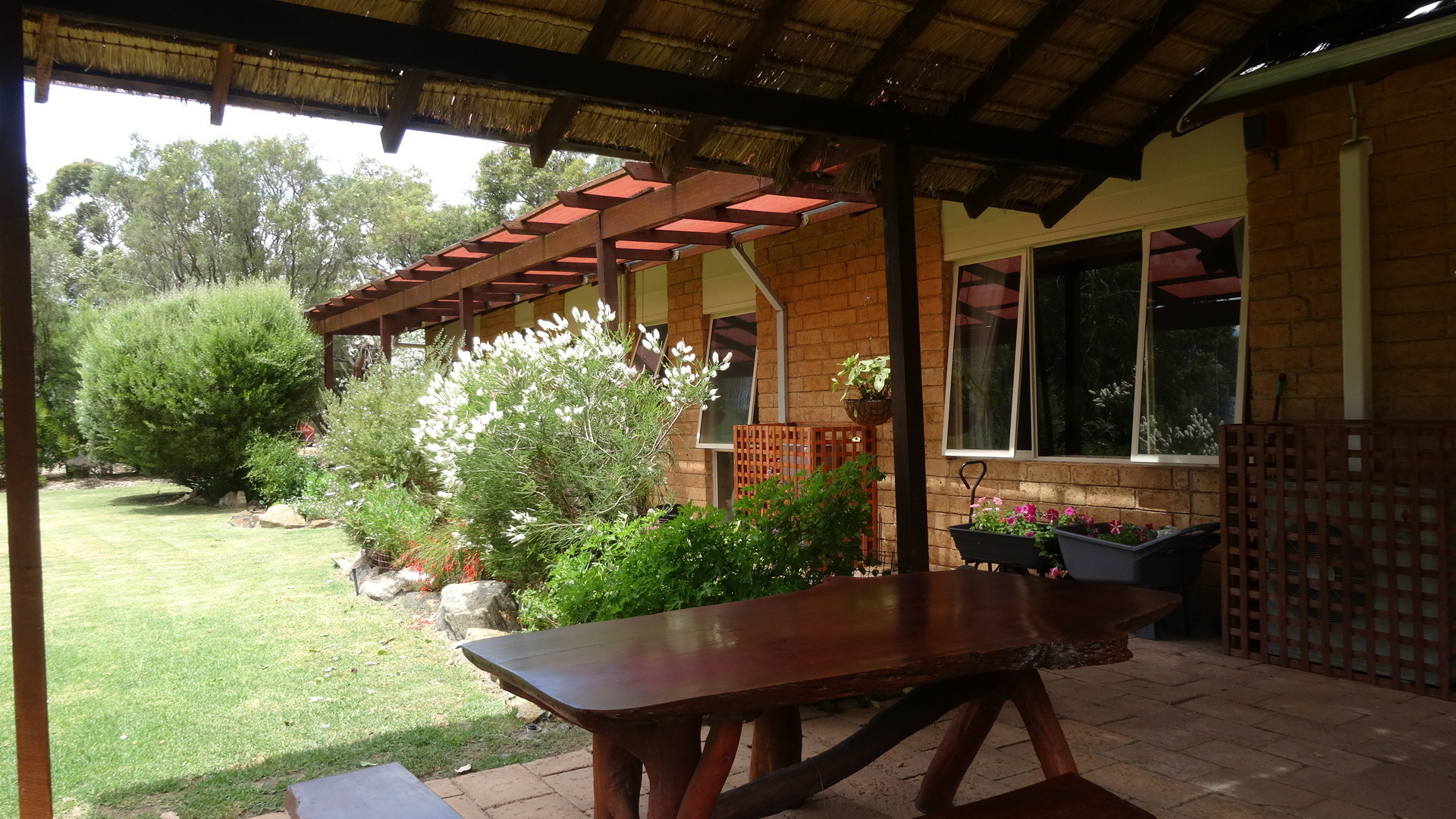 Outdoors, the wide shady verandas and delightful thatched pergola ensure many lazy hours spent soaking up the ambience of the bush and native garden setting. The thick rammed earth walls and abundance of well established shade trees make this a cool haven in the warmer weather.