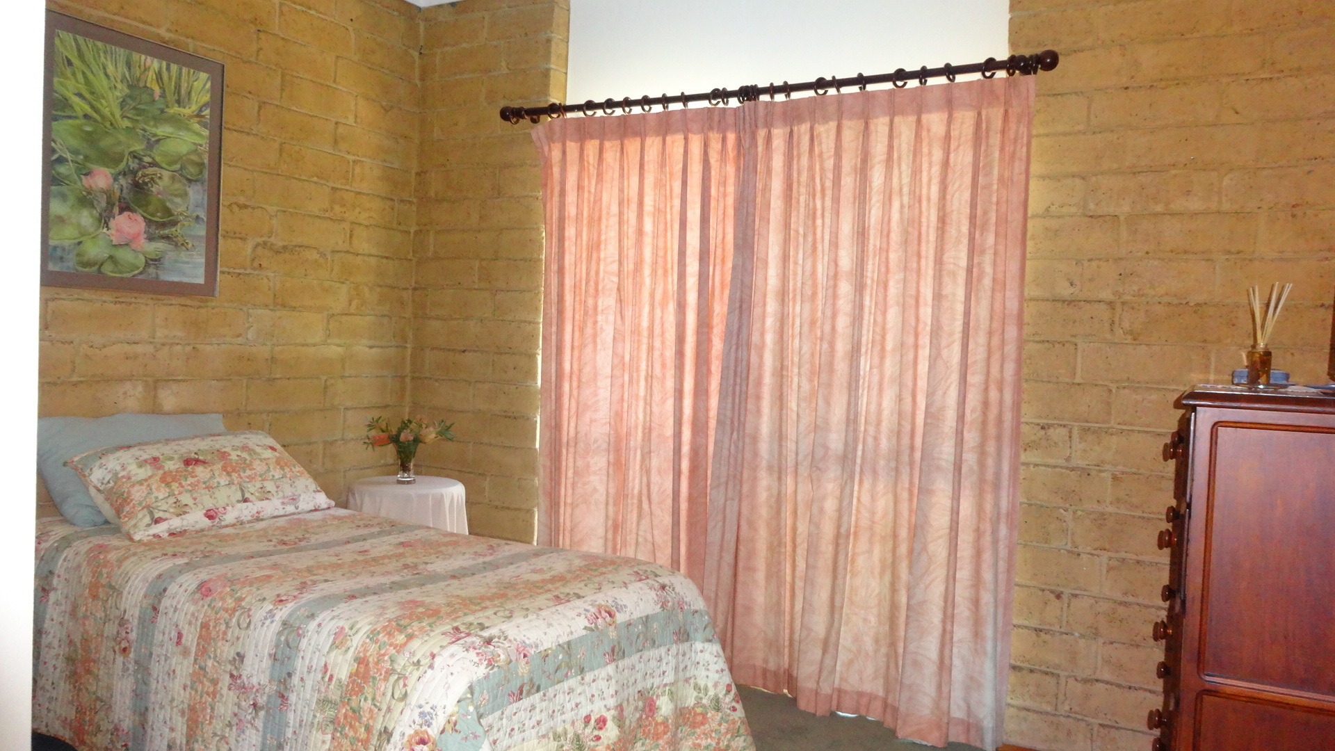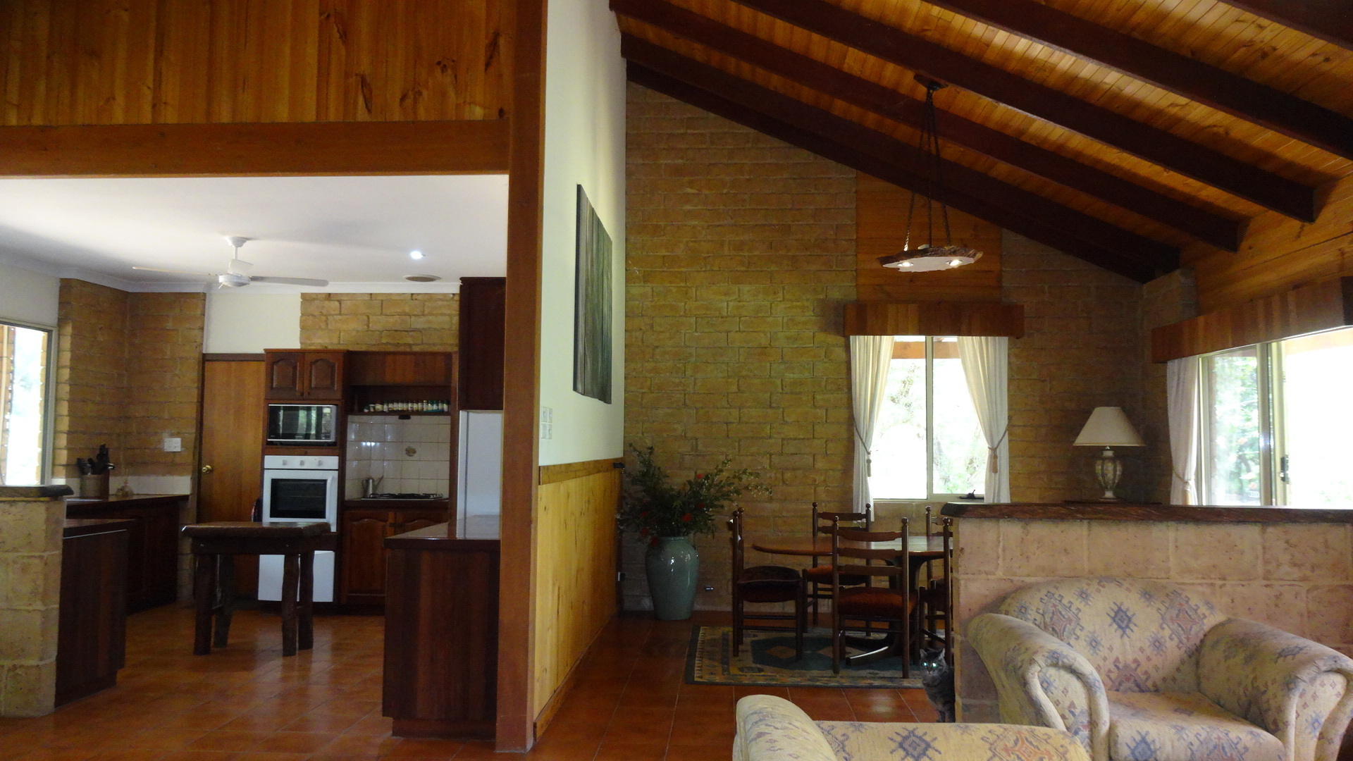 The house is solidly built from attractive Donnybrook rammed earth blocks with cathedral ceilings of pine and jarrah beams. This is a lovely secluded home on 1.21 acres (4890sqm) with a large open plan living area complete with ceiling fans, wood heater and R/C A/C.