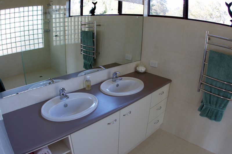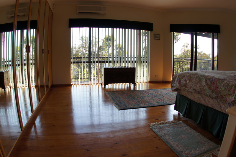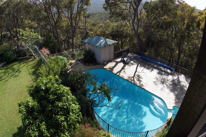 A jarrah staircase leads to the mezzanine floor and the Grand Executive Suite comprising master bedroom, lounge and office area with en suite and separate toilet. Doors lead out to the spacious upper deck where the views are stunning over the garden, pool and valley.