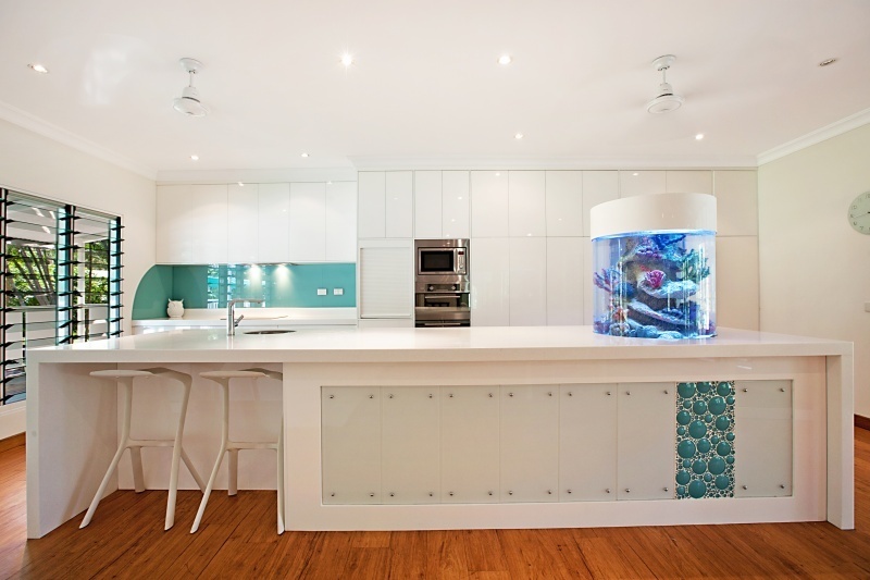 Inside you greeted by a premium kitchen plus dining area (18 months old). Features include 6.6 metres of corian work surfaces, two-pack white cabinetry, electric soft-close drawers, breakfast bar and quality stainless steel appliances including induction hob, double oven, microwave, Westinghouse fridge/freezer with ice and water dispenser and two dishwashers to ensure clutter-free living. The massive 4.5-metre corian island holds a breath-taking imported cylindrical fish tank which may be utilised for salt or fresh water fishes or run without aquatic life for display only.