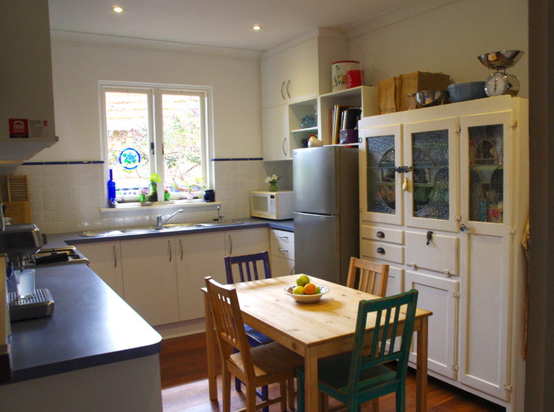 - Renovated kitchen in classic white with sealed jarrah floors, stainless steel stove, splashback and rangehood. Loads of cupboard space, room for dining, and lovely view from window.
