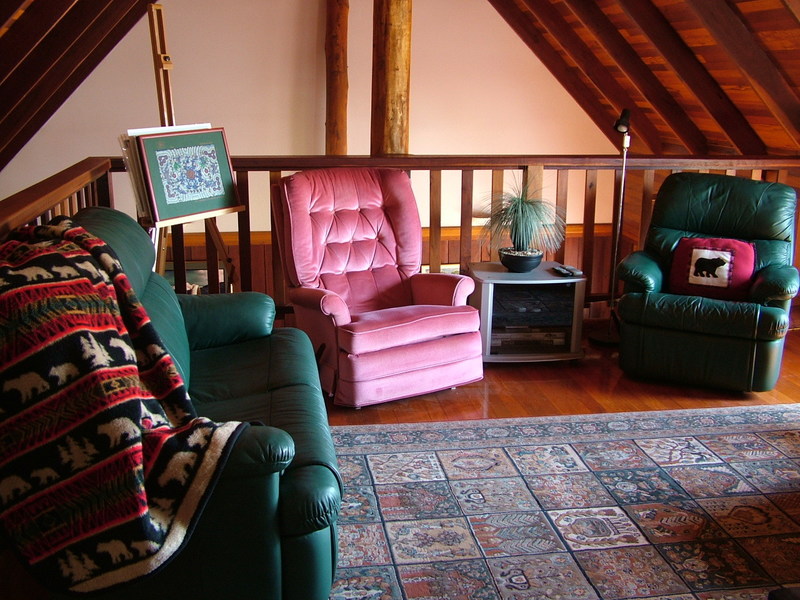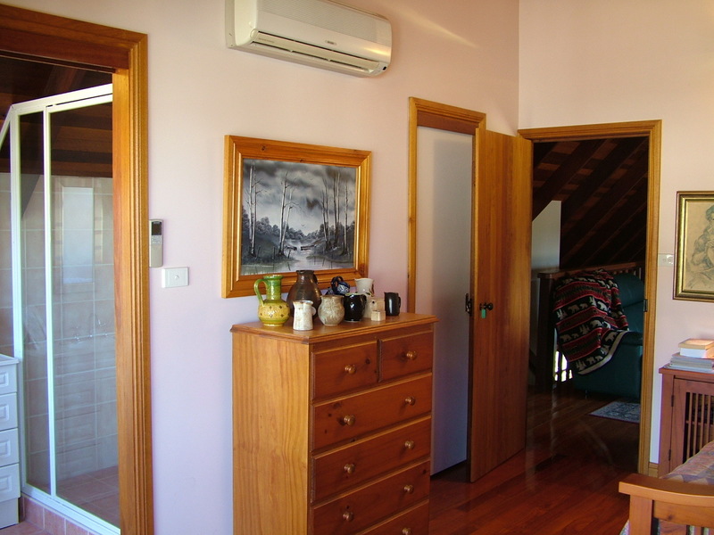 Ironbark half logs were used for the external facade and Australian hardwood for the polished floors inside. The 6.5 metre cathedral ceilings are fitted with polished hardwood lining boards with exposed structural timber beams. The staircase to the loft is made of polished ironbark, while narrow leaf ironbark is used for the external timber decking, handrails and stairs.