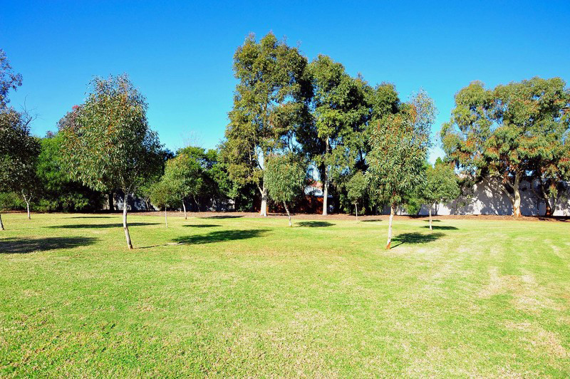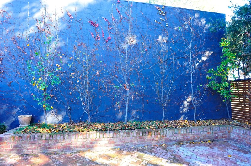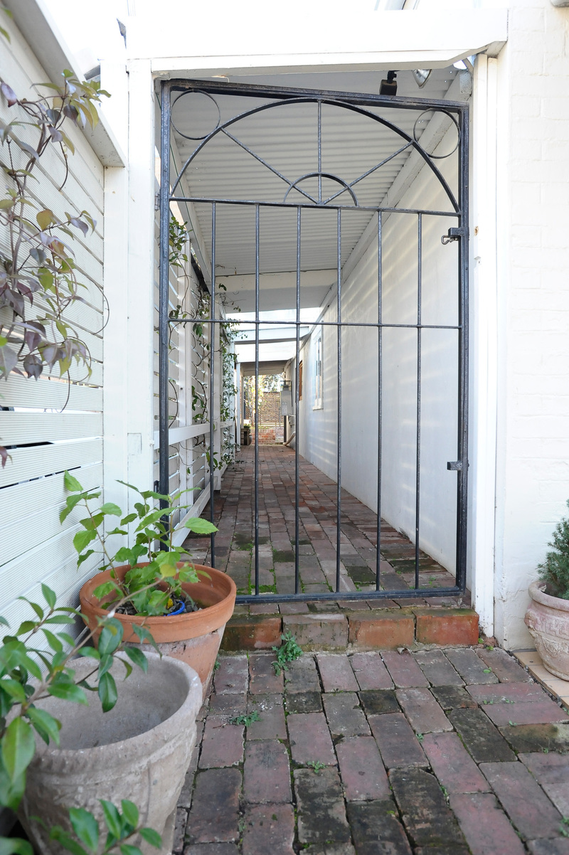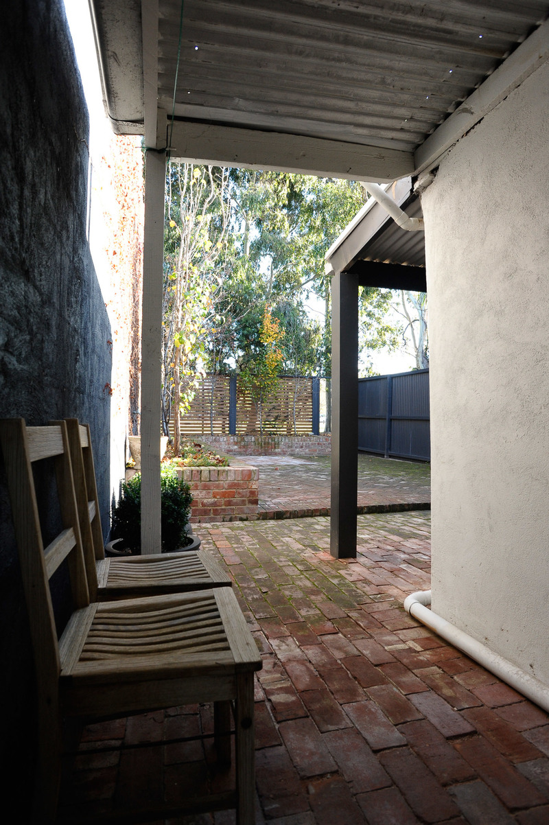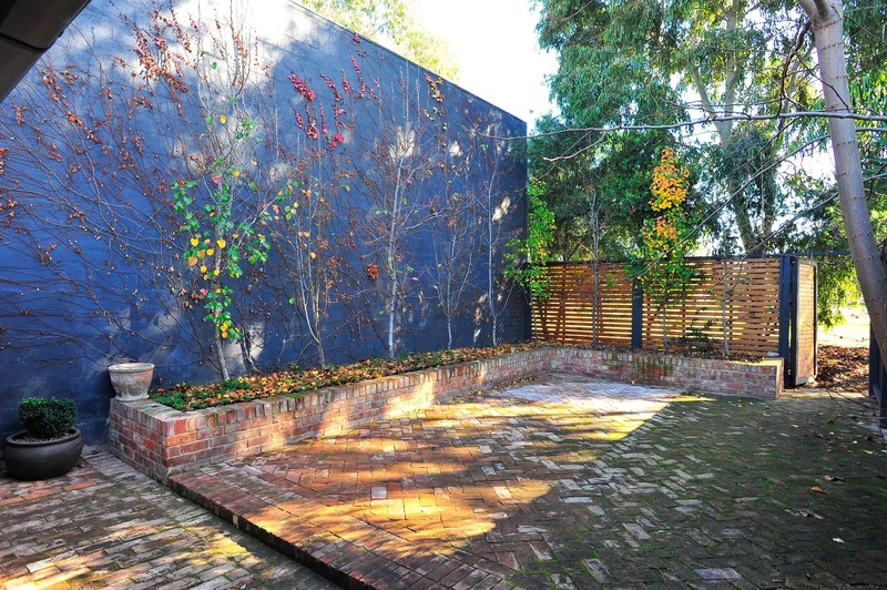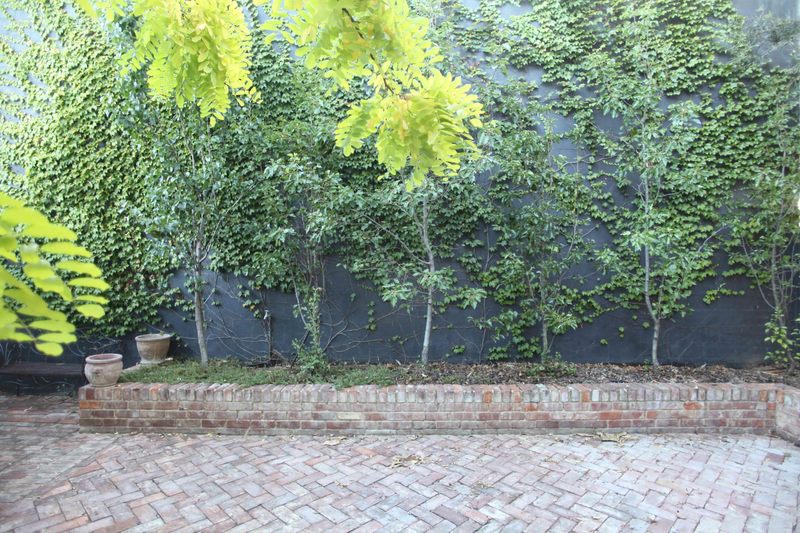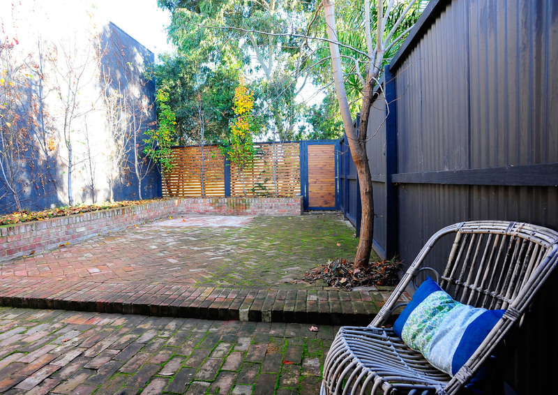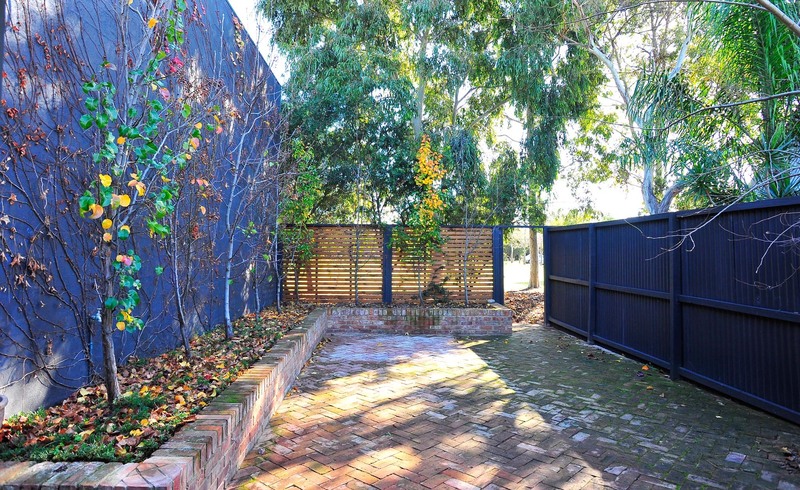 Green, lush, secure & private large rear courtyard with established deciduous trees opens onto quiet parkland.
