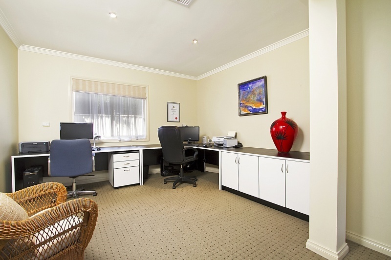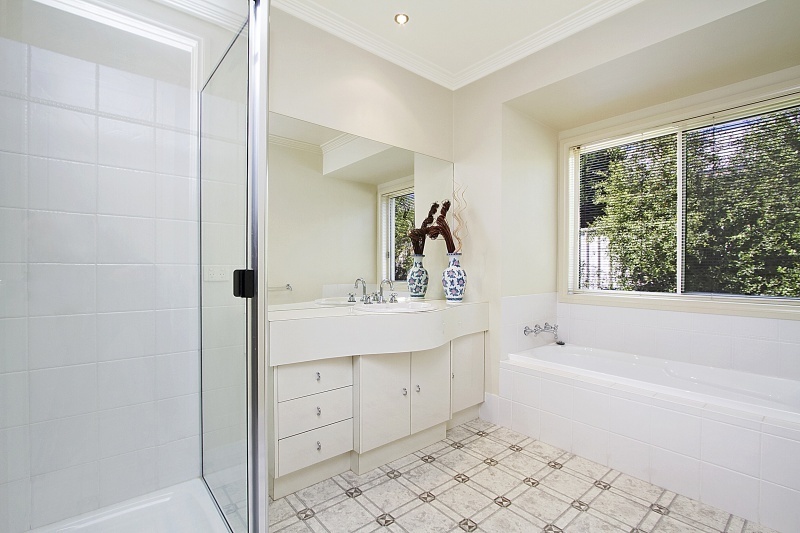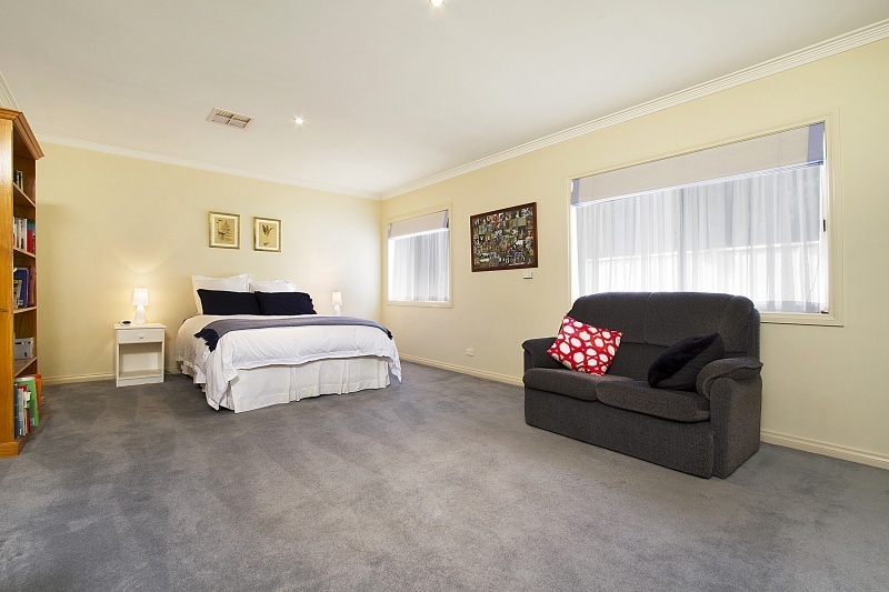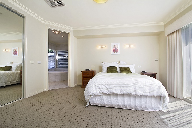 Double doors open into the master bedroom which has a walk in robe, fully tiled opulent ensuite with corner spa overlooking a formal garden and a separate toilet with a glass brick feature wall. The second bedroom is huge and could easily be used as a self-contained teenager's or granny's retreat, or even converted back into two bedrooms as in the original floor plan. A wall of built in robes provide extensive storage. The third bedroom, also with built in robes, is large enough to accommodate a double bed and desk. A separate toilet and handbasin sit next to the spacious main three-piece bathroom.