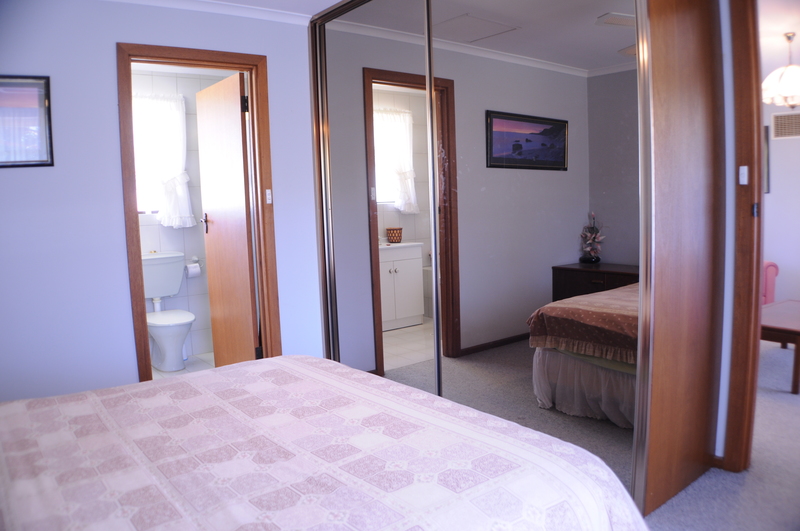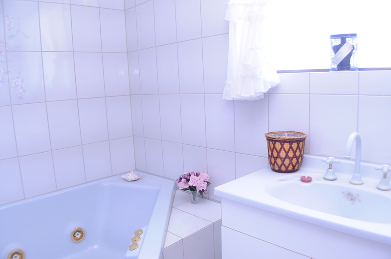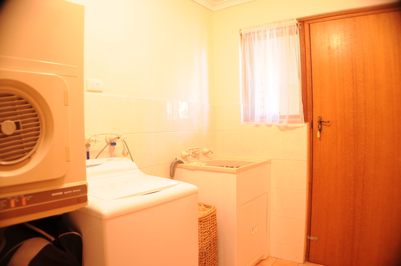 An updated bathroom with heat lamps, separate toilet and laundry with built in cupboards and additional cupboards in the hallway.