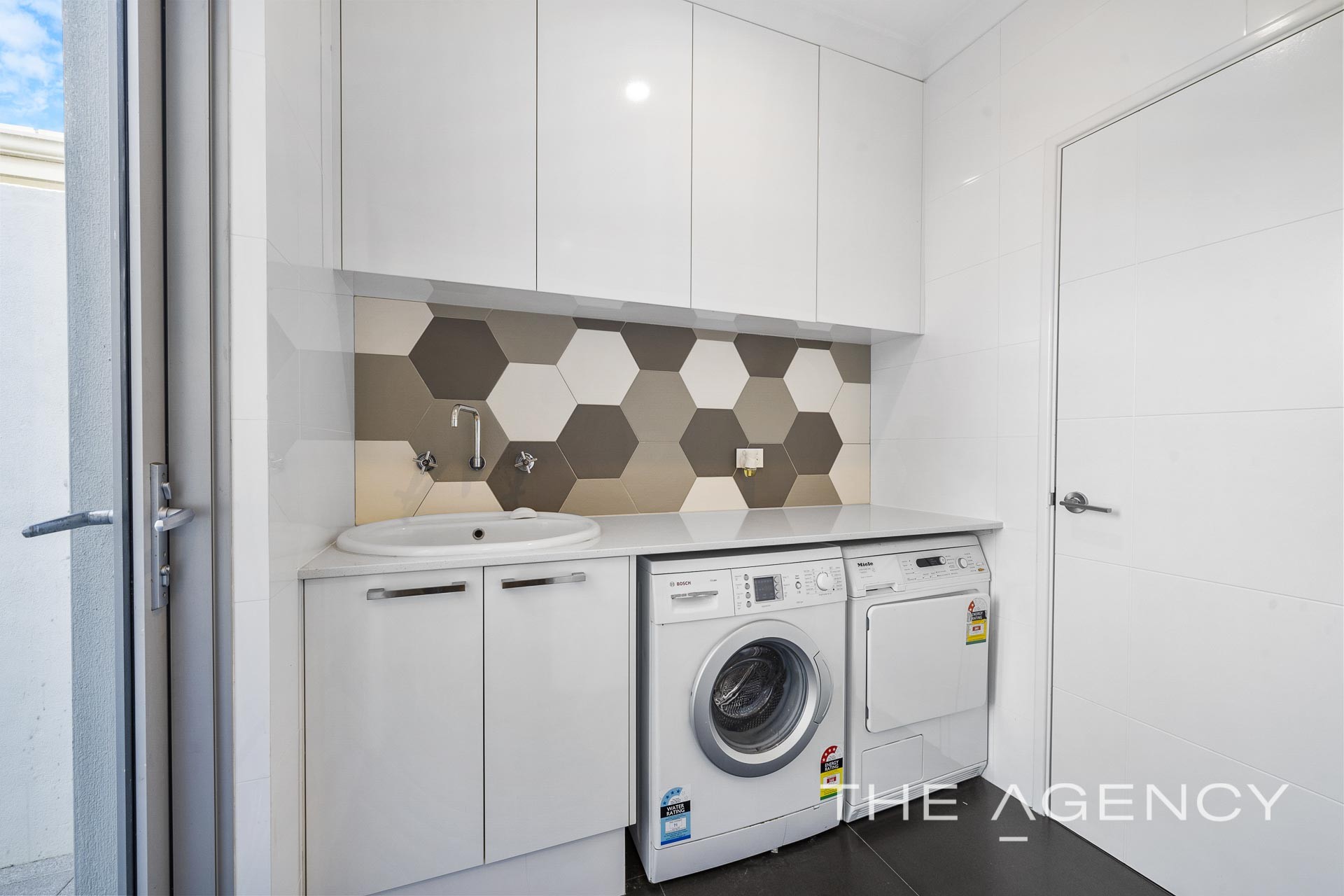 - Laundry with full height overhead cabinets and stone bench top