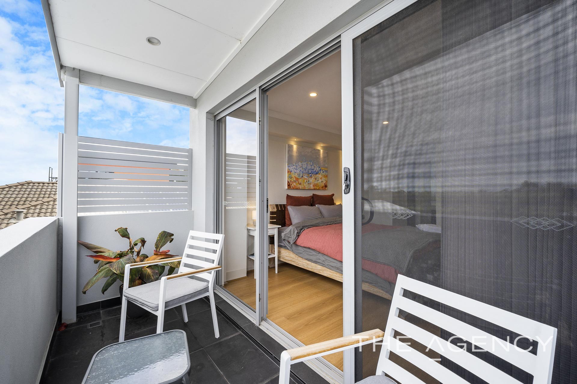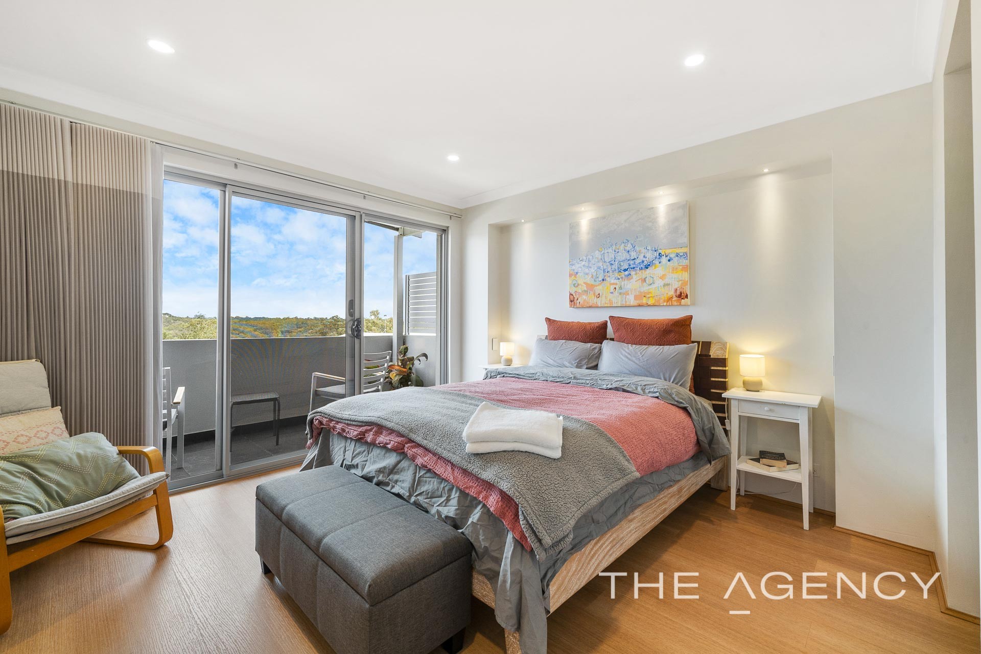 The master bedroom is like entering a hotel suite and is finished with a recessed feature wall including LED down lights and His and Hers walk in robes with built in cabinetry. The tiled balcony is the place to watch sunsets or enjoy the river and city skyline views. There is a private ensuite that boasts a double vanity, stone bench tops, temperature-controlled HWS and an electric roller shutter to the window.