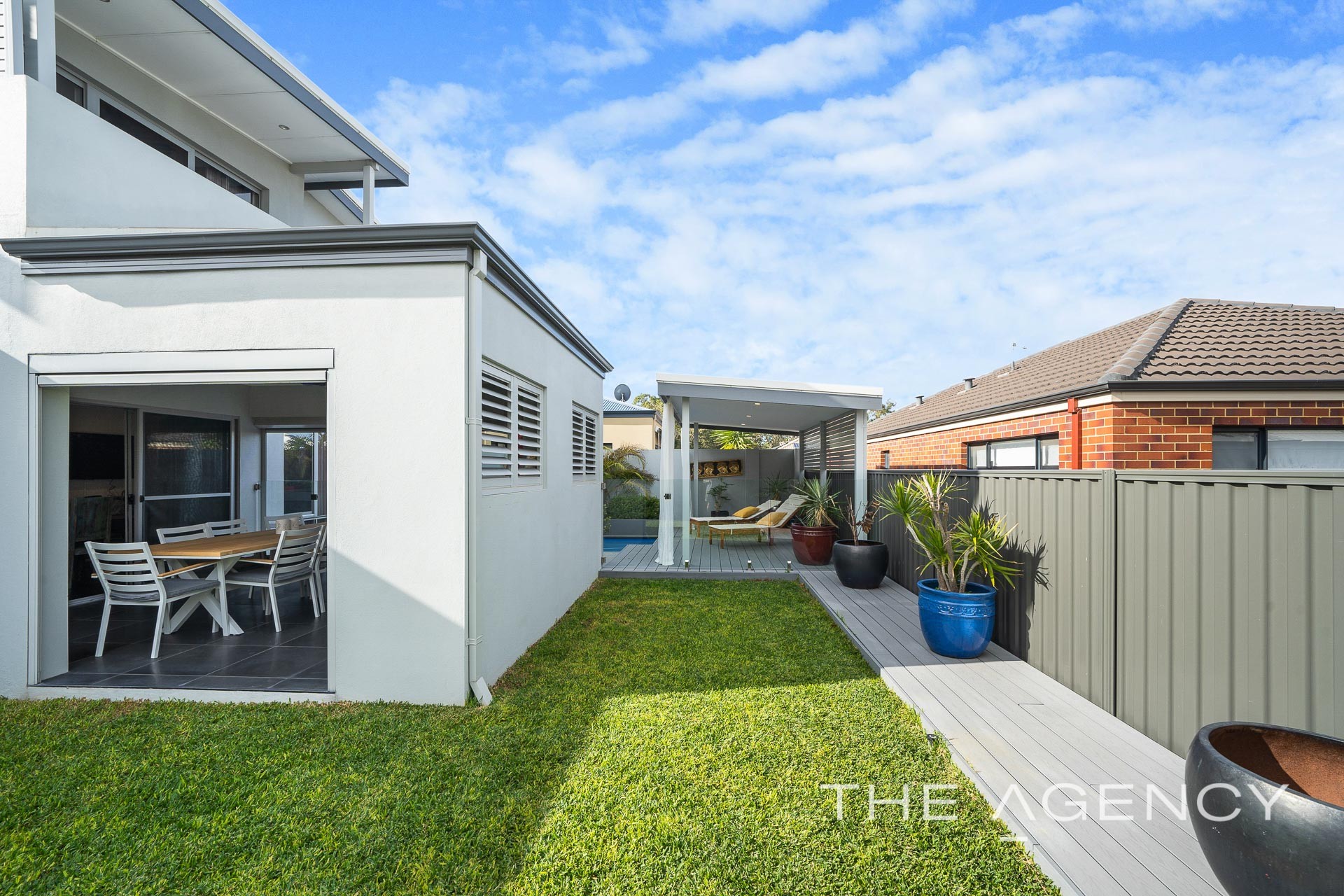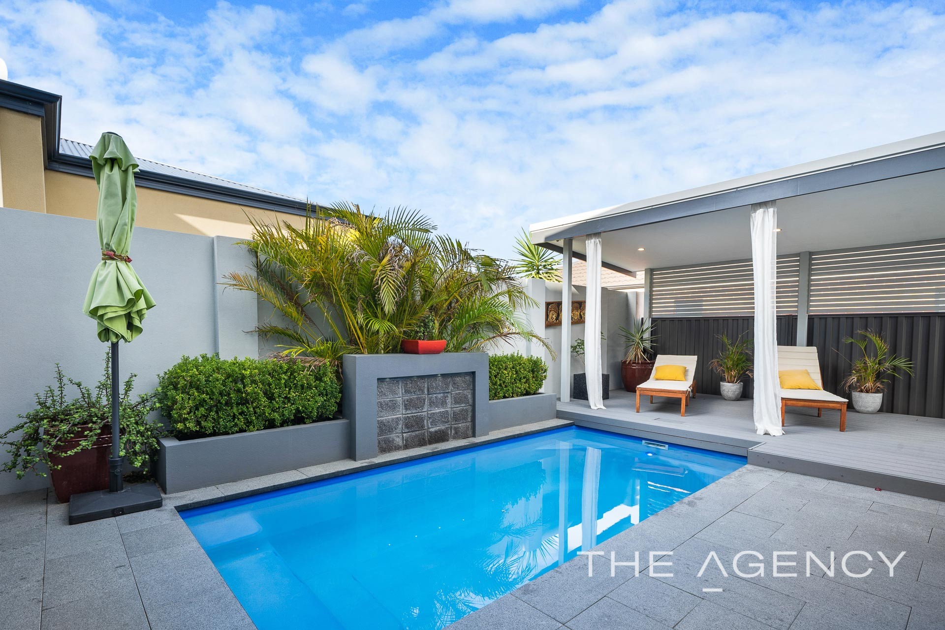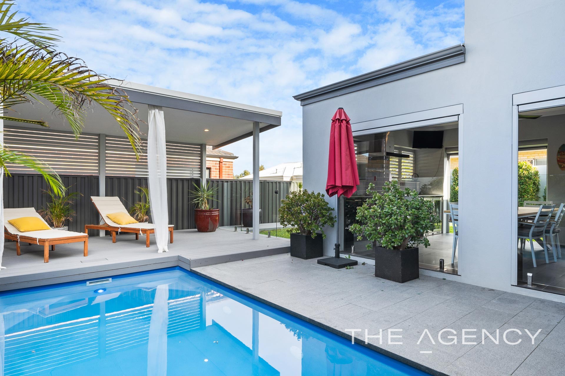 Relaxation and entertainment central is the alfresco at the rear which is complete with an outdoor kitchen including stone bench top, built in BBQ (plumbed to main gas), range hood, under mount sink and for your complete comfort, there is a ceiling fan, electric roller blinds, aluminium louvres plus Bluetooth speaker system. Behind the glass fencing is a beautiful family pool with blade water feature and feature lighting while the separate patio has maintenance free composite decking.