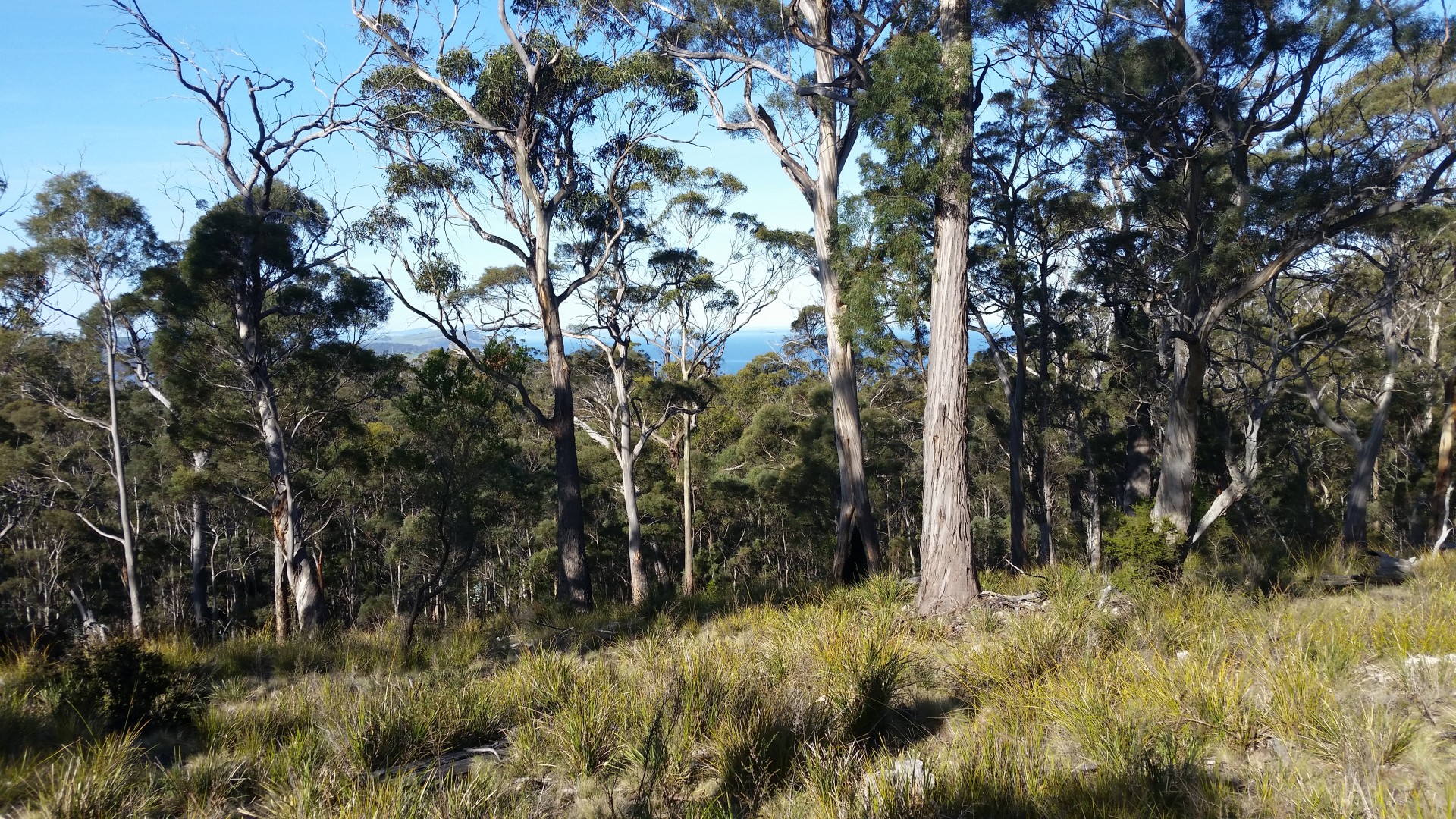 Sea glimpses through the trees.