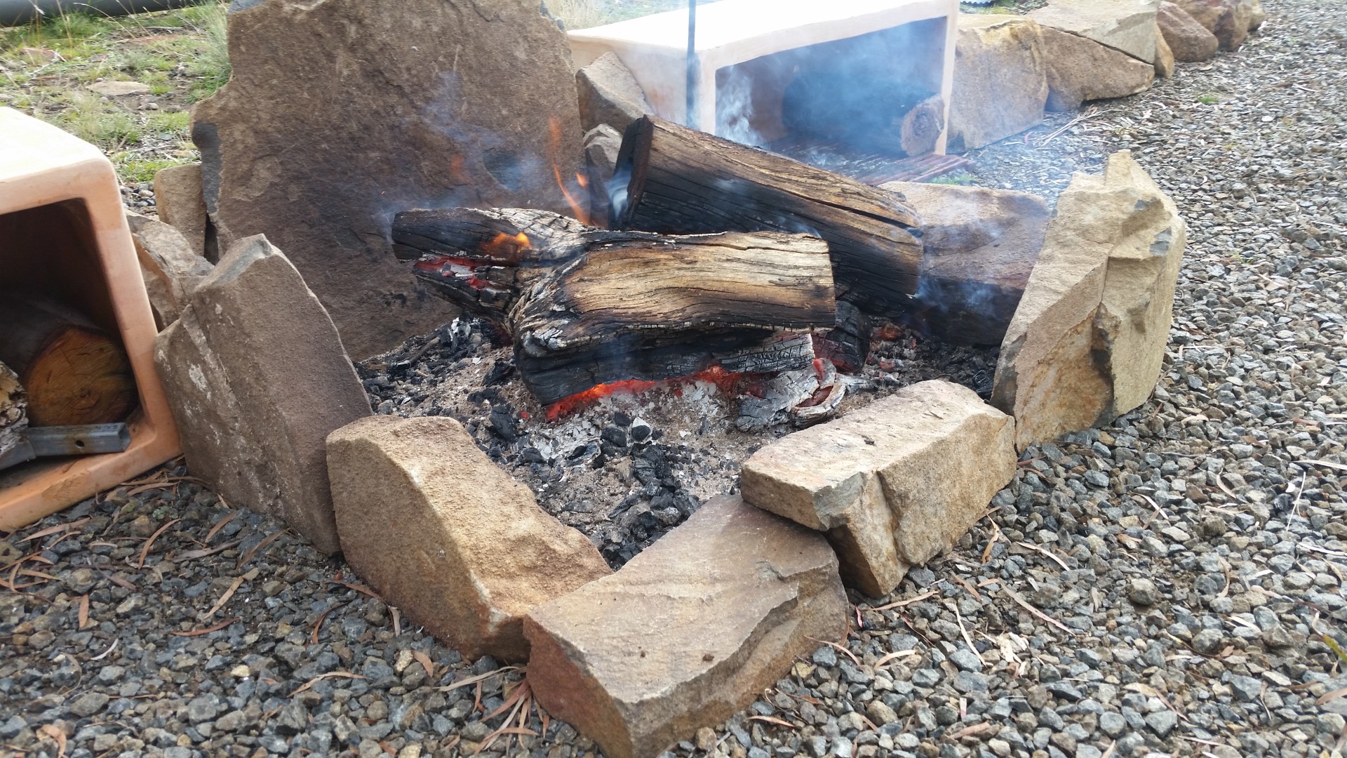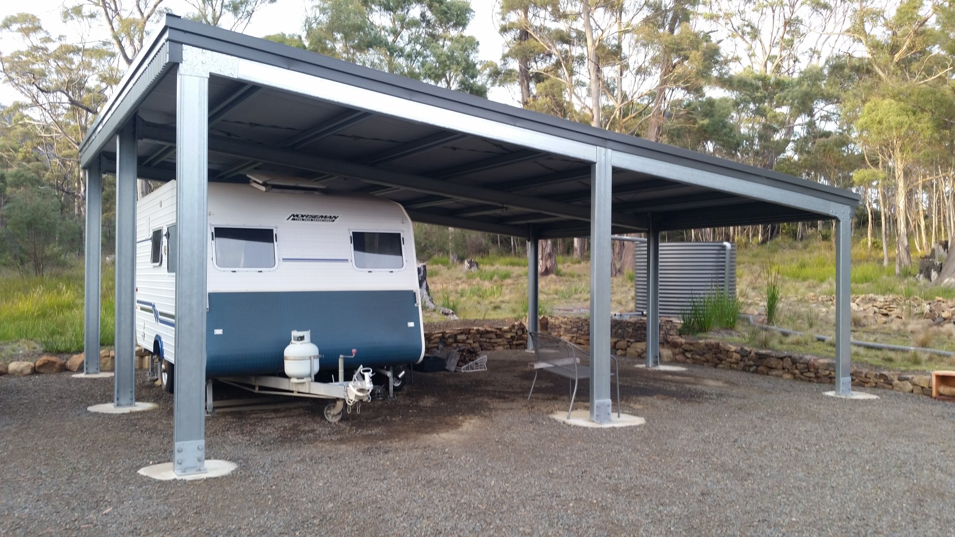 A clearing with a caravan under a steel double carport provides accommodation and a 5,000 litre tank collects rainwater.
