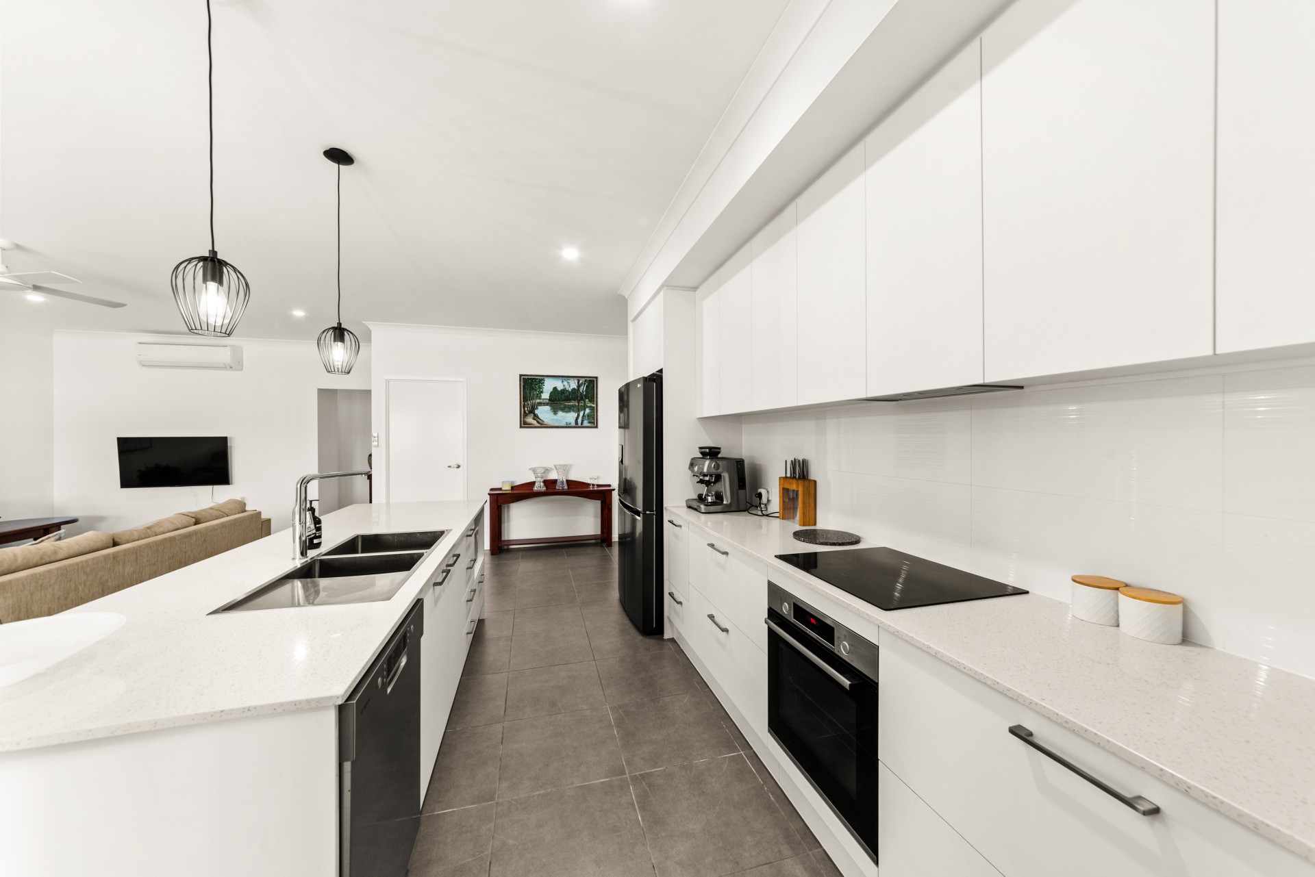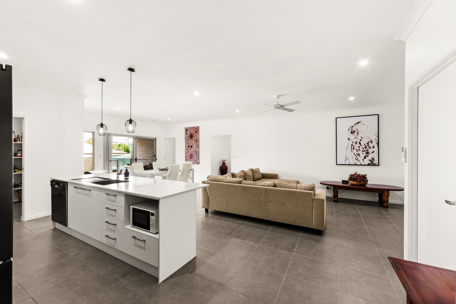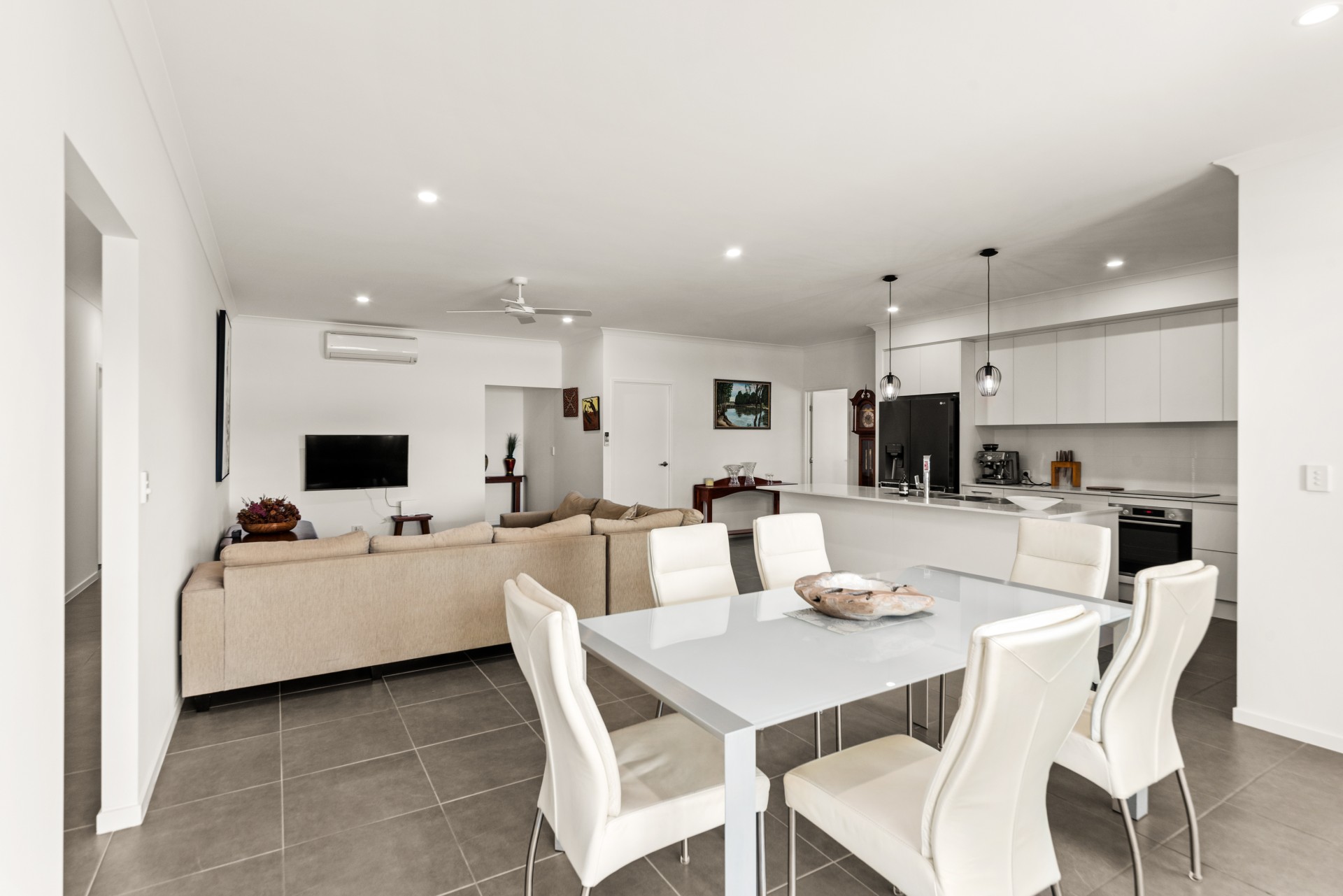 Tiles throughout the open plan living, dining and kitchen area with 2.7m high ceilings make this large home look and feel spacious.