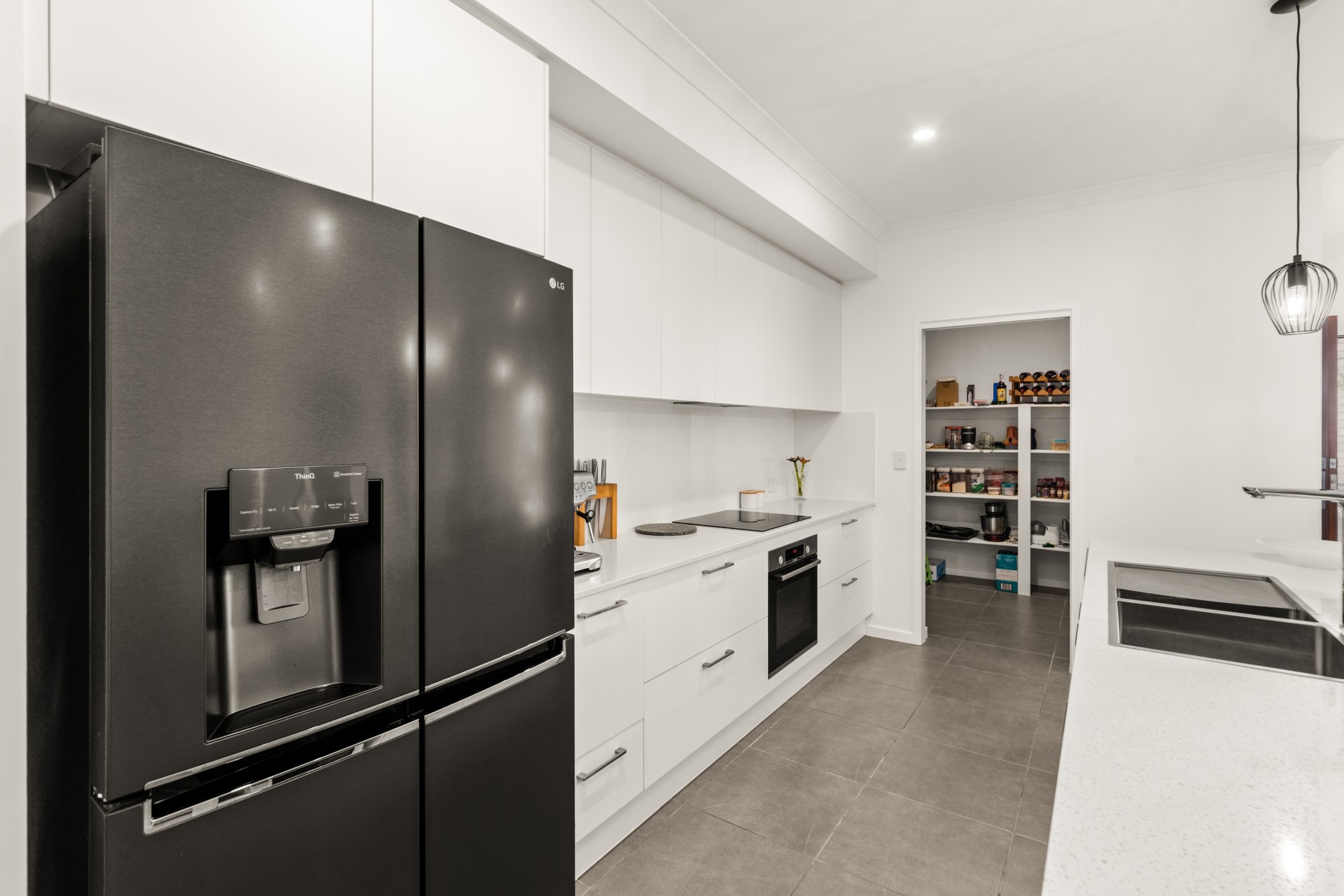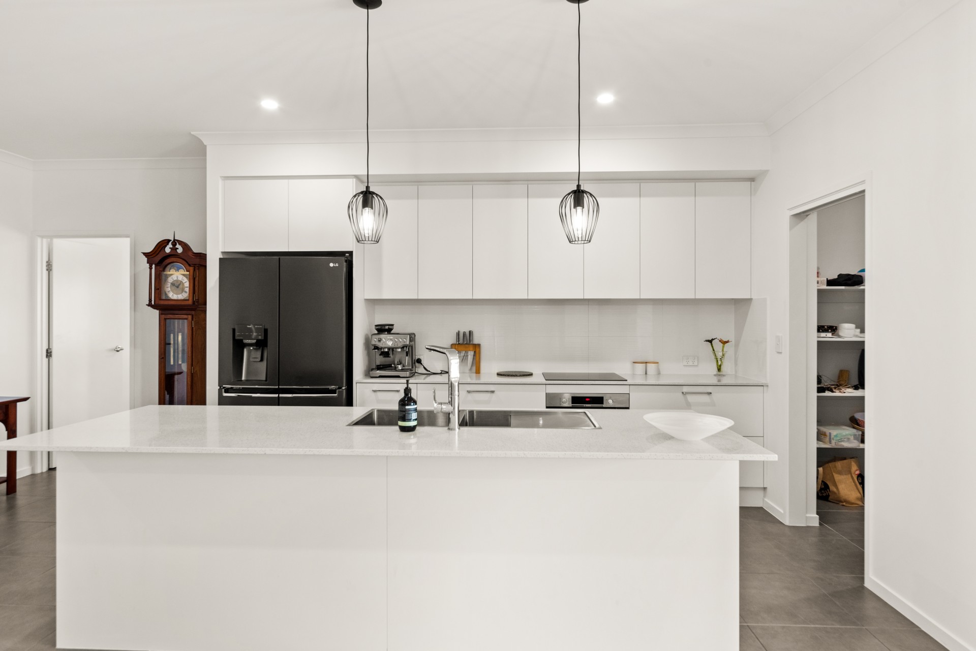 The kitchen has a Santorini stone benchtop, and Bosch appliances including an induction cooktop, pyrolytic oven and dishwasher. Large walk-in pantry with ample shelving.