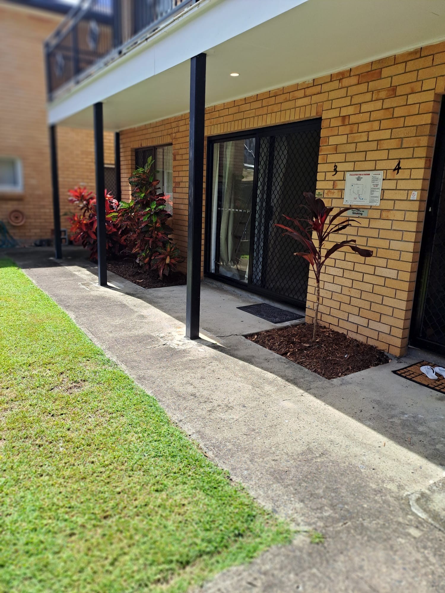 * Looking out onto a well-maintained grassed area and lovely garden with a high colour bond