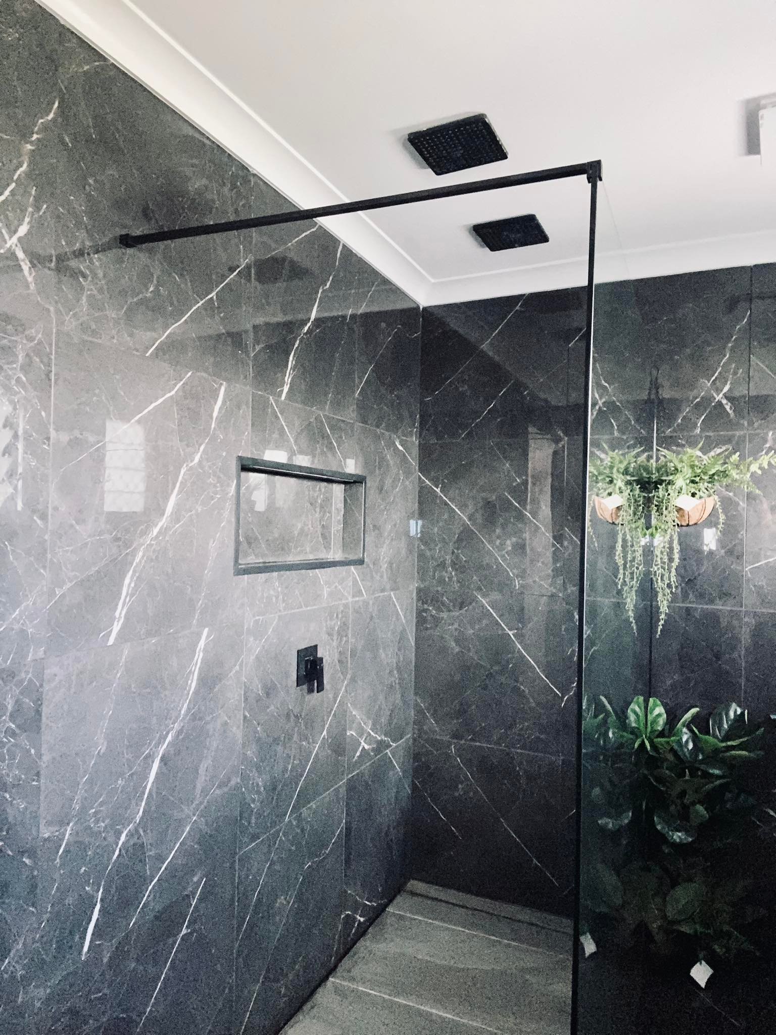 - Large eye-catching modern bathroom with dual-headed walk-in shower and new hands