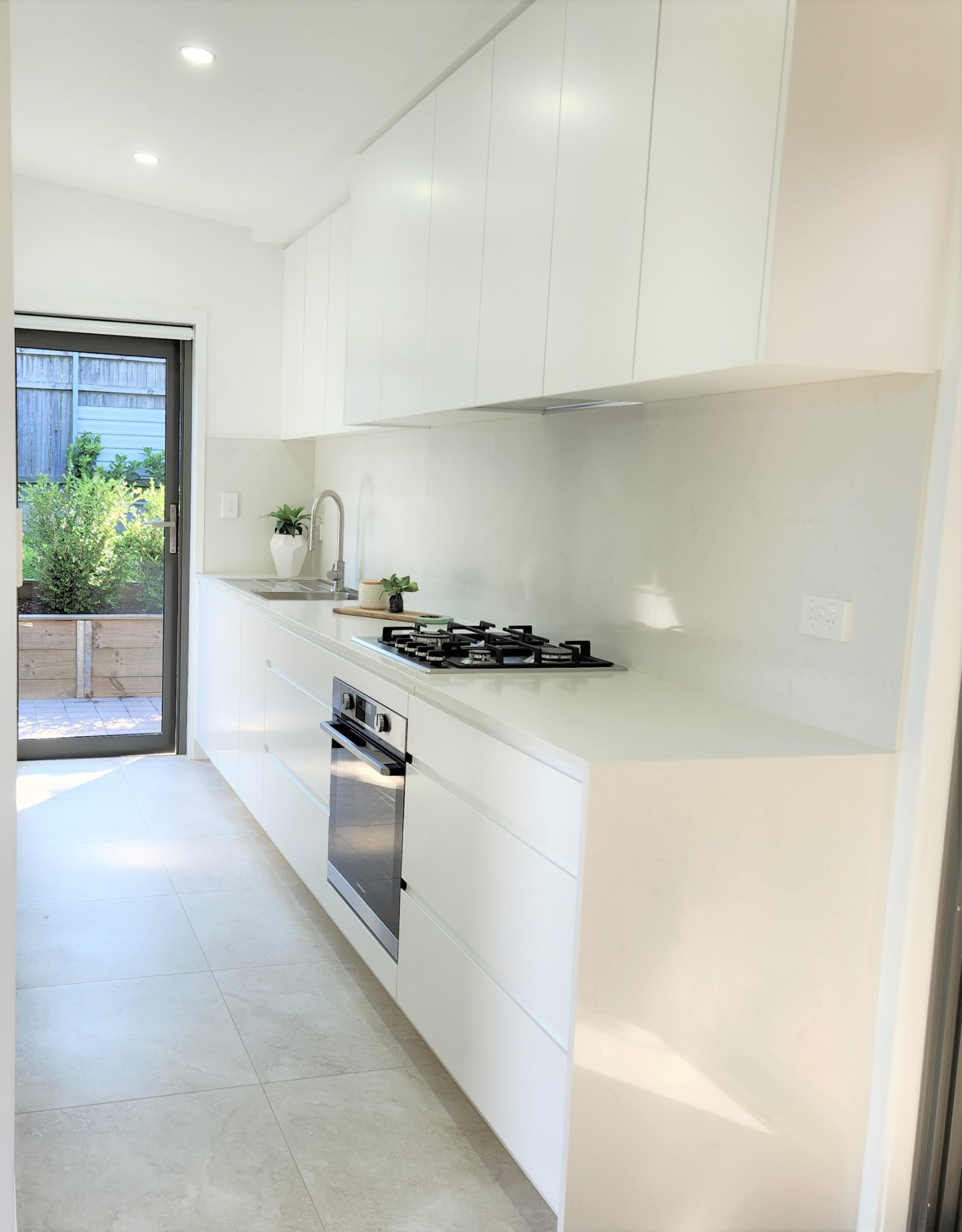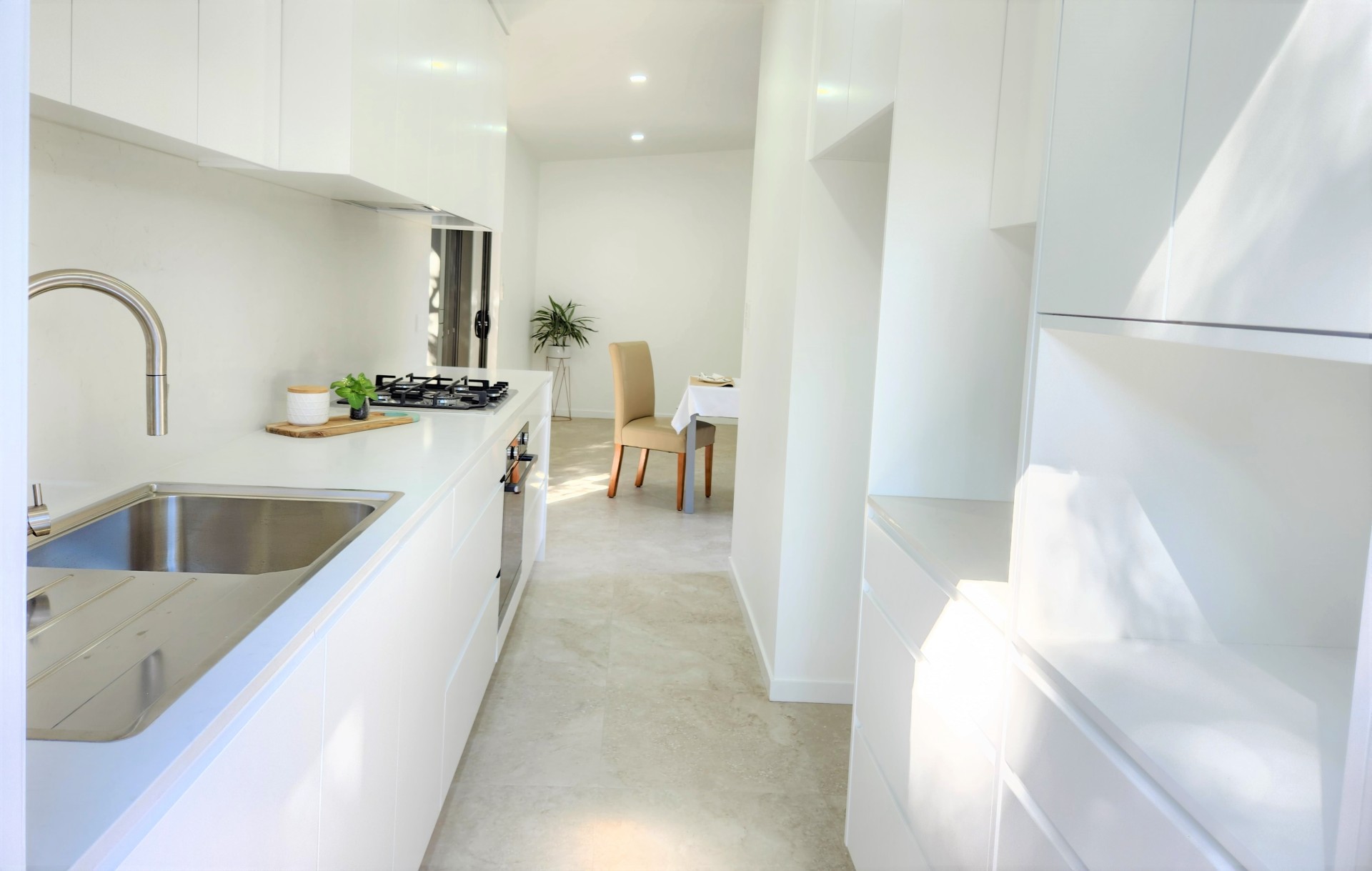 - Modern gallery kitchen, with Caesarstone benches, gas cooking, dishwasher and house-sized storage.