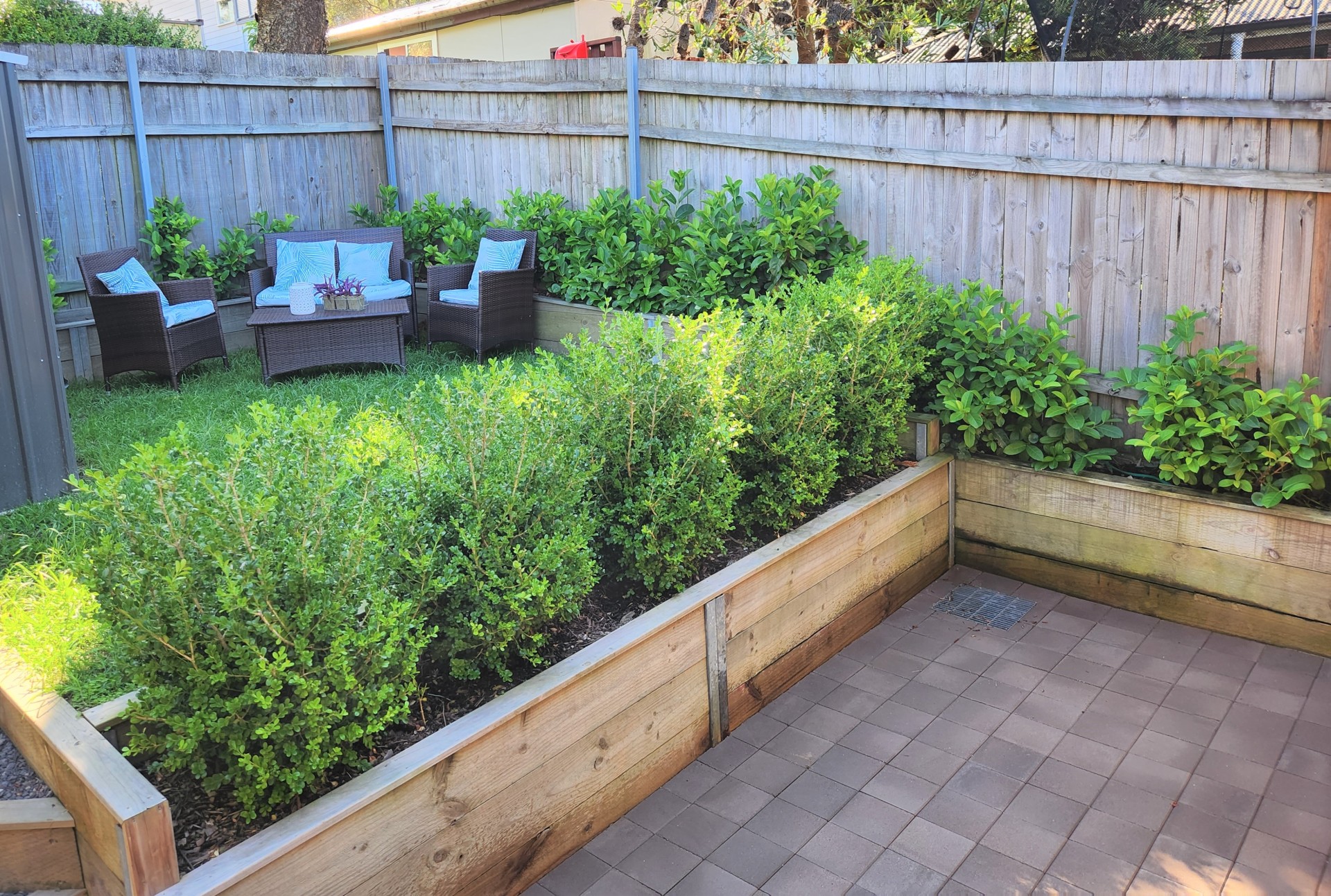 - Private courtyard with paved and grass areas surrounded by lush greenery.