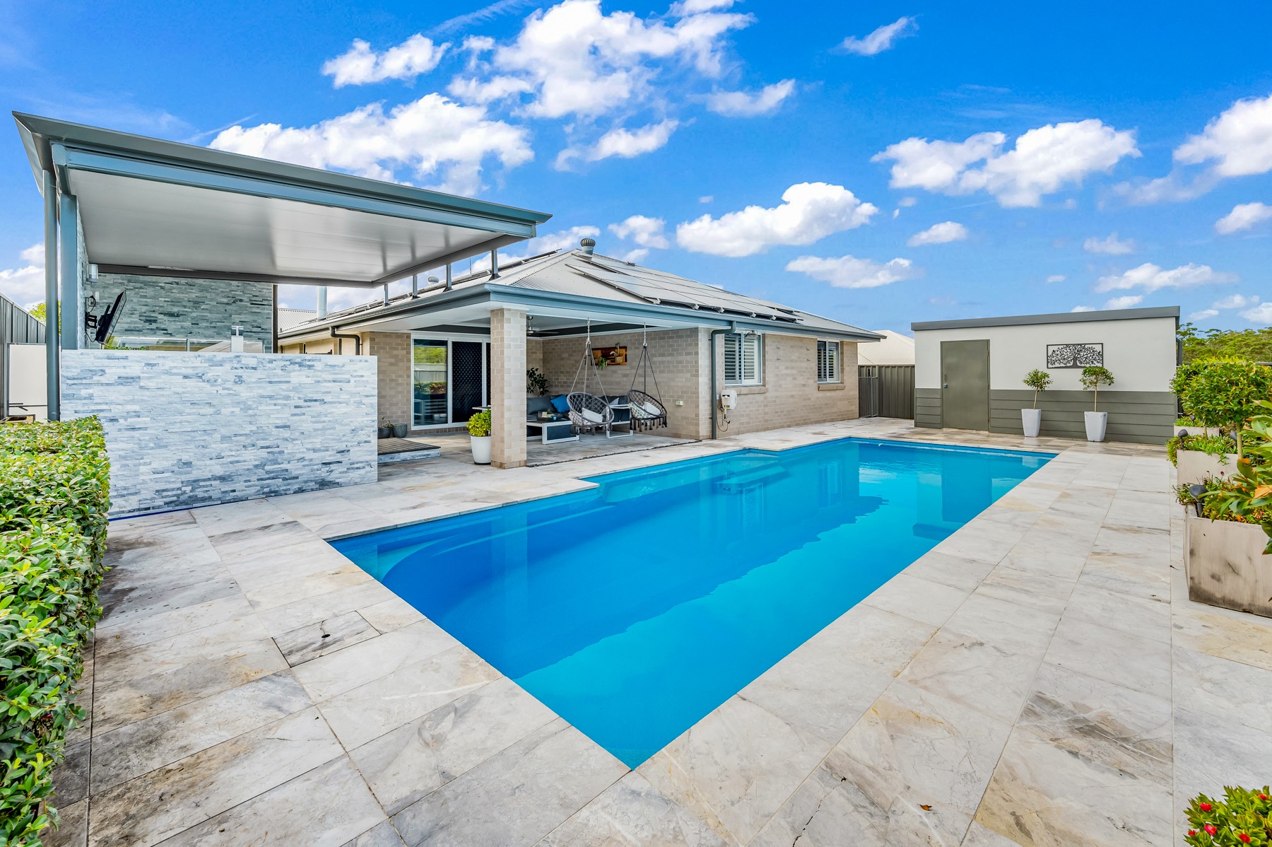 This spacious entertainer's home in the sought after estate of Watagan Park offers a home ready to move into with nothing more to do but relax, enjoy and entertain in resort style. Accommodation comprises a triple garage, plenty of parking in driveway for 4 cars, street parking, and drive through access to the backyard. Spacious 4 or 6 bedroom home, open plan living and dining that flows effortlessly to a private entertainers resort. With a 10m x 4.5m swimming pool surrounded by sand blasted marble pavers, a handcrafted BBQ entertaining area lined with insulated walls for sound proofing, quartz stack stone feature wall throughout entire deck area, with built in natural gas BBQ, cupboard space, bar fridge, and wall mount for a TV.