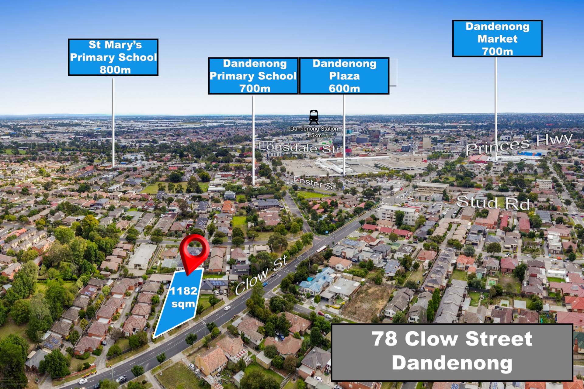 • Schools: Dandenong Primary School (0.35 km), St Mary's Primary School (0.57 km), Maranatha Junior School Doveton (1.14 km), Holy Family School (1.36 km), and Dandenong North Primary School (1.38 km).