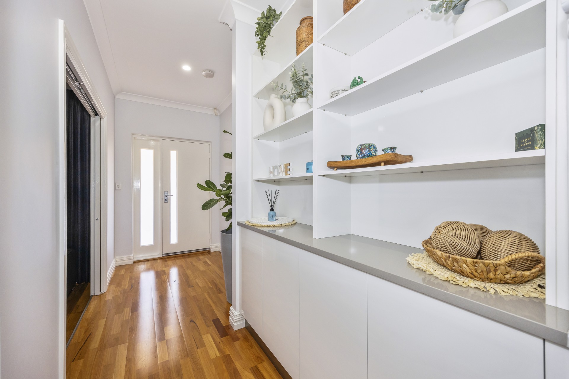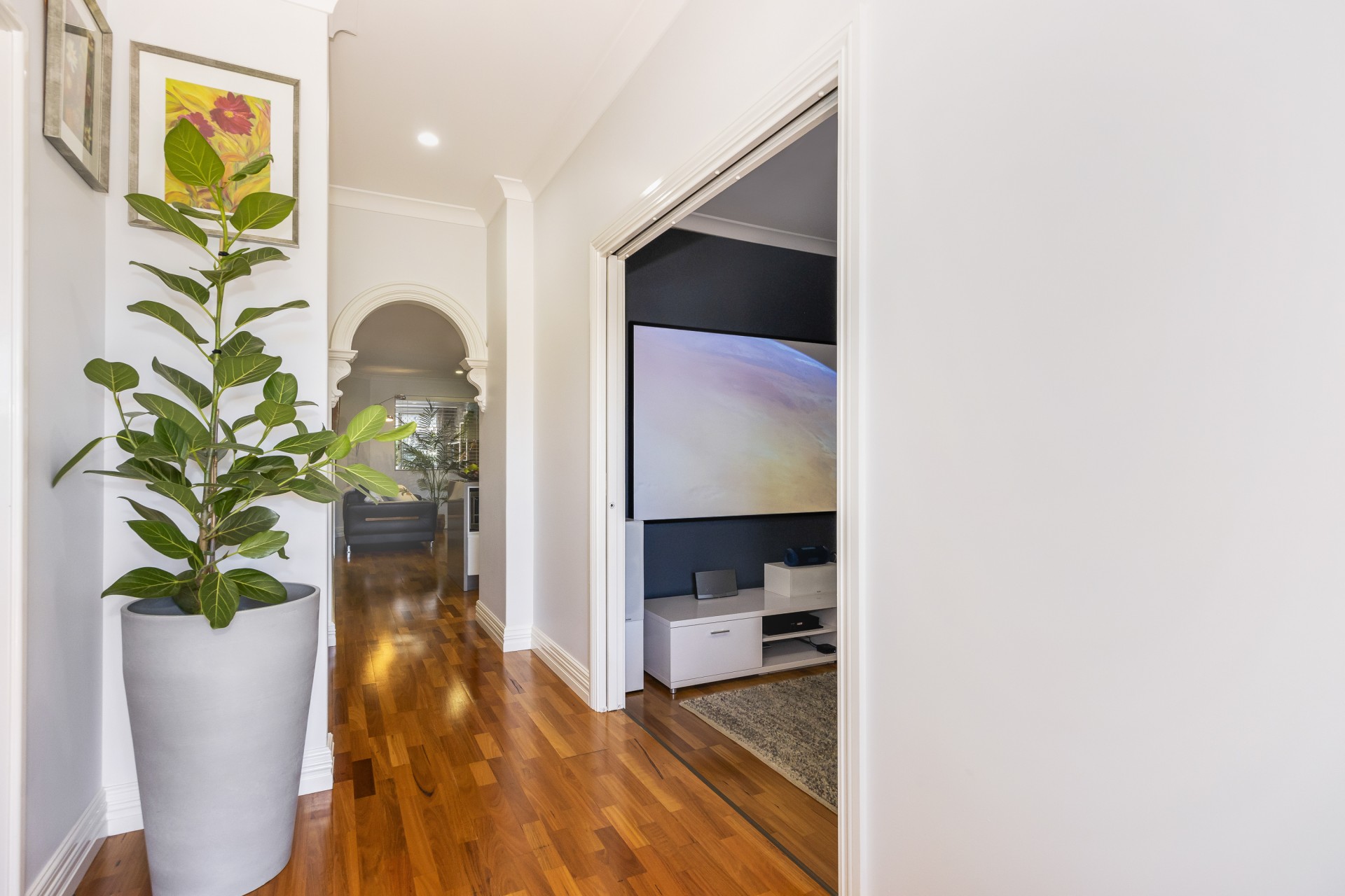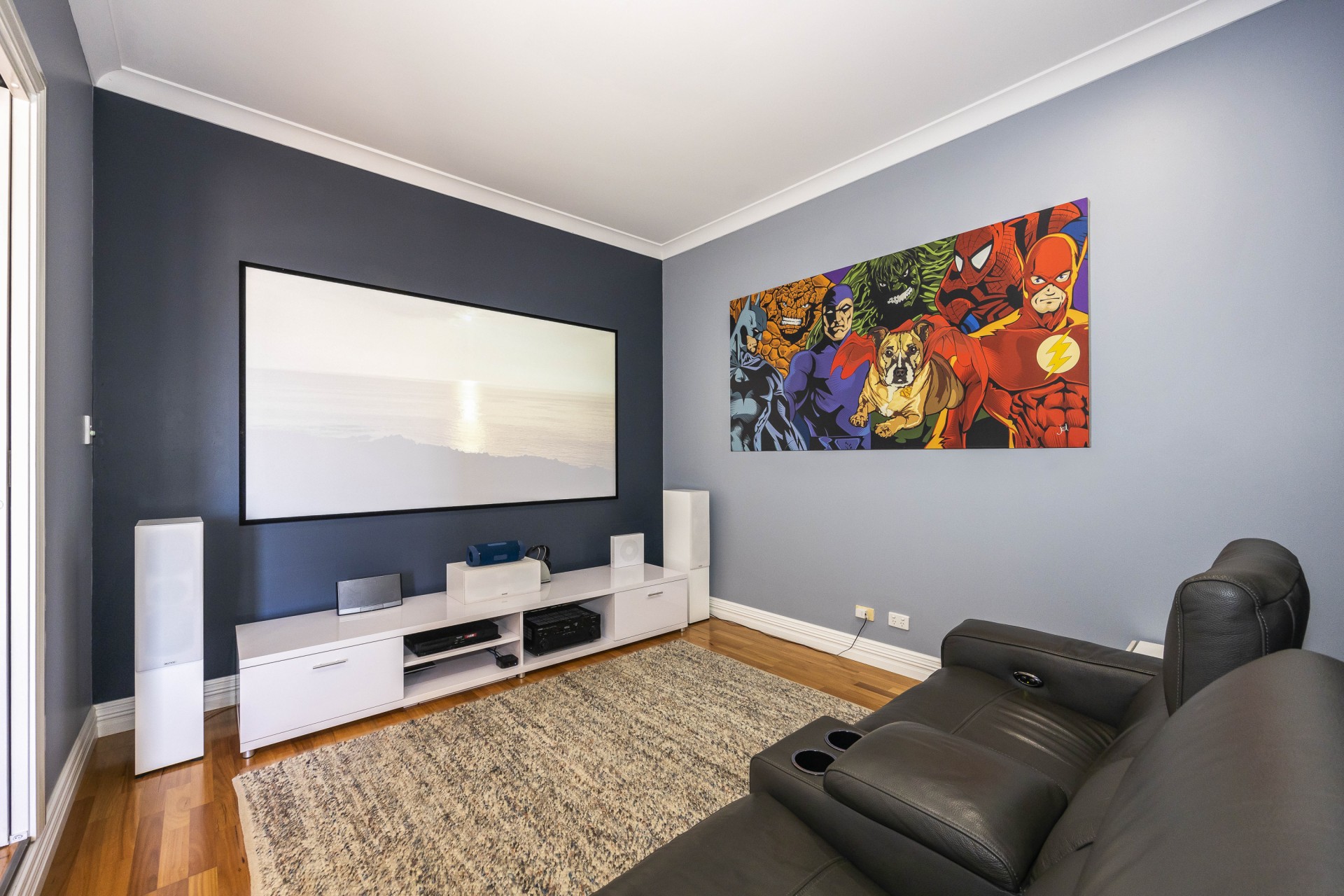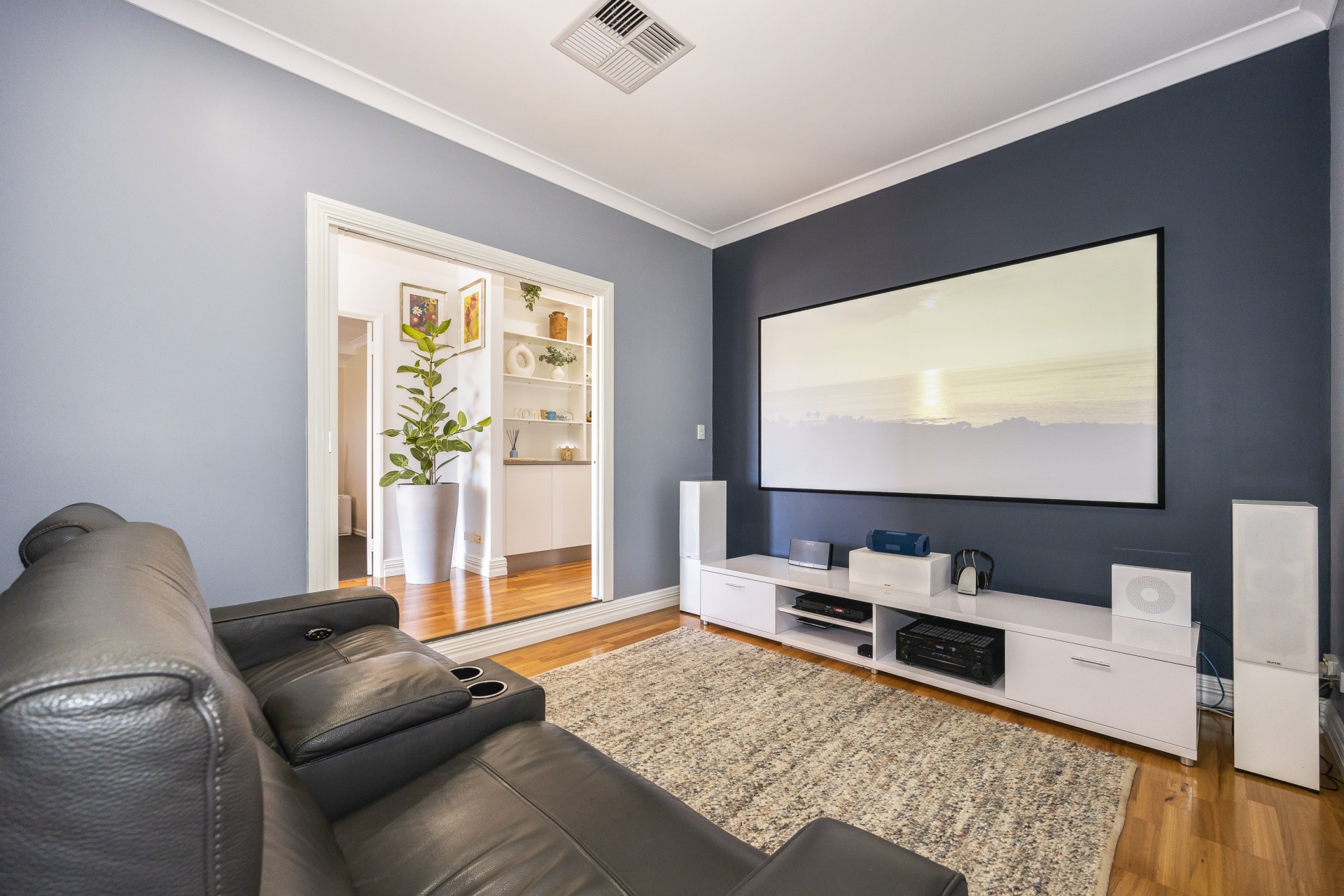 Off the entry veranda, you will find the fabulous theatre room complete with a state-of-the-art projector and screen and all related equipment. The beautiful light-filled main bedroom, ensuite and walk-in robe are adjacent and as you make your way down the hall, you will notice a large quality custom-built floor-to-ceiling display cabinet with a stone top and ample storage cupboards below.