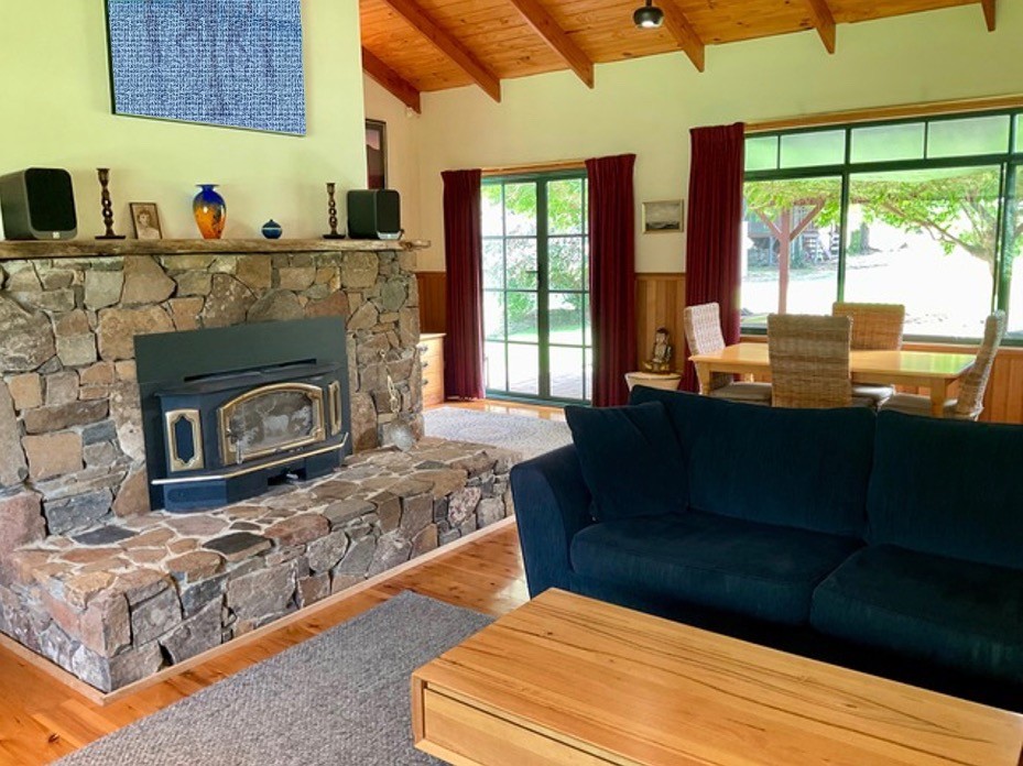 Energy saving features include a 10kw rooftop solar system, two reverse cycle air-conditioner/heat pumps, a Sanden heat-pump hot water system and double glazing in the bedrooms. The central brick and stone fireplace with Lopi woodheater, provides a heat-bank throughout winter.