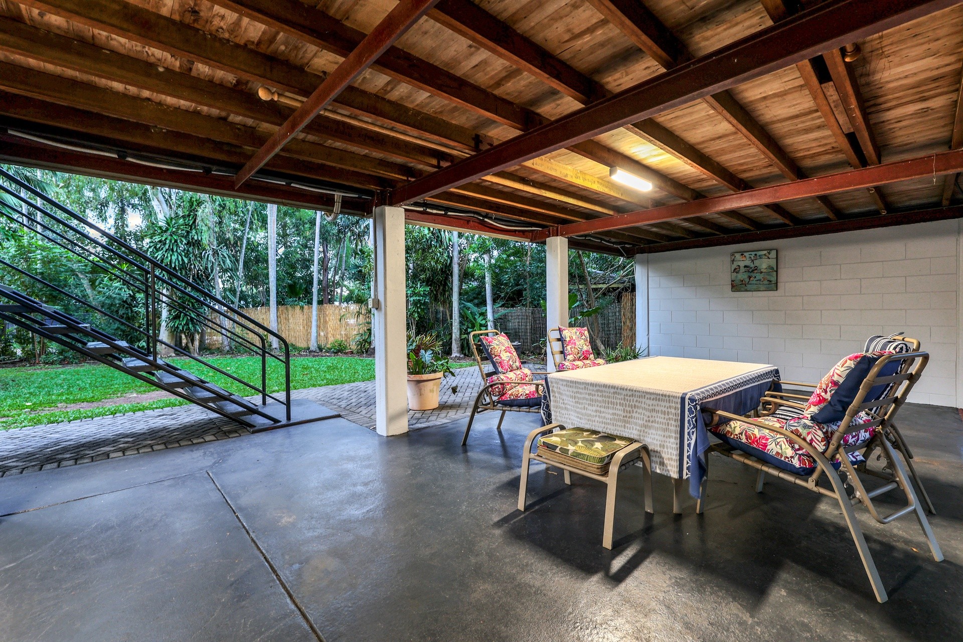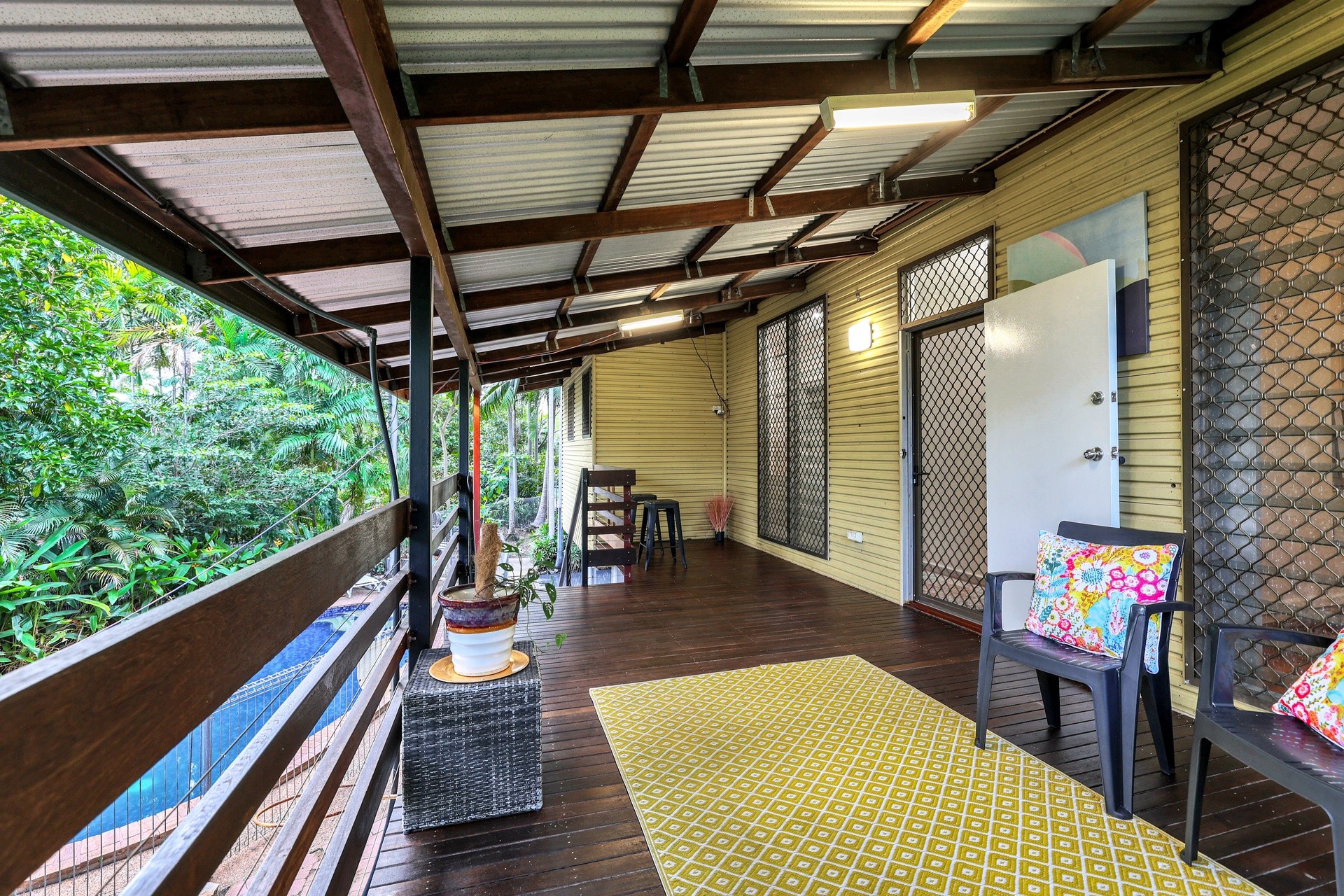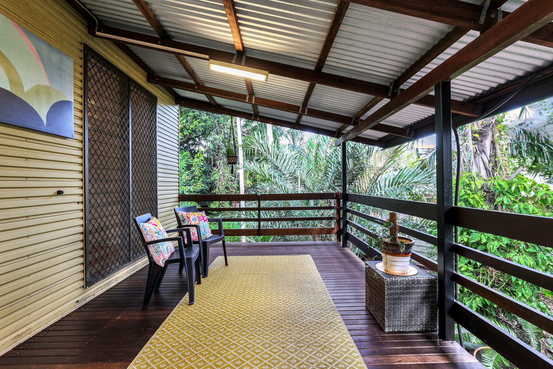 Outdoor living includes large spacious balcony, surrounded by established tropical gardens