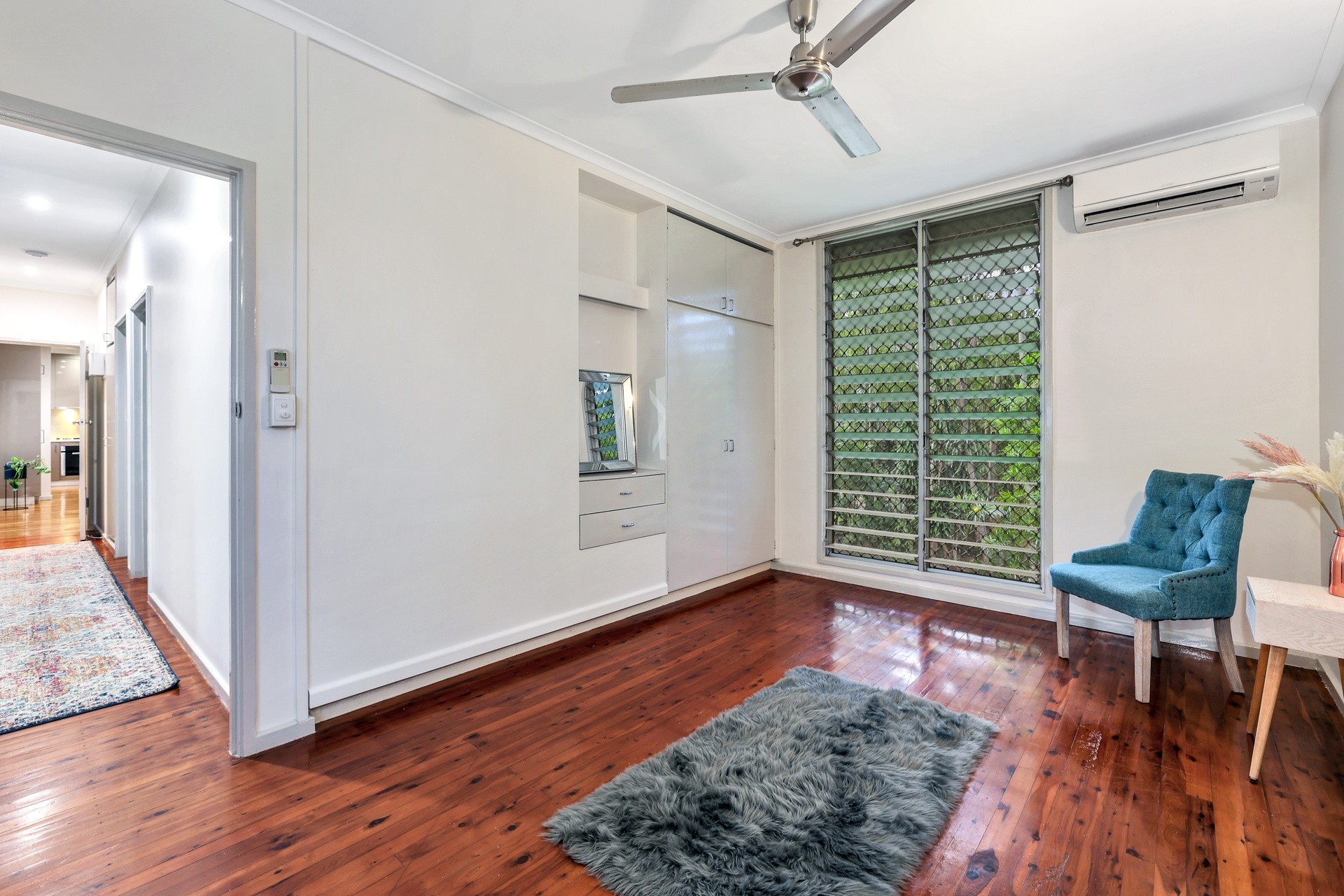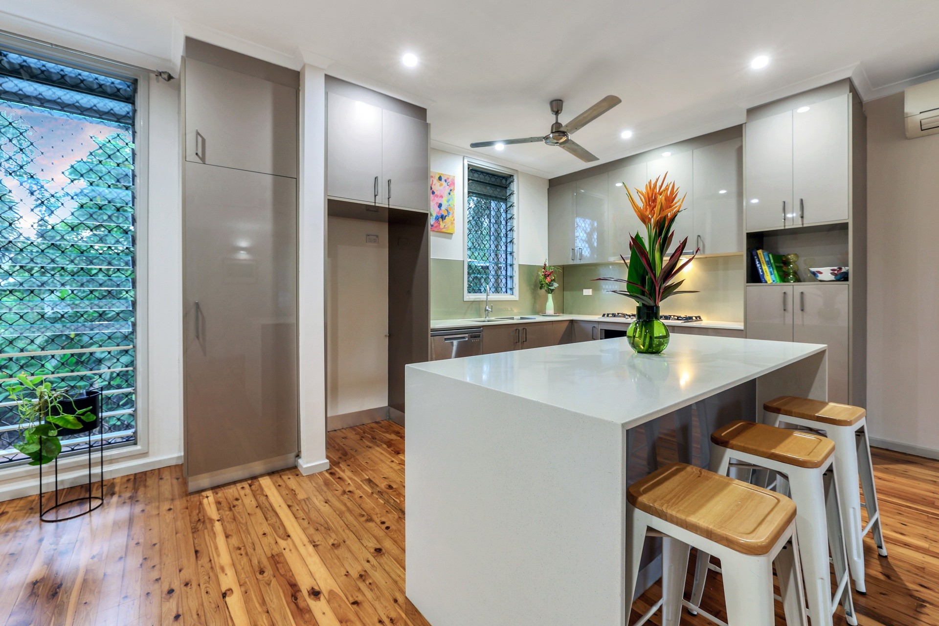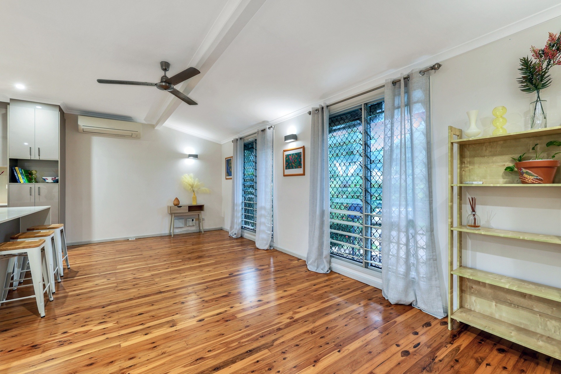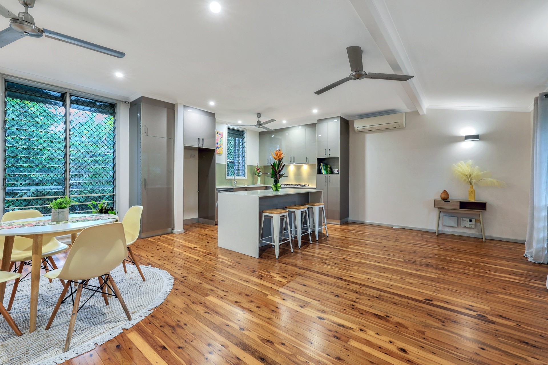 Brand new polished floorboards, taking in the stunning open-plan layout, featuring louvres throughout offering flow through breezes or enjoy the cool comfort with split system air conditioning throughout this delightful tropical-style home.
