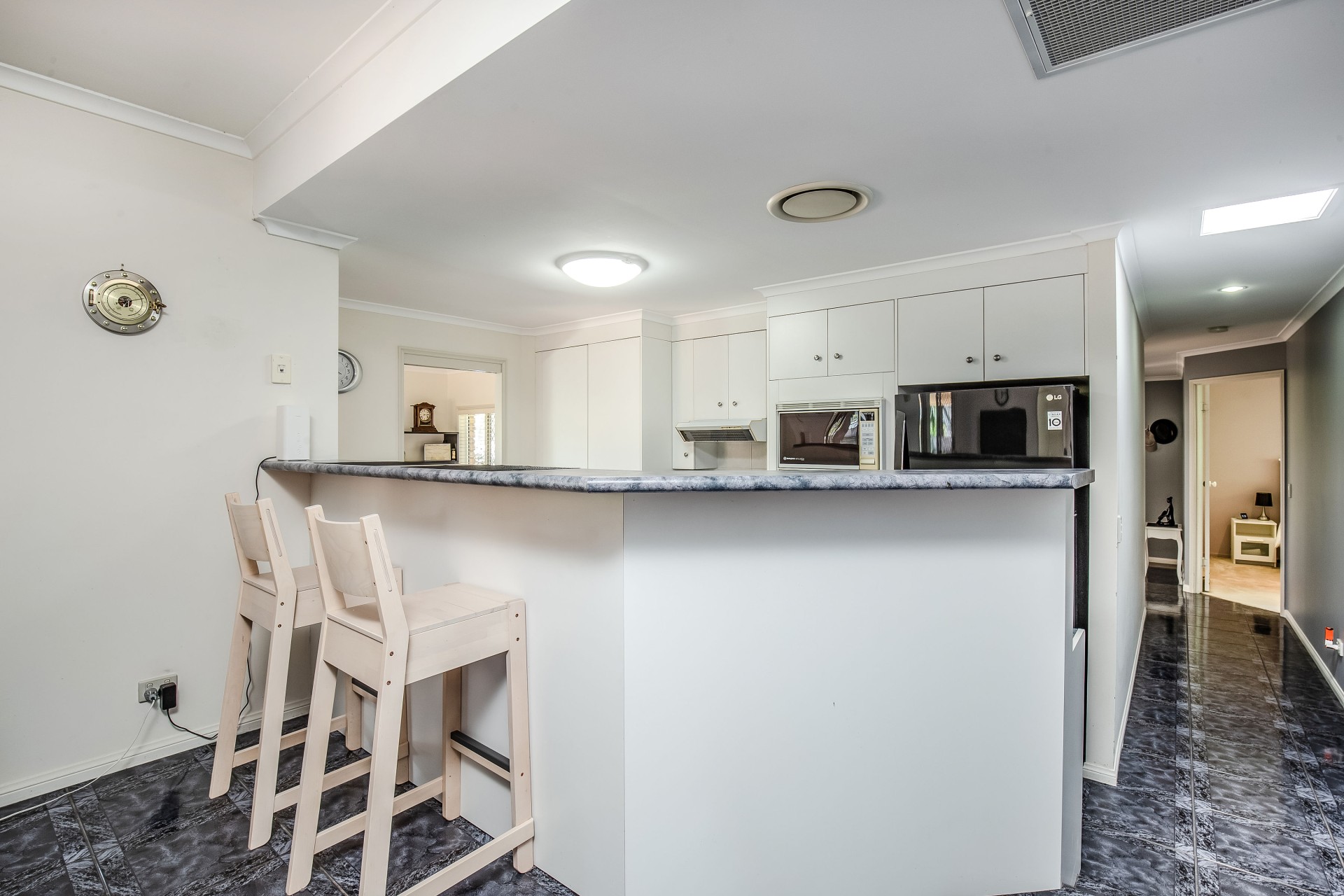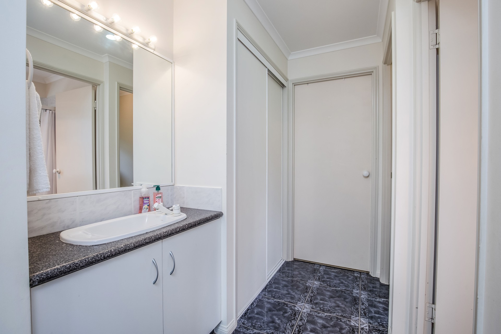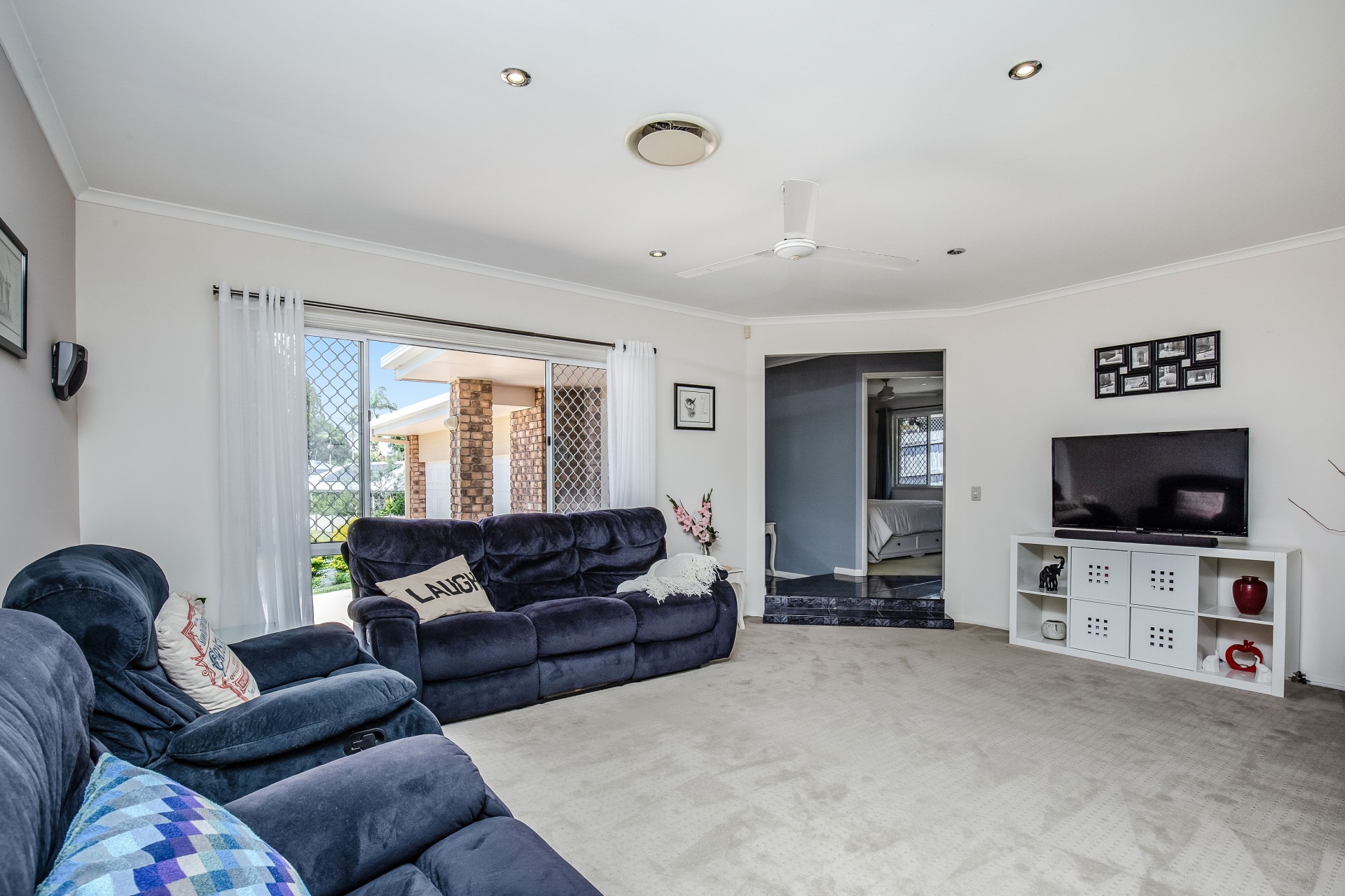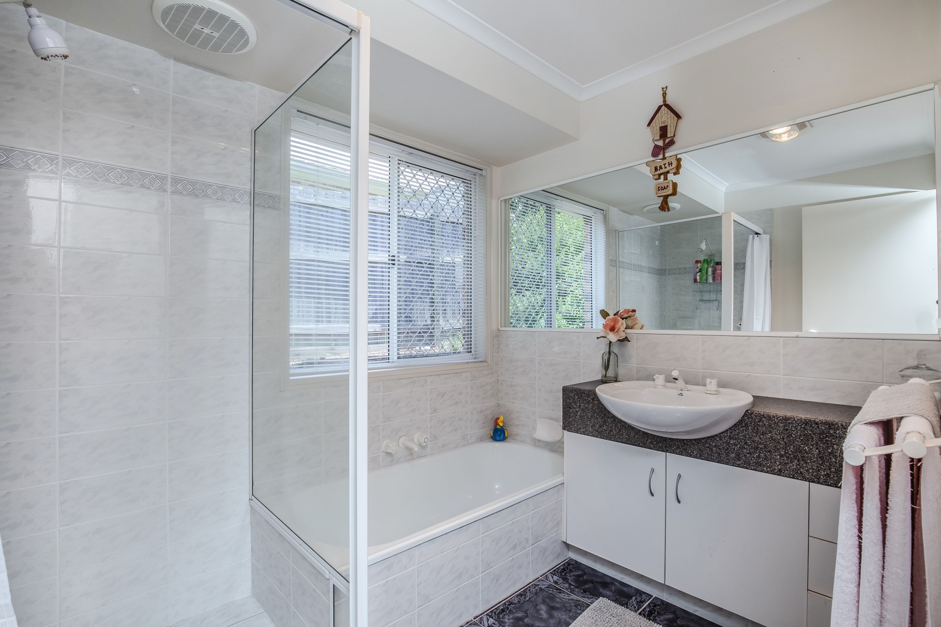 The well-appointed sleeping accommodation includes a spacious main bedroom with walk-in robe and ensuite bathroom, complemented by two further bedrooms featuring built-in robes, and a shared family bathroom with separate toilet and the added convenience of an external second basin for busy mornings.