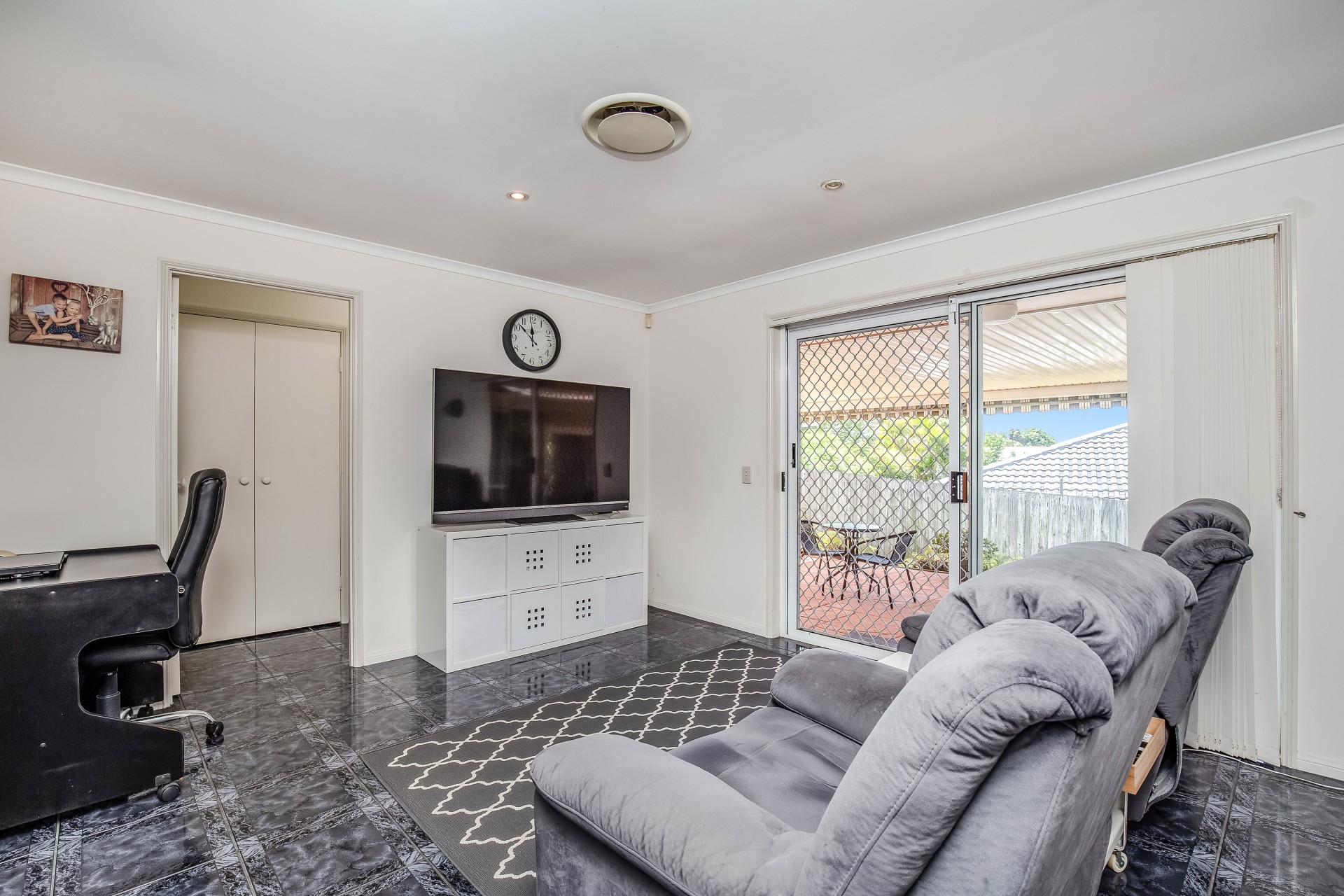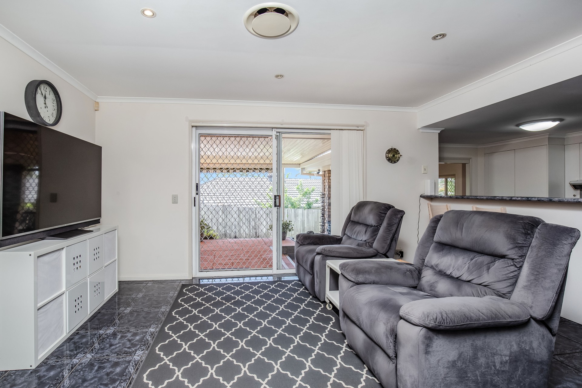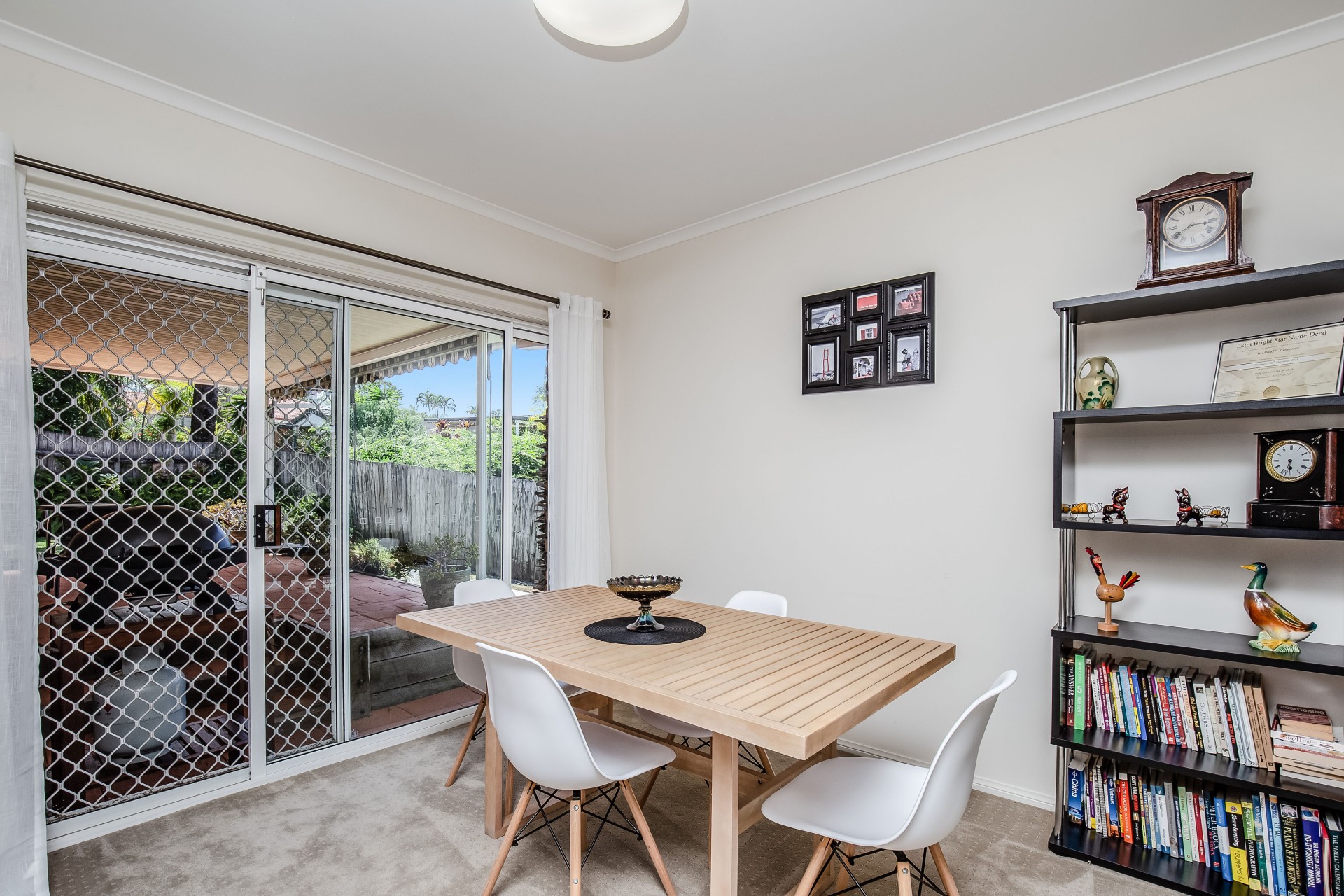 Seamlessly blending indoor and outdoor living, sliding glass doors open to a covered alfresco patio, perfect for year-round enjoyment as you watch children play in the rear garden.