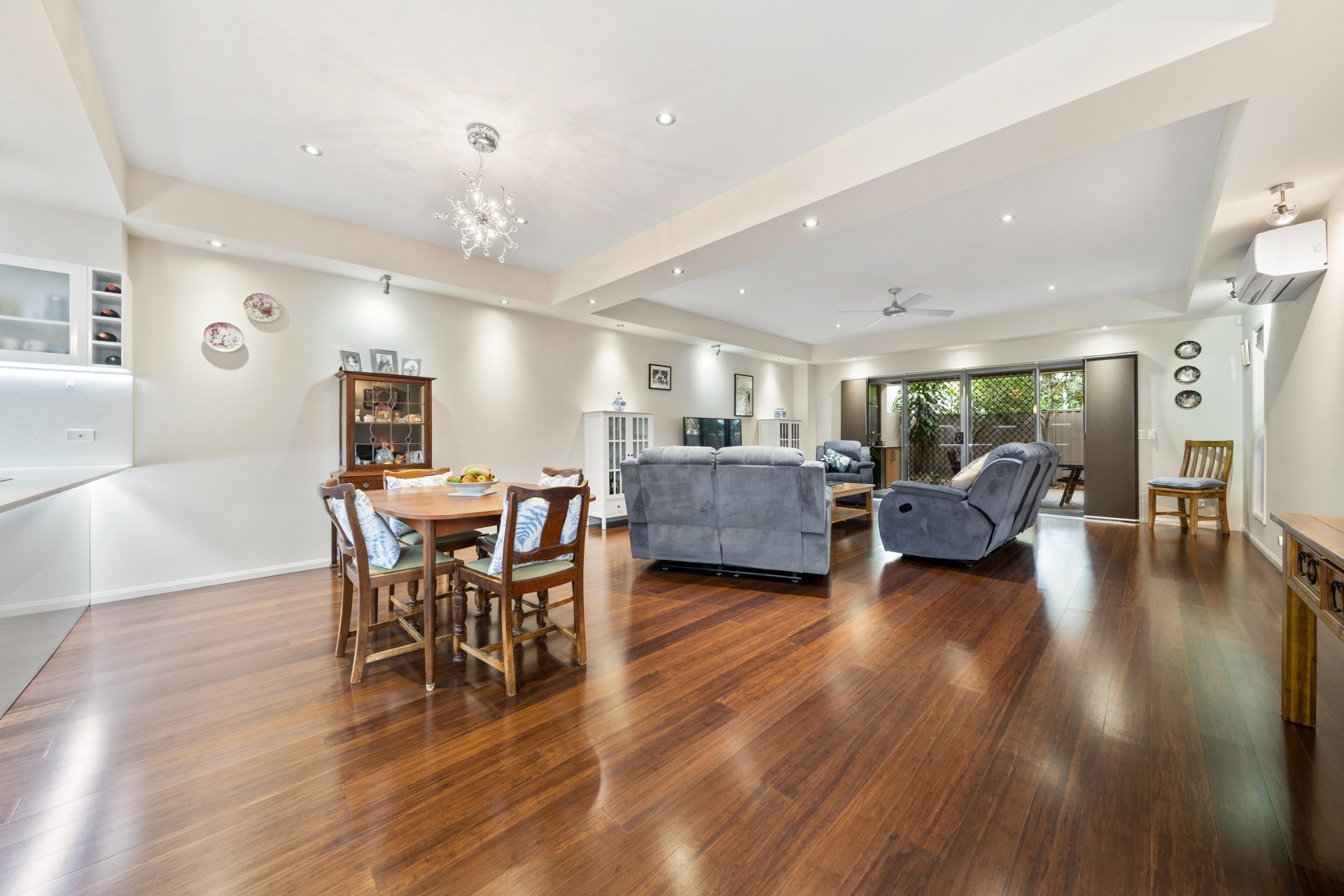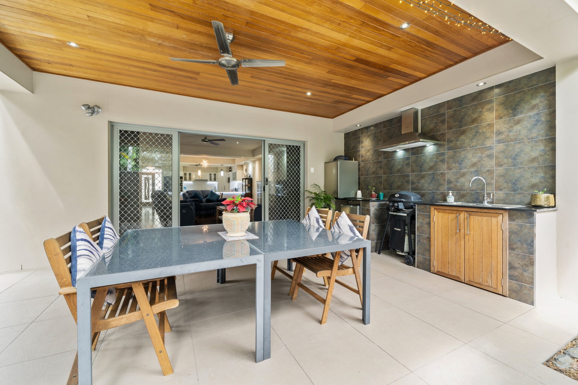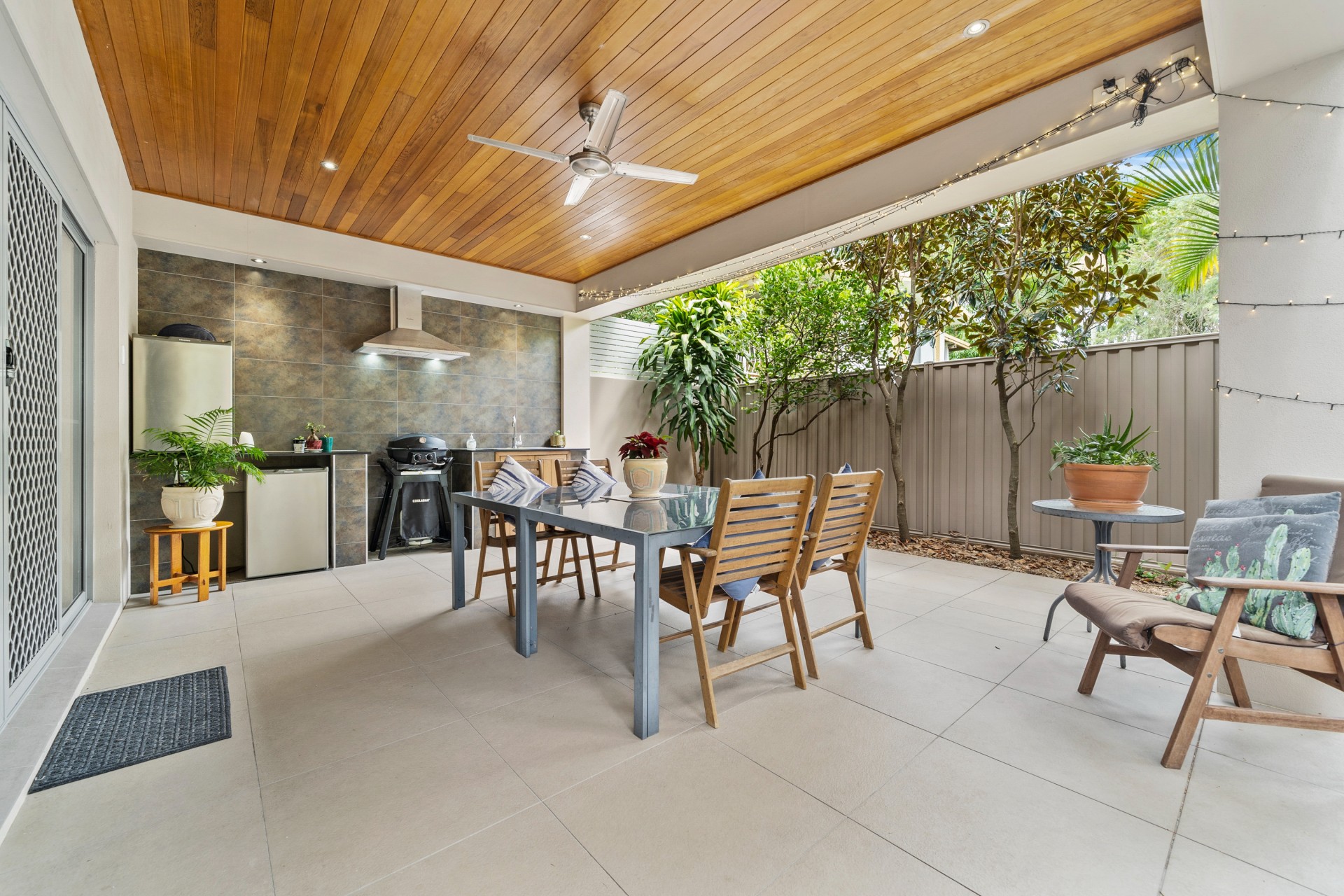 The downstairs lounge opens on to a beautiful fully tiled private and secluded courtyard with sink, cabinets with granite tops, extractor fan, ceiling fan and multiple power points.