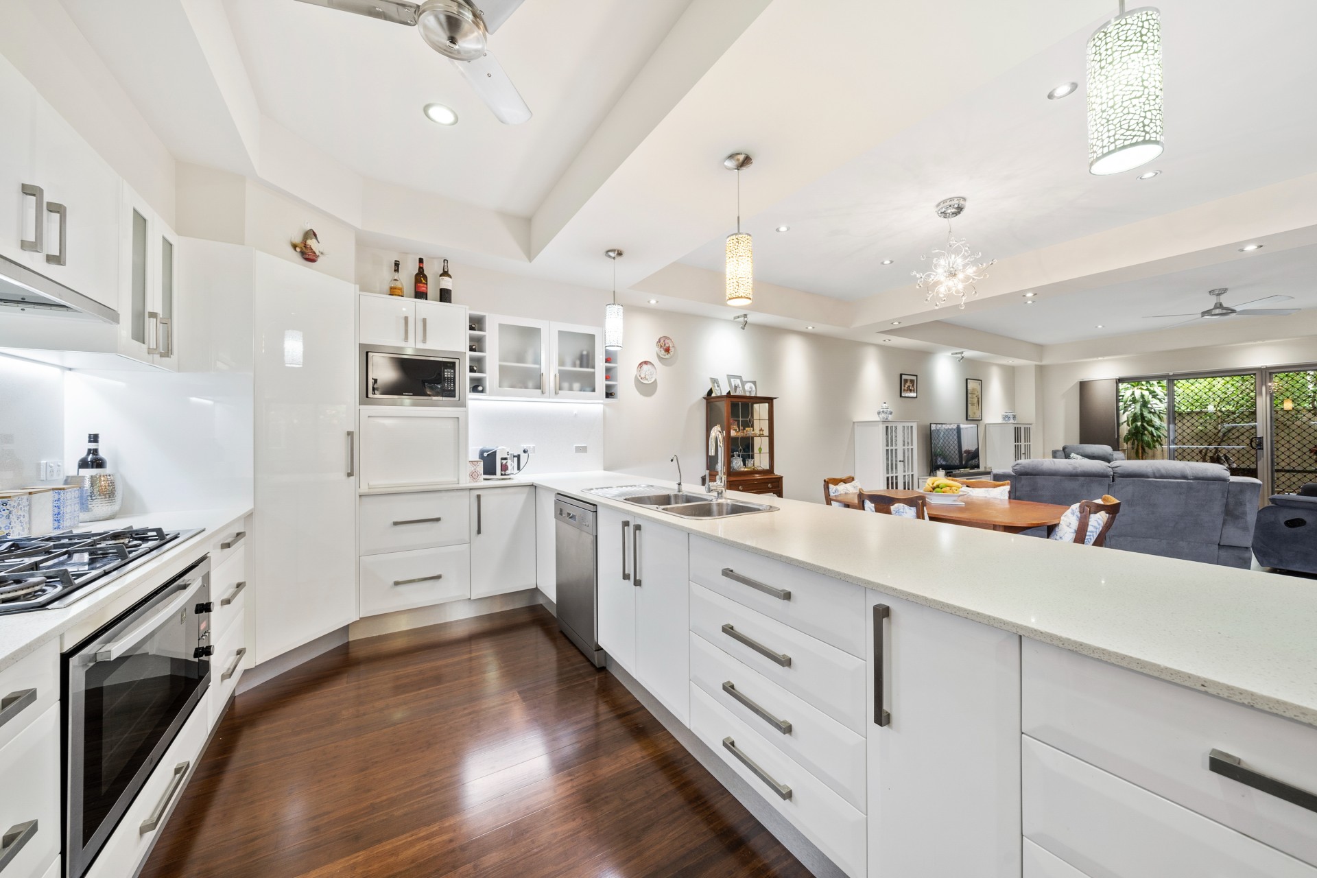 The kitchen comes with a five burner gas cooktop and large electric oven, Cesar stone bench tops, soft close cabinets, dishwasher and built in microwave oven.
