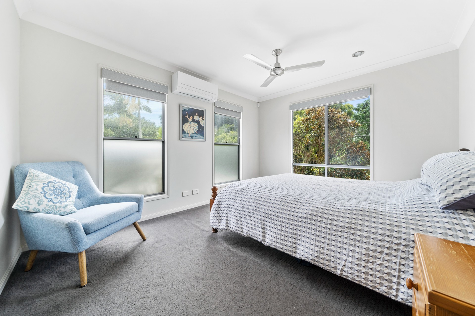 There is ample storage with built in robes and a walk in linen cupboard.