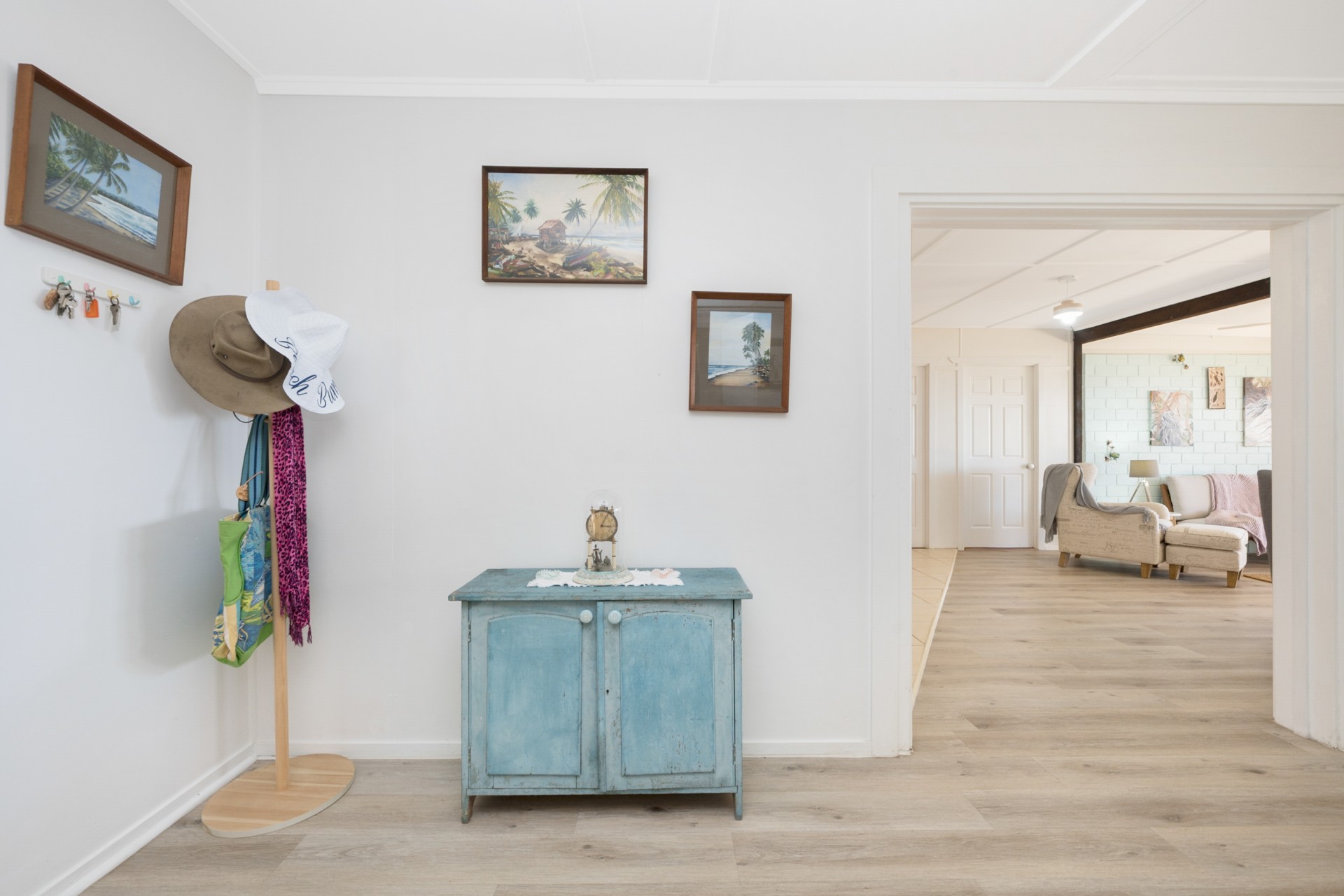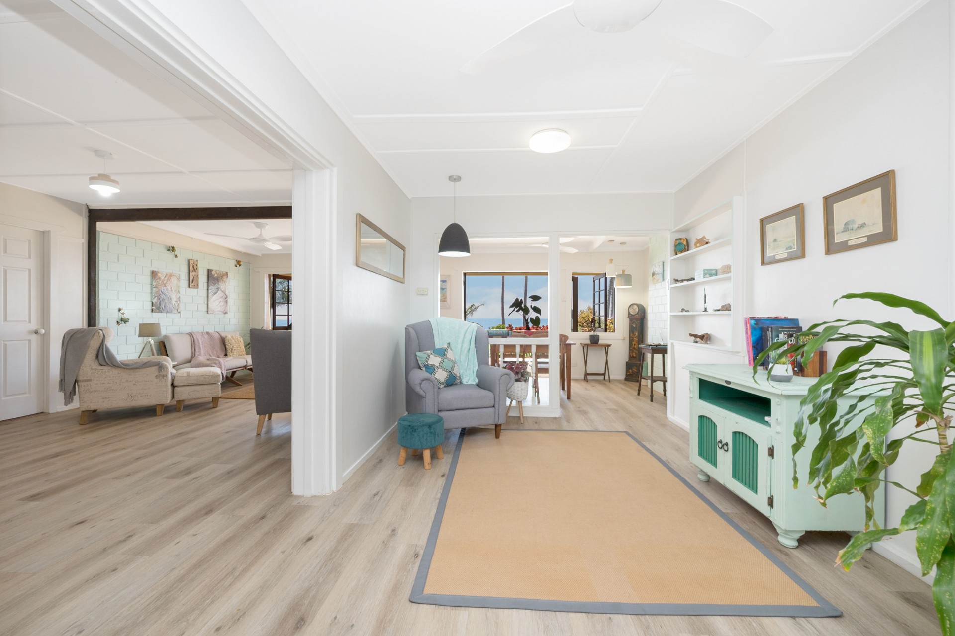 There are 3 spacious bedrooms, including the master bedroom suite, with ensuite and adjoining study/nursery/reading nook/parents retreat. Two more bedrooms include another large bedroom, with large two way ensuite that also serves as the family bathroom and laundry and a front bedroom looking out to the sea, currently used as a TV room.