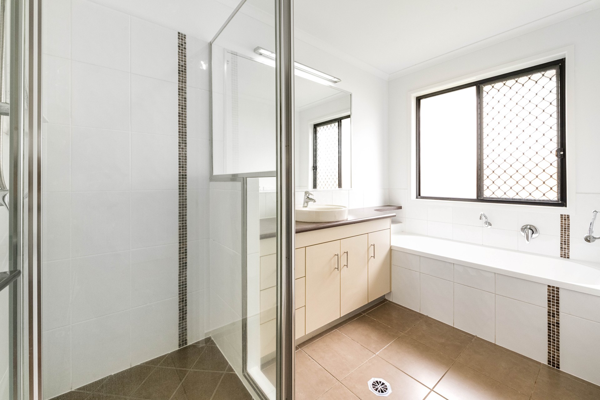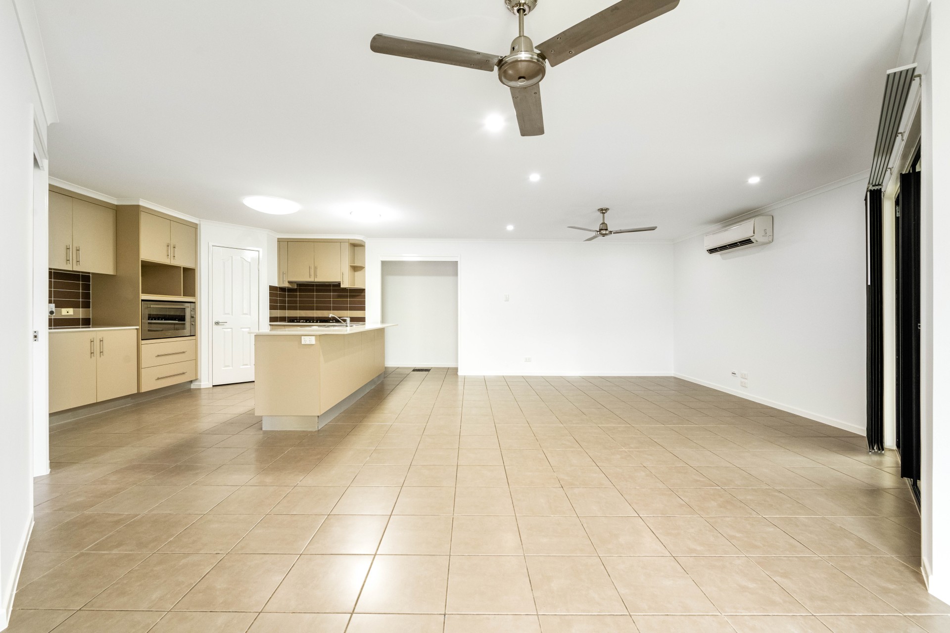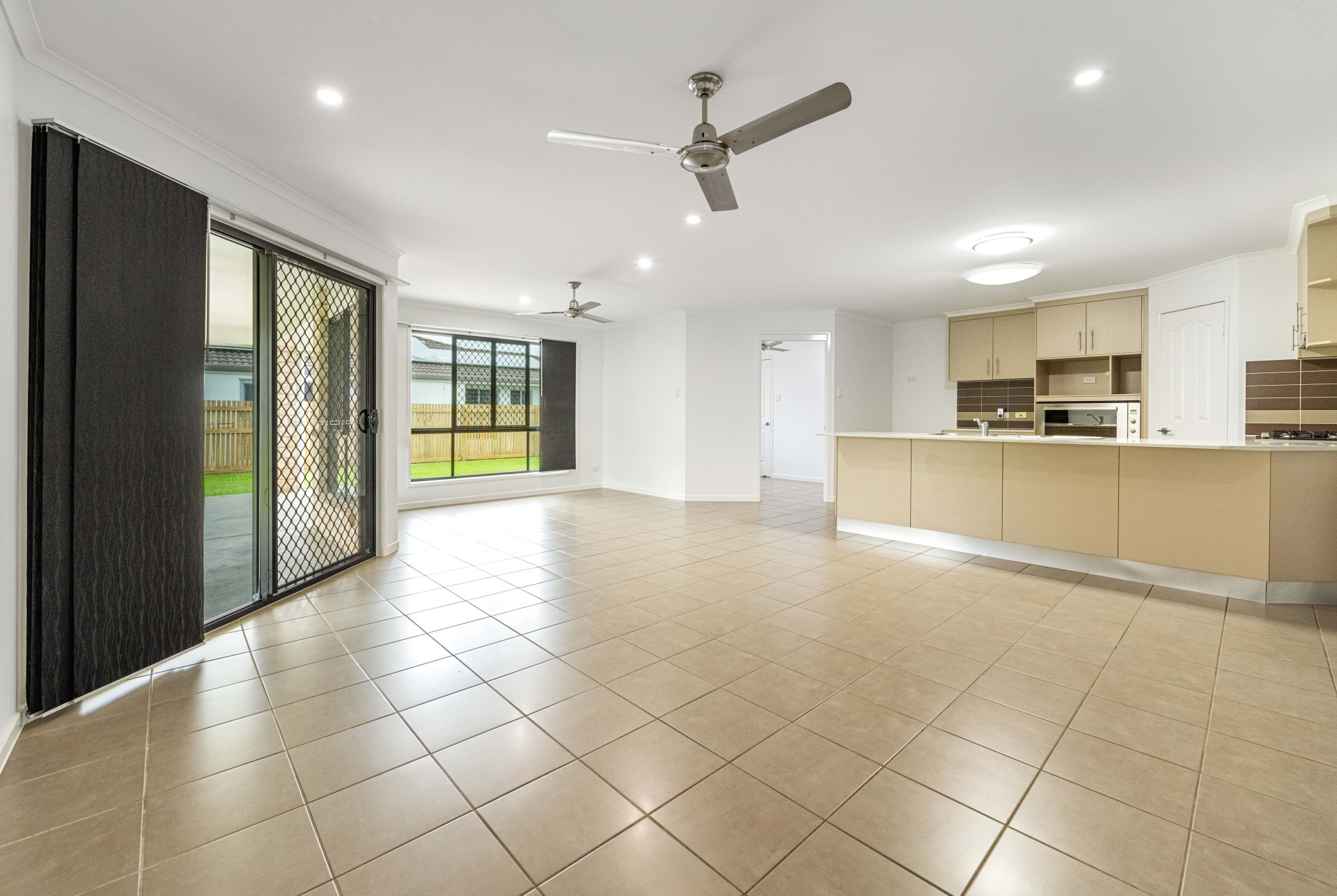 - Open plan, tiled living and dining area.