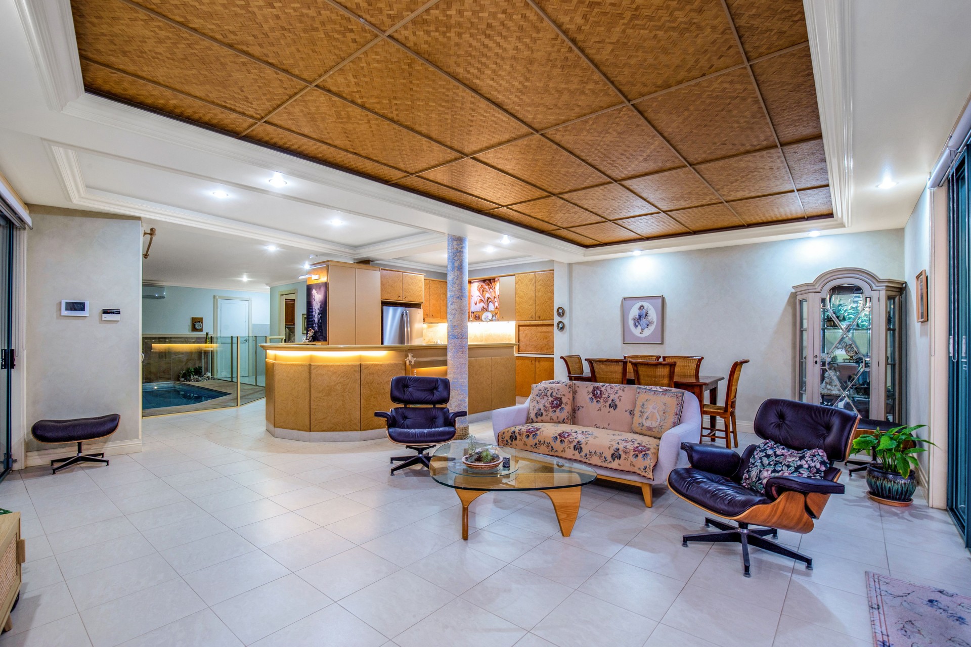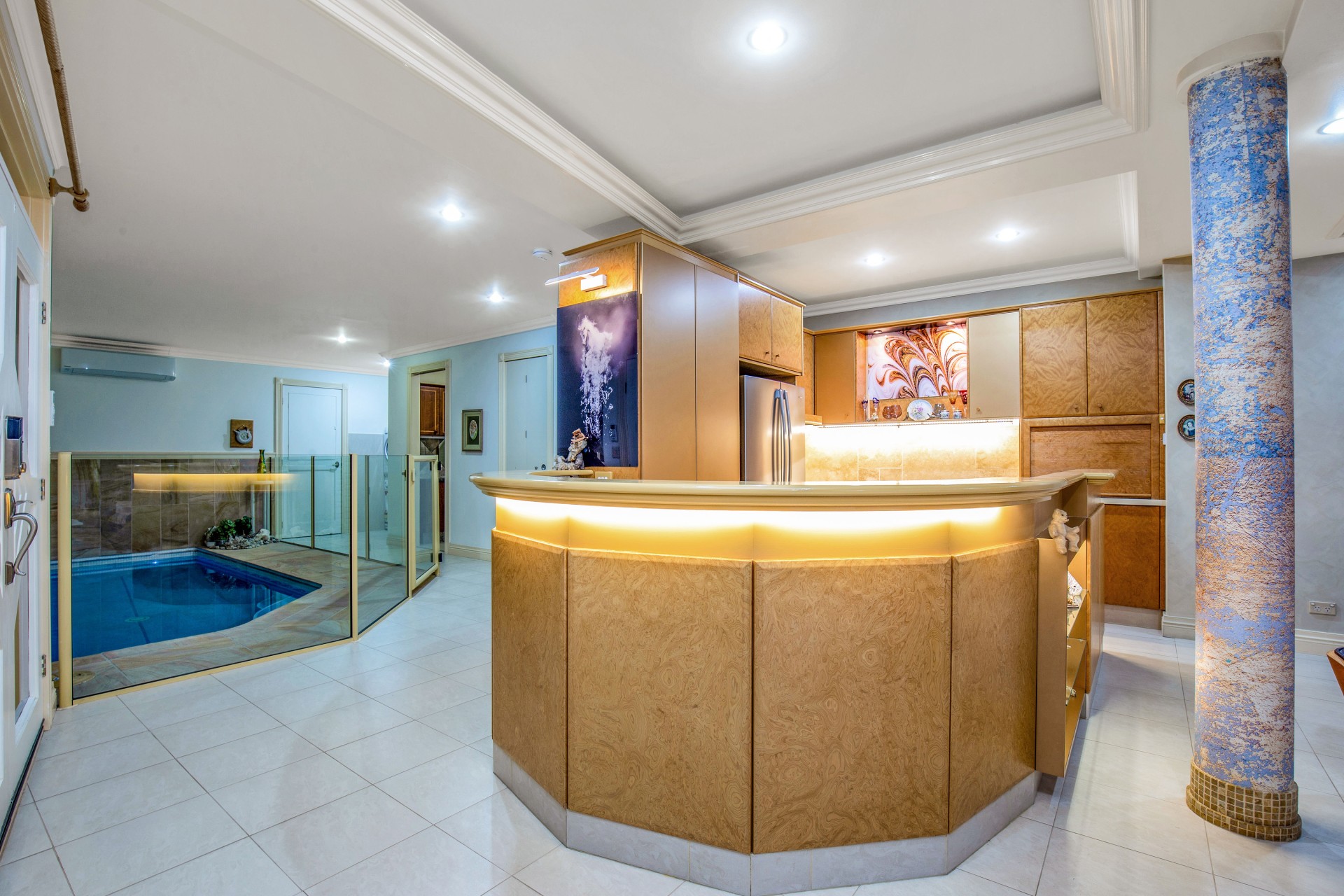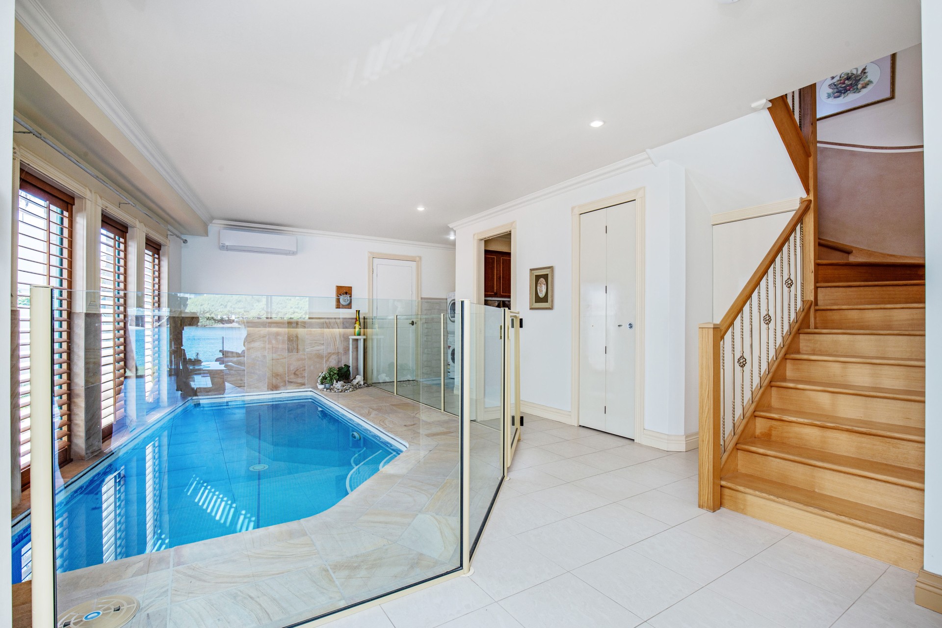 Indoor aquatic playground: glass tiled pool is designed & built for the safe enjoyment of youngsters right up to ancients, in safety. Choose the exercise level from mild to super fit, using 1 or both separate sets of swim jet systems for "endless" swimming, all year round (24//7), with adjustable timber louvres for total privacy.