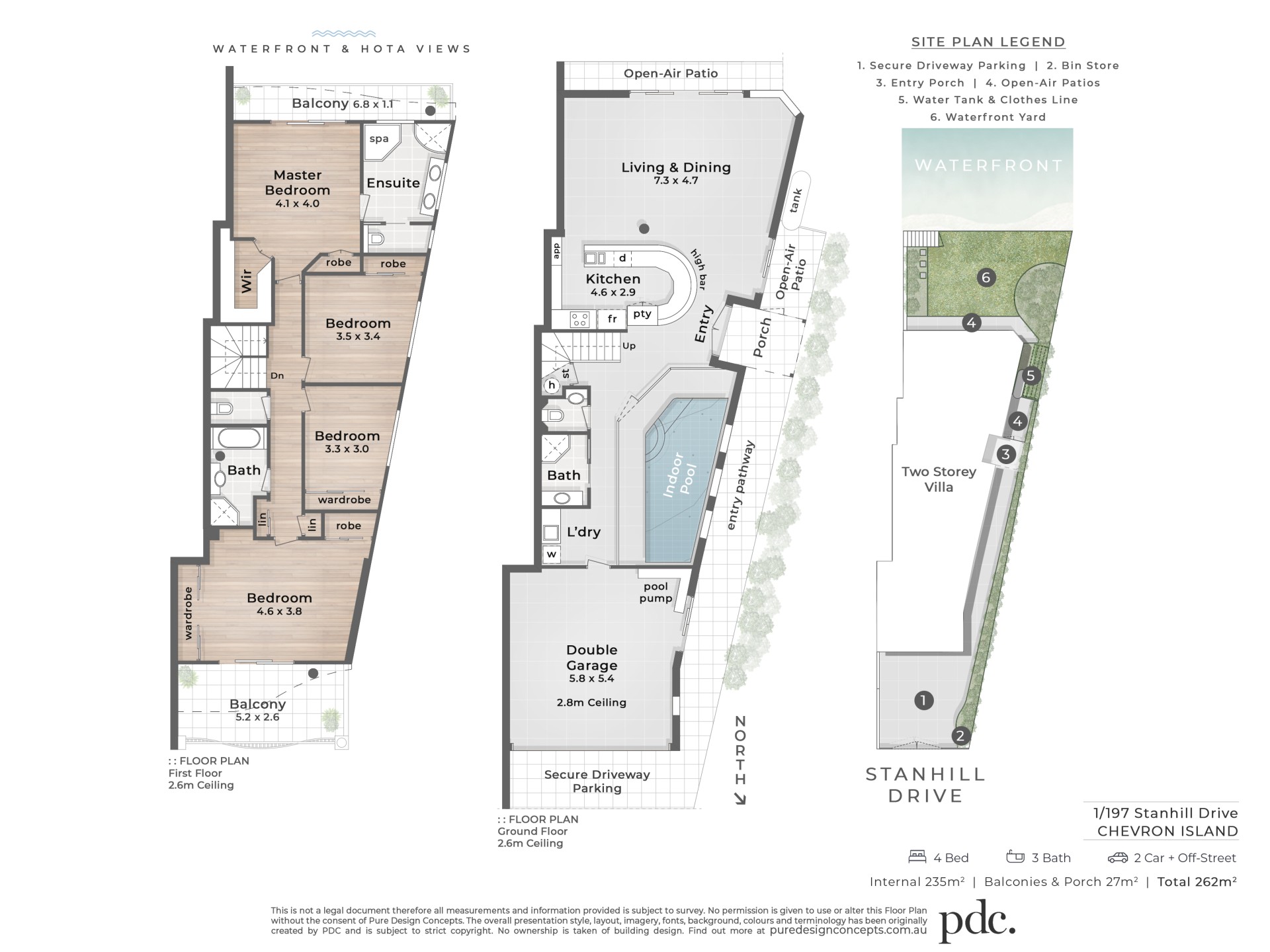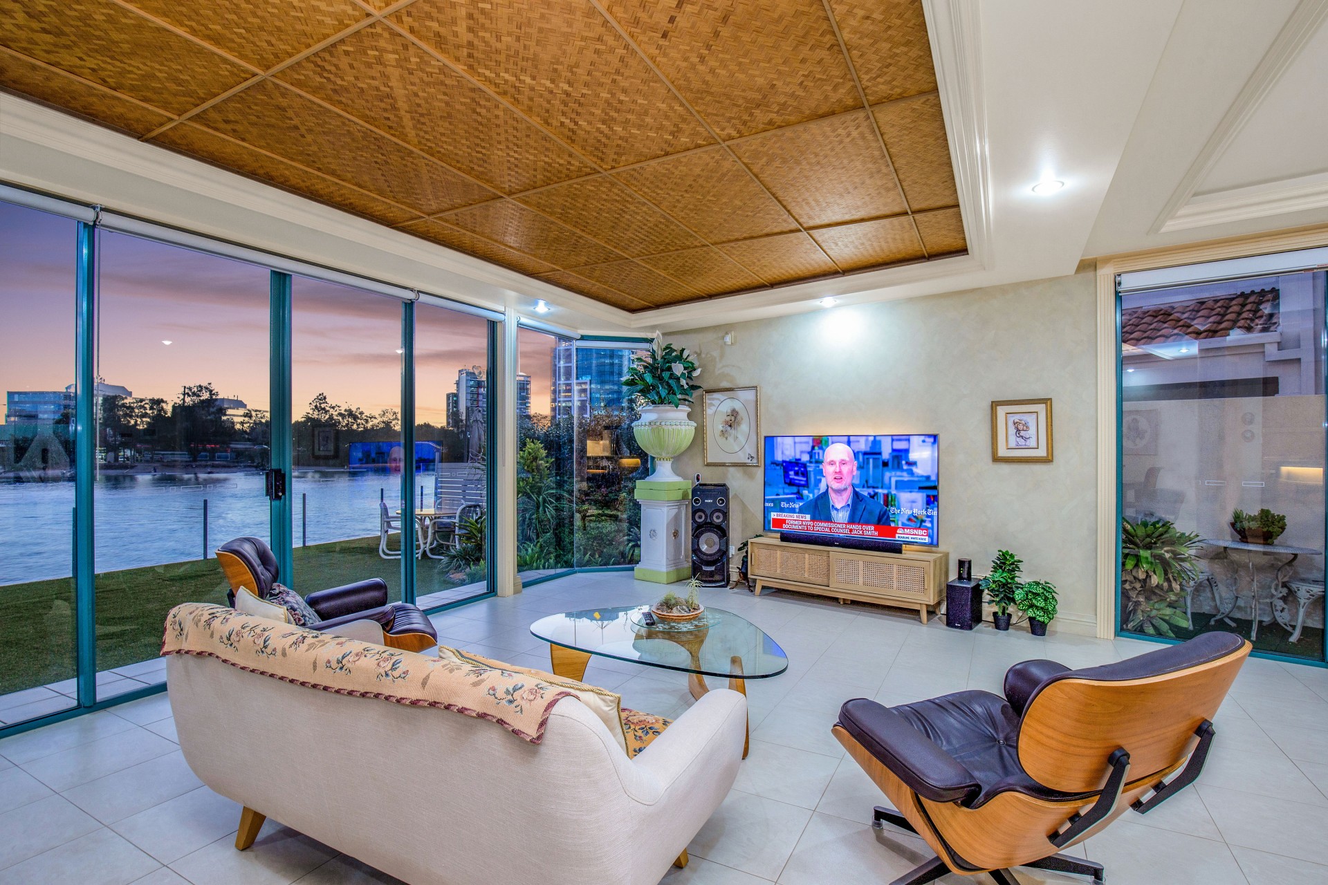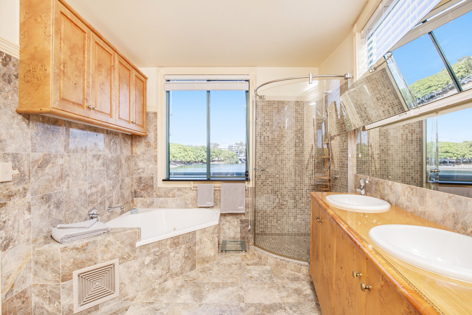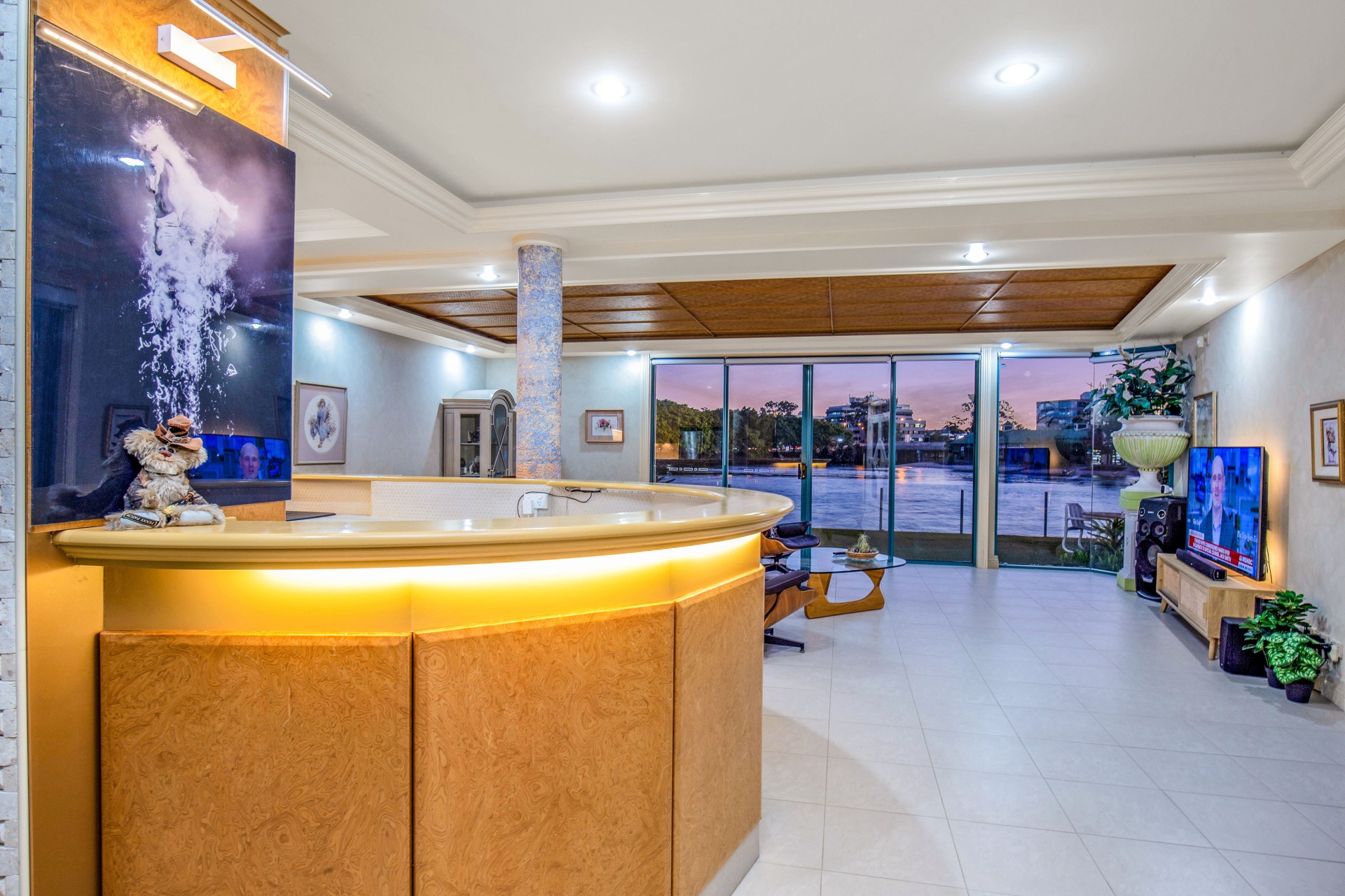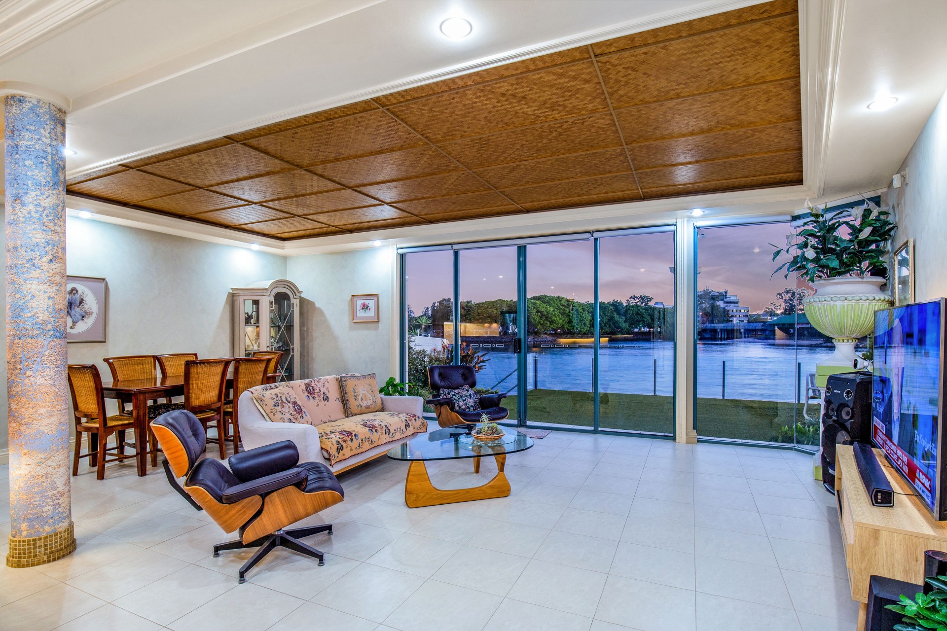 Larger, fan-shaped land widens to river, clever design & special council permit for additional site coverage made it possible for a custom design incorporating: more light & ventilation & views from: Living, Dining, Kitchen, Entry, the indoor Pool, Bedroom 1 & Ensuite.