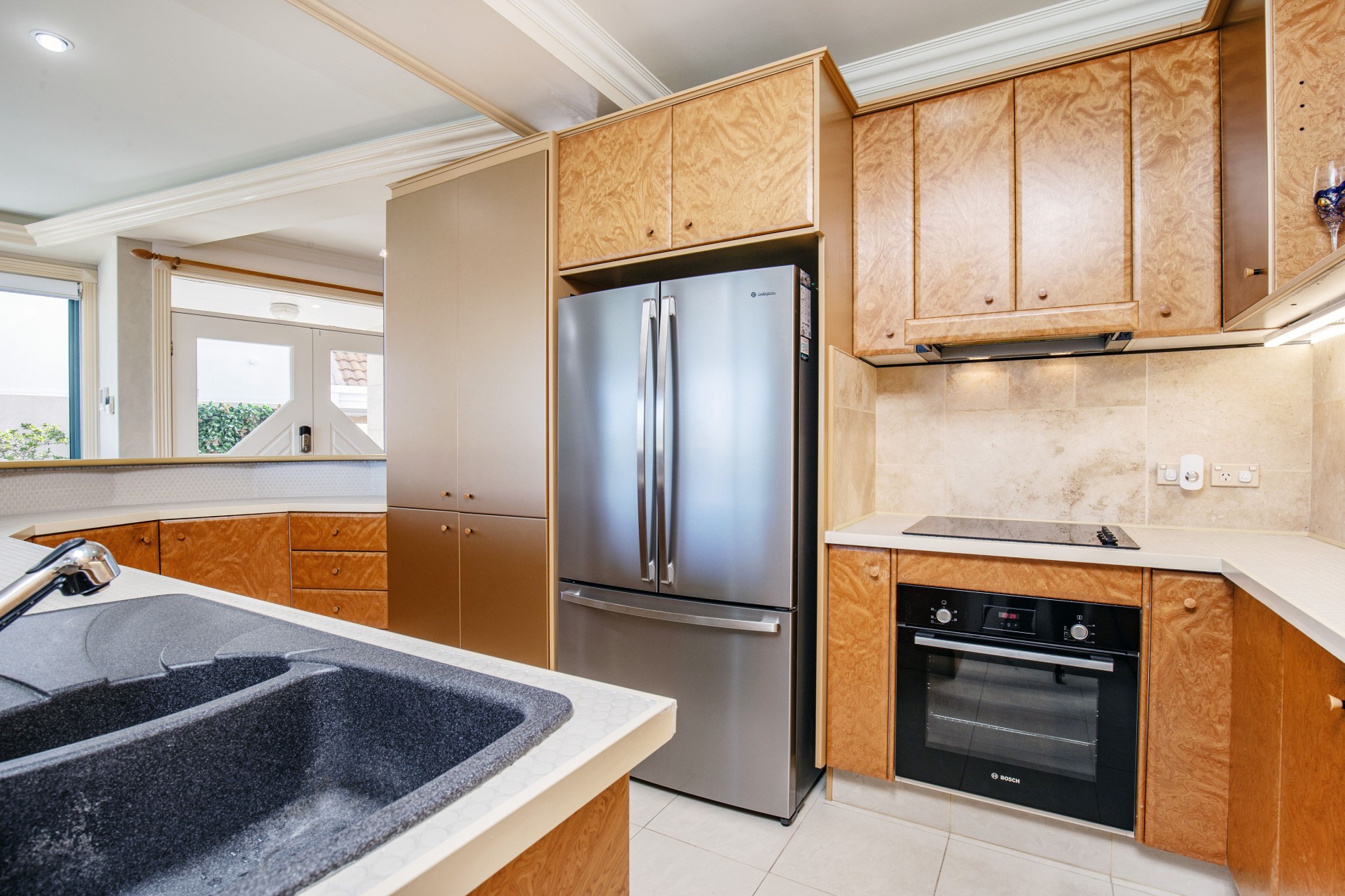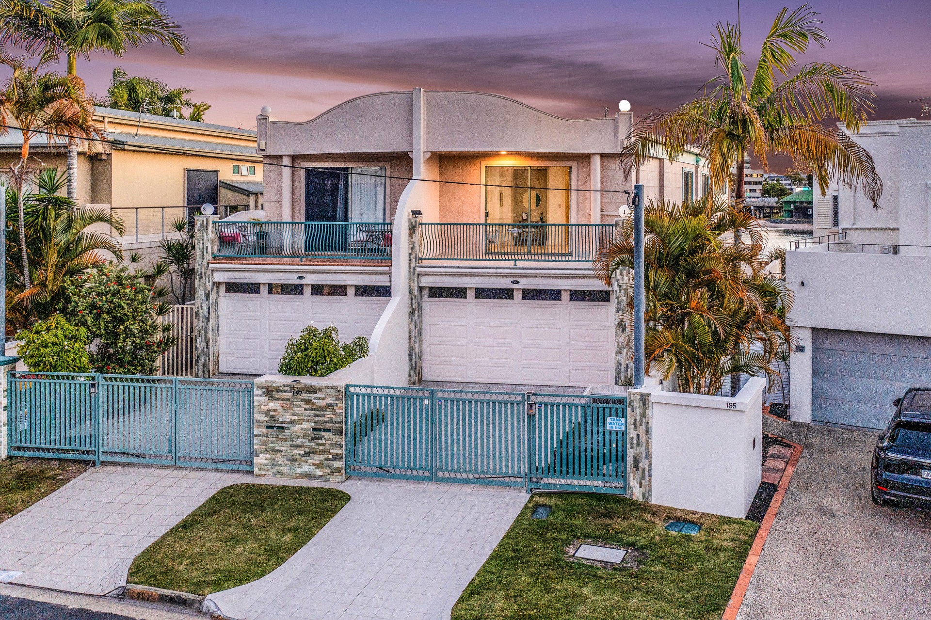 Floor-to-ceiling glazing. 4 bedrooms, ensuite, powder room, WIR, spa. Furniture-grade cabinetry in all 3 bathrooms, with walls & floors tiled in light coloured "ageless" marble. House size kitchen. Dining for 10 +. All 3 toilets are in separate enclosures. High ceilings & ceiling treatments. Full height doors. Wave themed facades. Unusual & unique features. Outside walls tiled, no painting. Home designed for minimal maintenance. Double garage. gate intercom, ducted vac, sprinkler system, electric gates, keyless pad entry, remotely operated. Security systems. Ultimate, solid "anti-cyclone" & more "fireproof" dividing wall (this wall is the ONLY item the duplex shares).