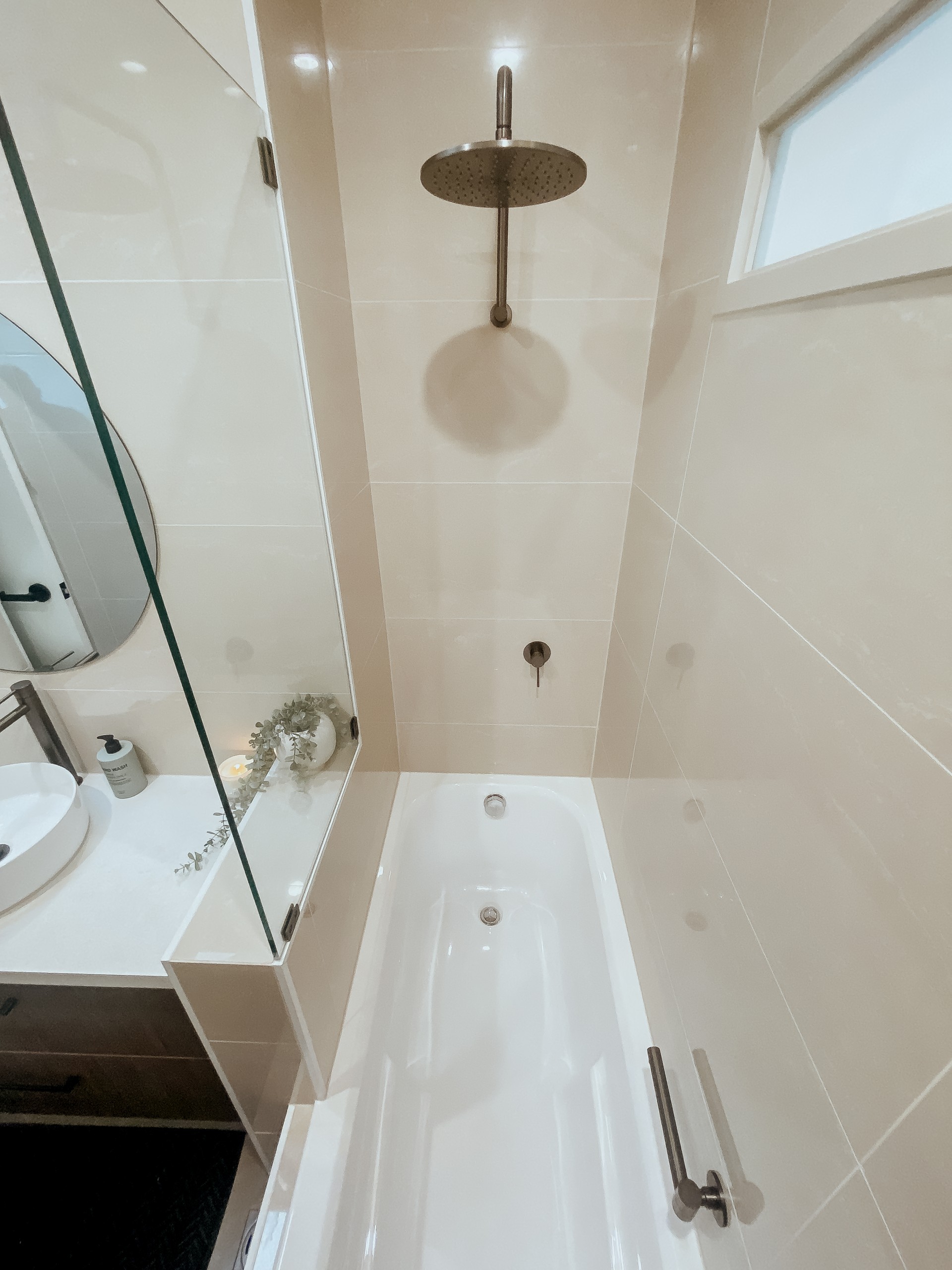 Central bathroom freshly renovated with modern, high quality finishings and floor to ceiling tiles