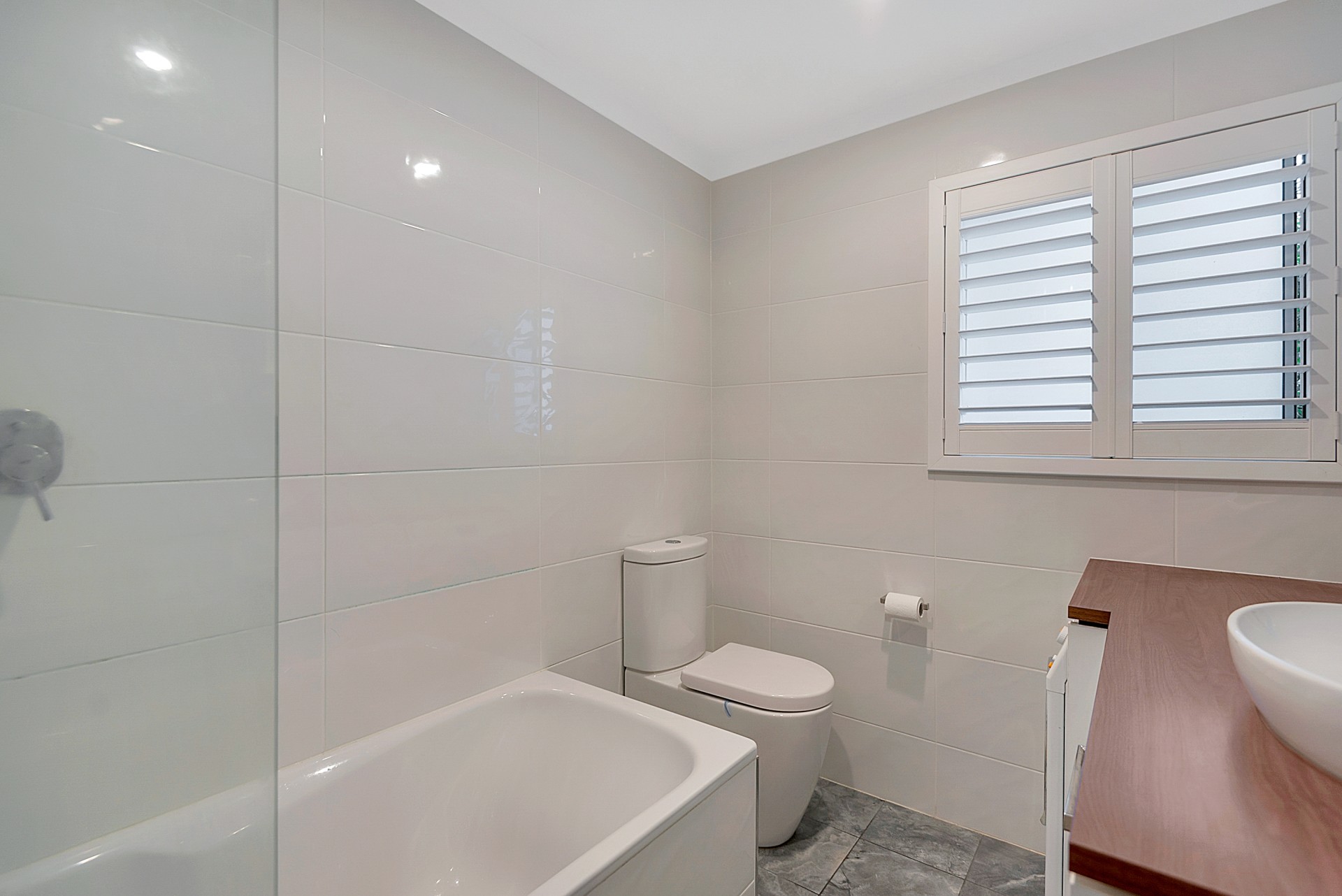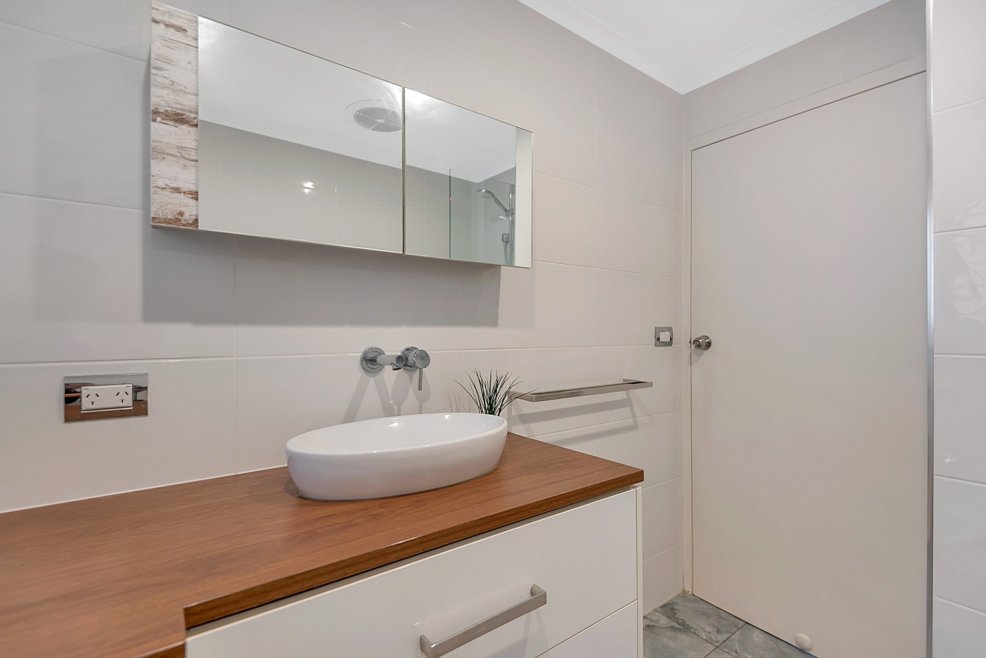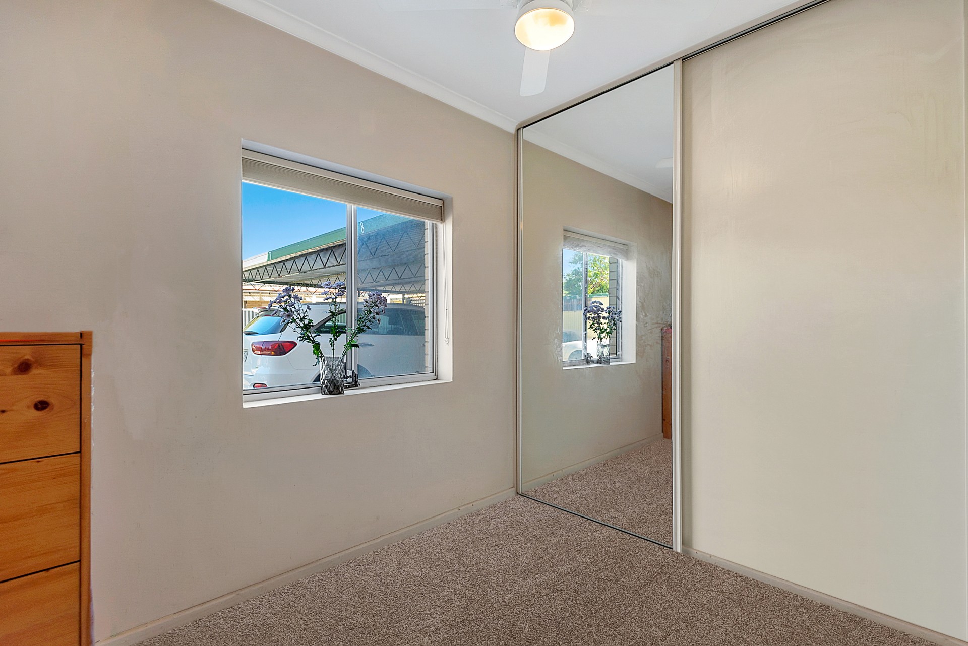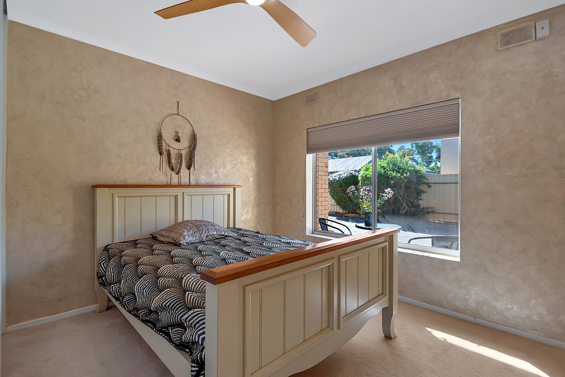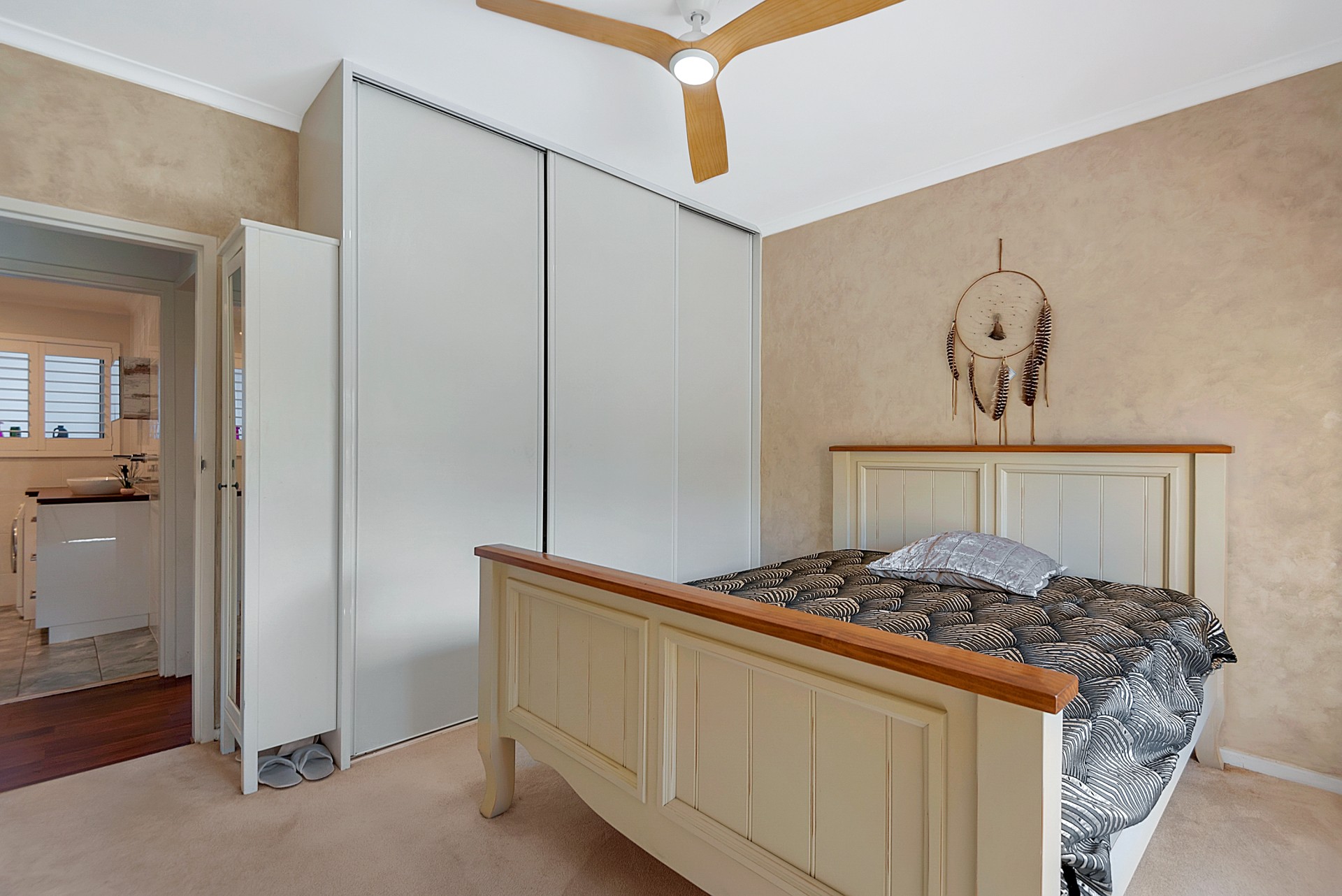 Two generously-sized bedrooms are fitted with ceiling fans and roomy sliding wardrobes providing ample storage. The stylish fully tiled bathroom showcases a luxurious Kaldawah bath and shower combo, a custom Jag Kitchens-crafted vanity with dual deep drawers, and a large countertop for laundry tasks.