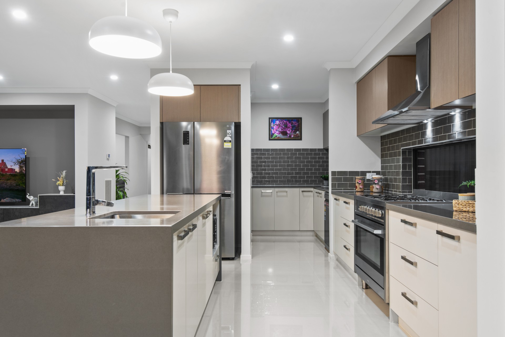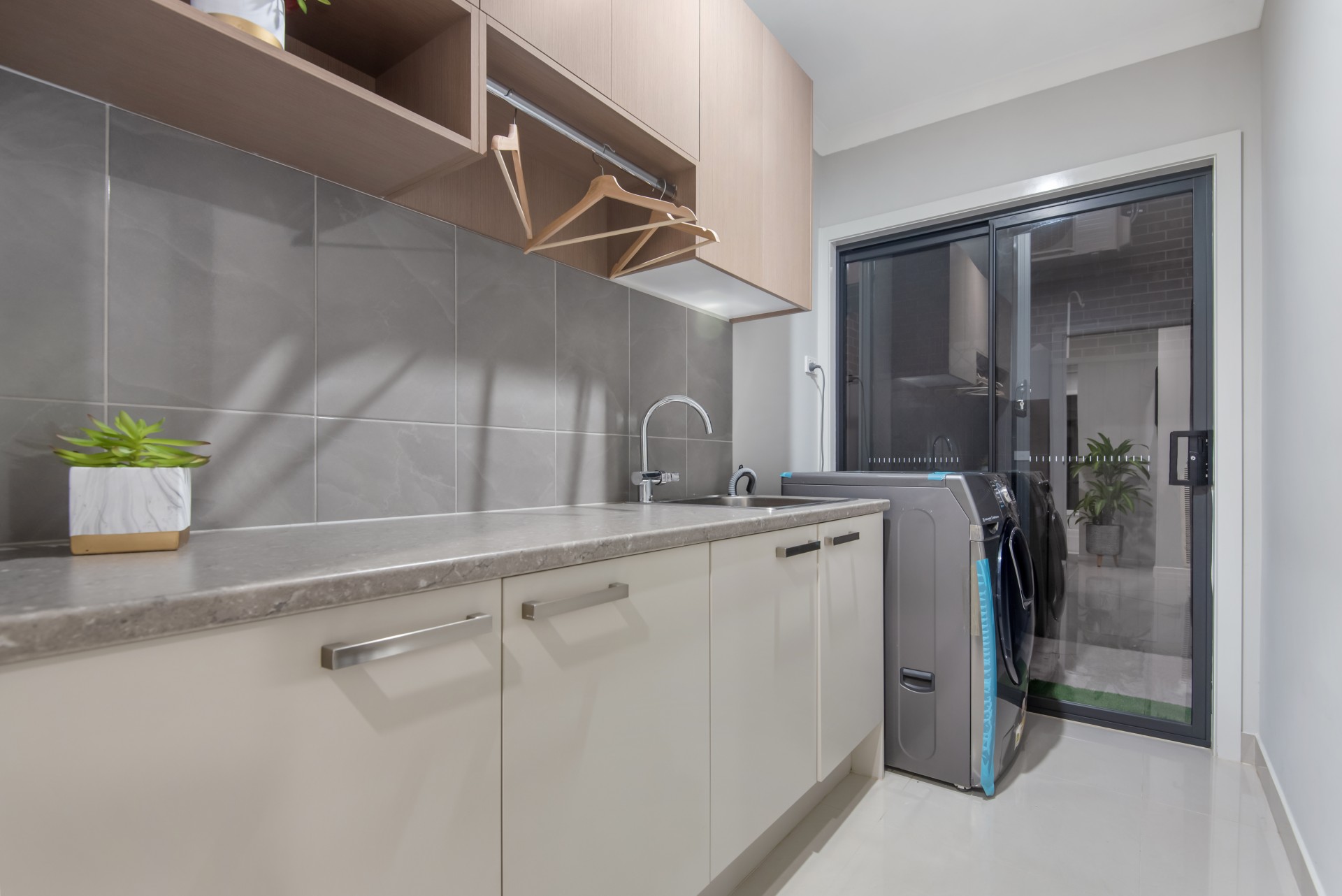 The large open-plan kitchen, meals and family areas create a comfortable shared space. The kitchen is also equipped with a butler's pantry and extra storage area. 40mm stone in kitchen bench,40mm stone waterfall island bench top, 900mm stainless steel gas cooktop, range hood and a lot of kitchen cabinets storage. Open plan living area unites the interior
