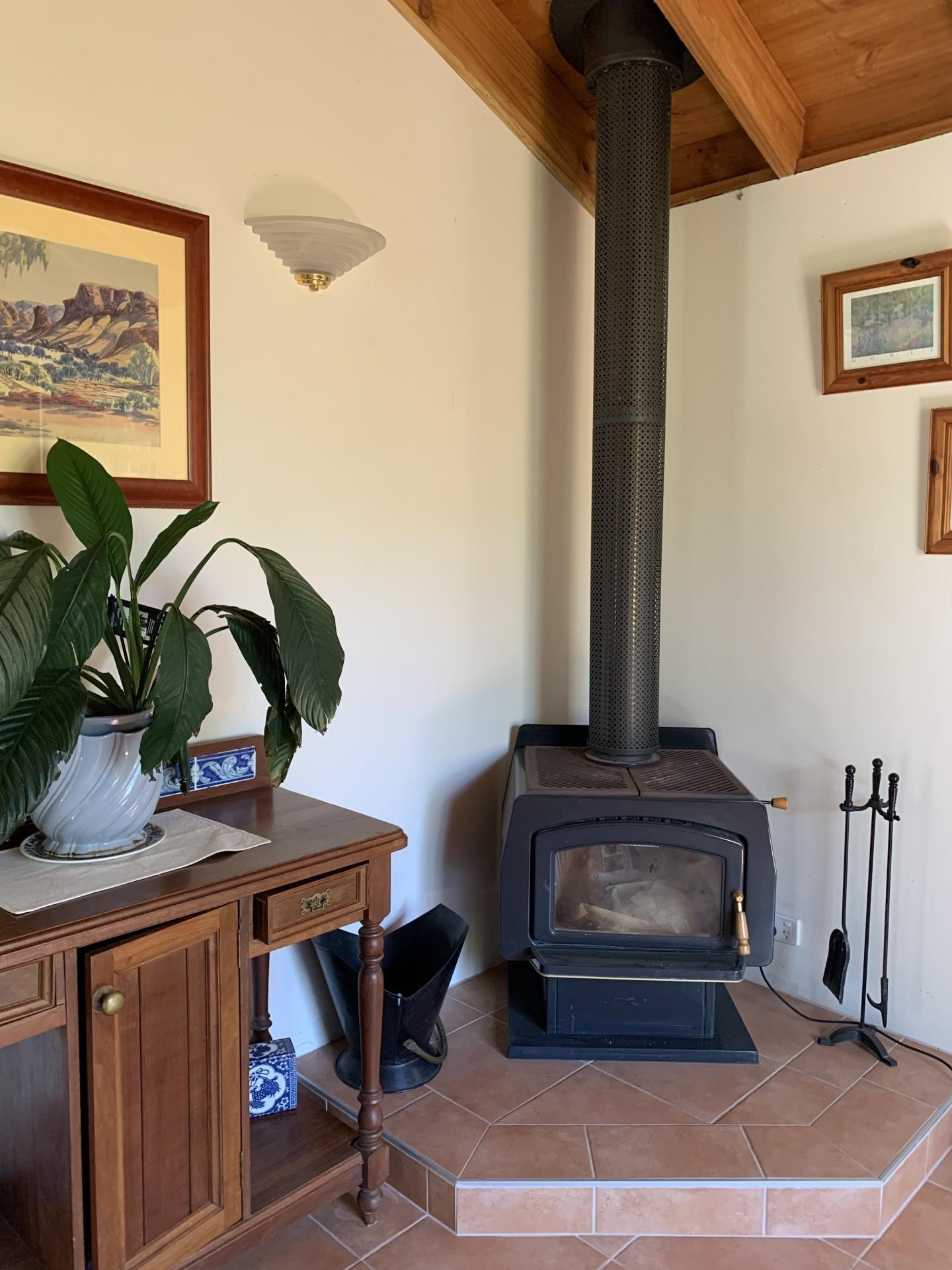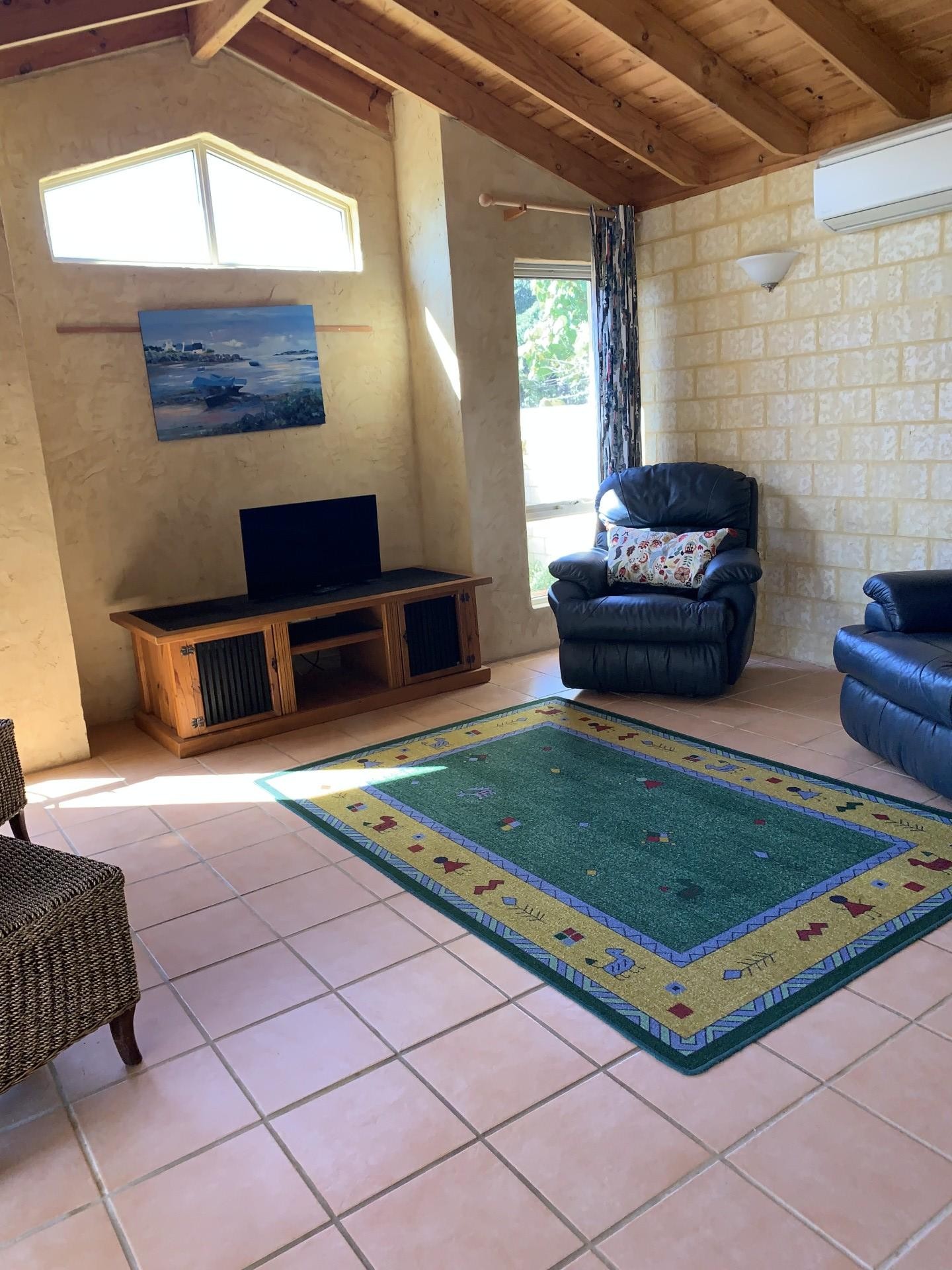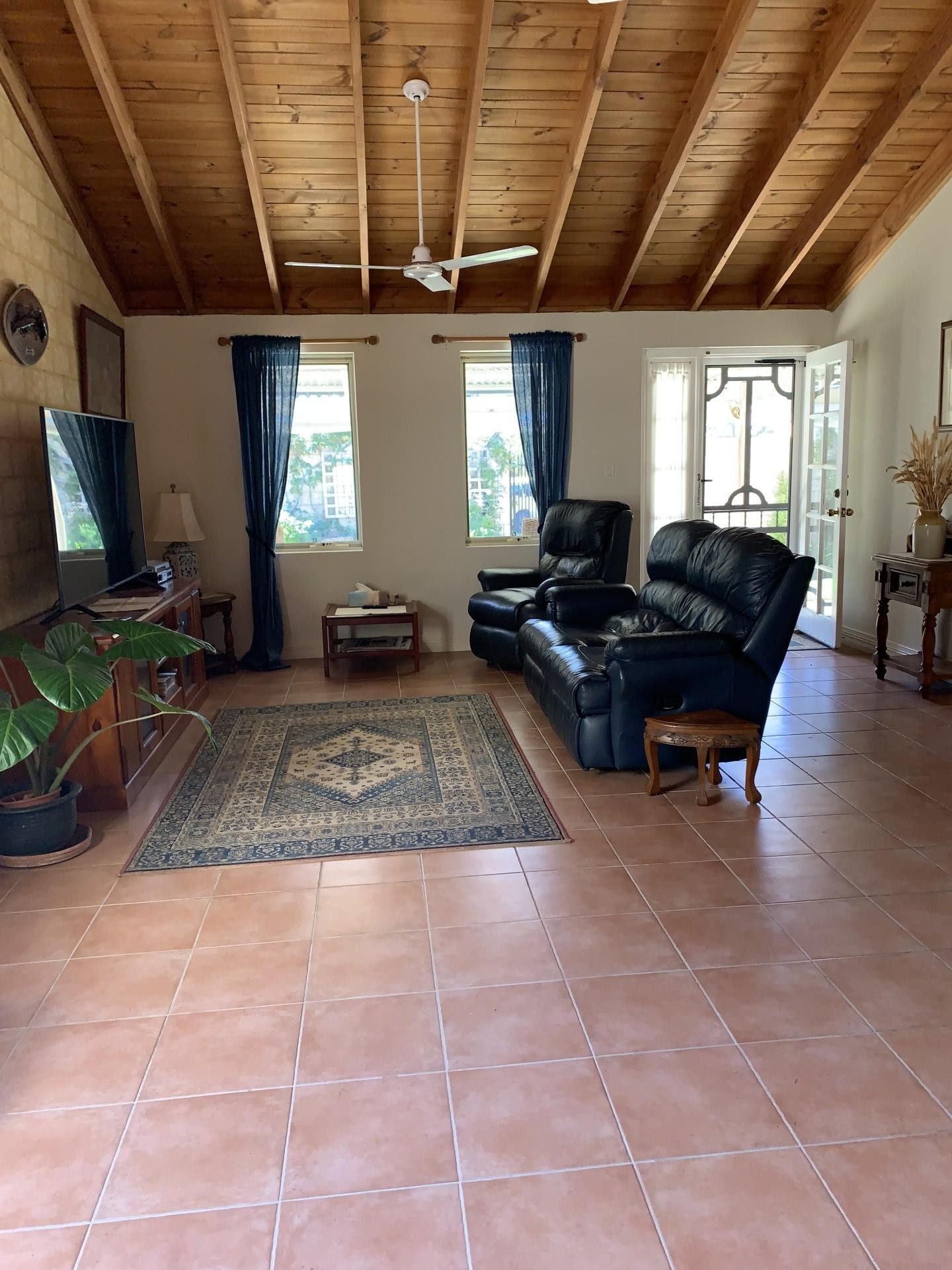 Vaulted wooden ceilings create a sense of space in both living areas, and terracotta look-alike tiles create a Mediterranean feel throughout the entire house.