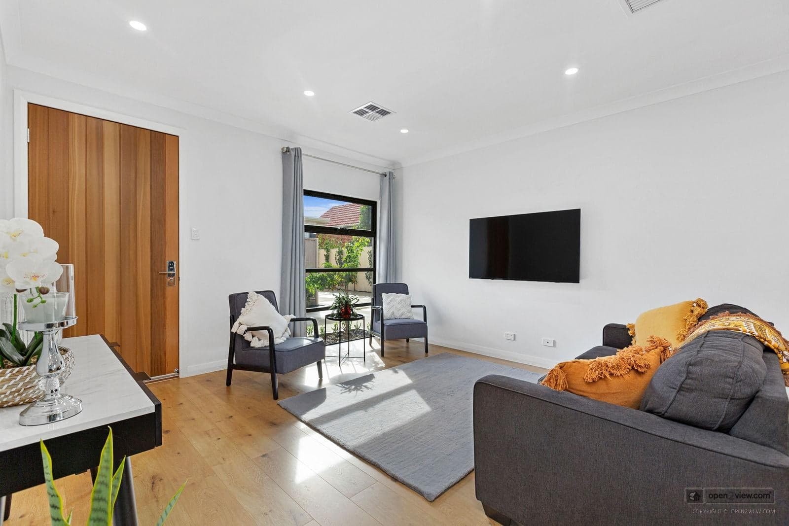 Enter through the luxury cedar door or the garage access door into an open-plan living area with 9 ft ceilings and luxury fittings.