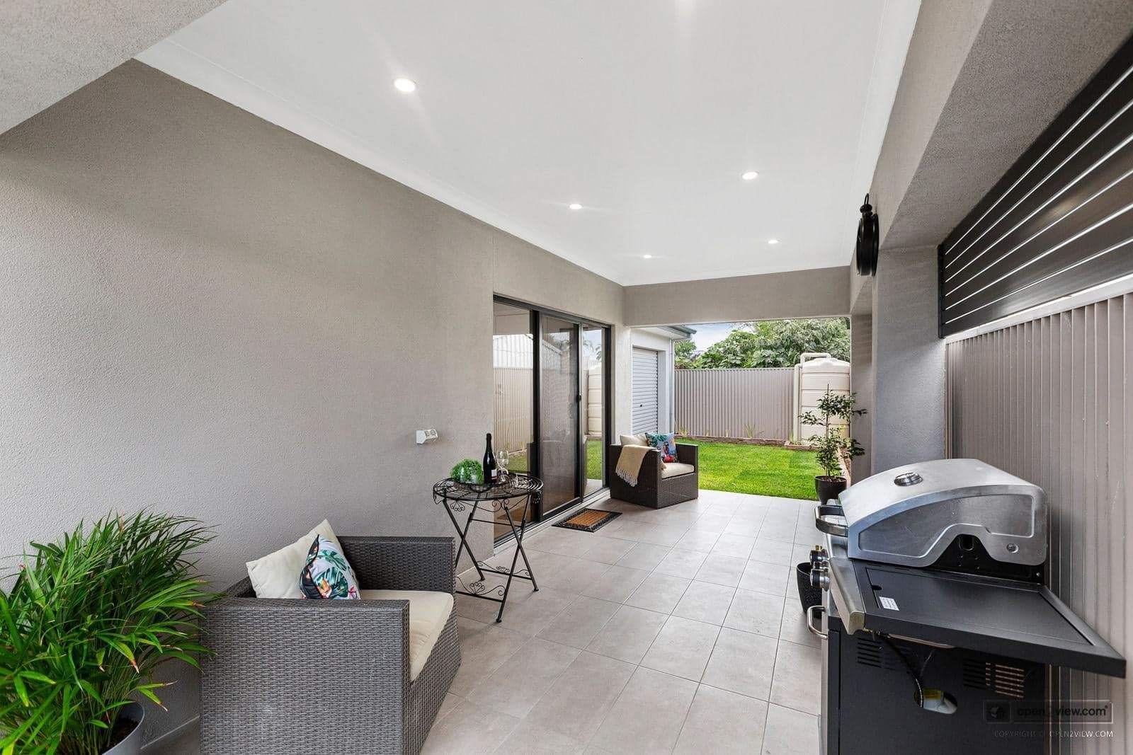 The manicured backyard and low-maintenance garden with a bonus rainwater tank.
