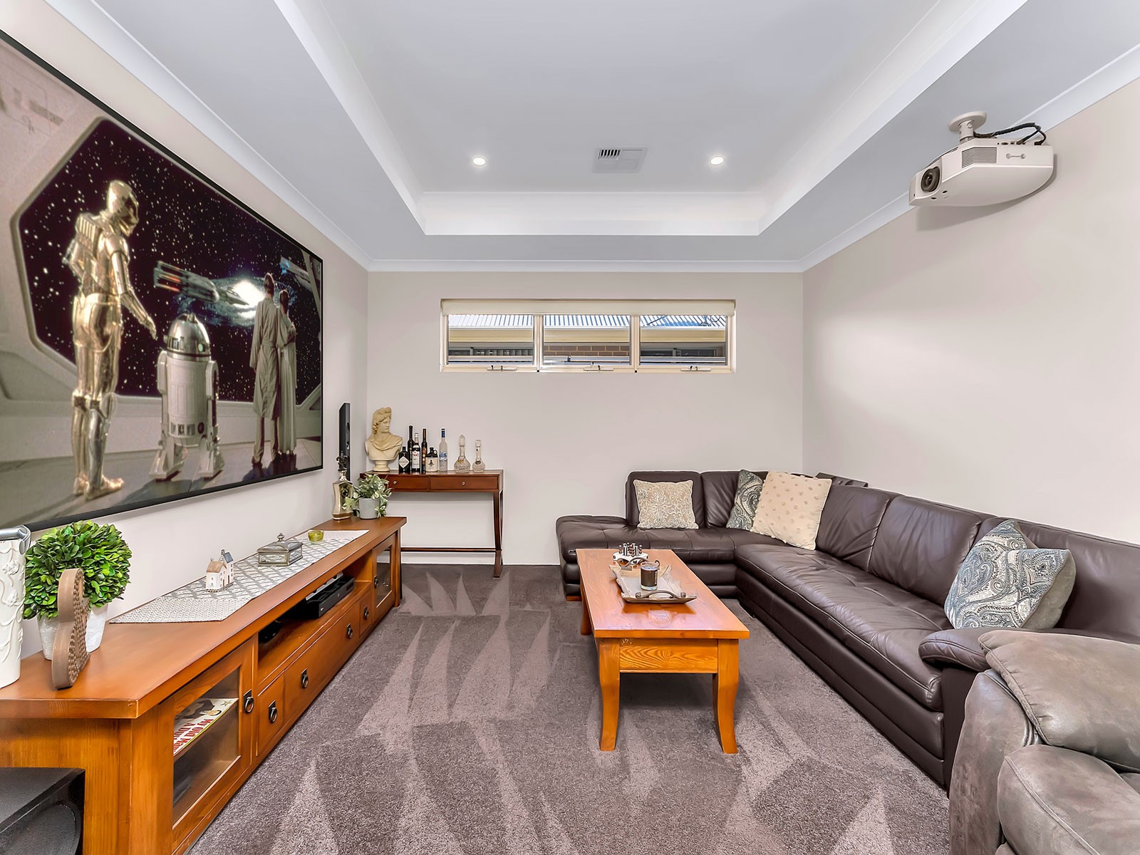 In the theatre, you will find a beautiful coffered ceiling and a built-in projector included in the house.