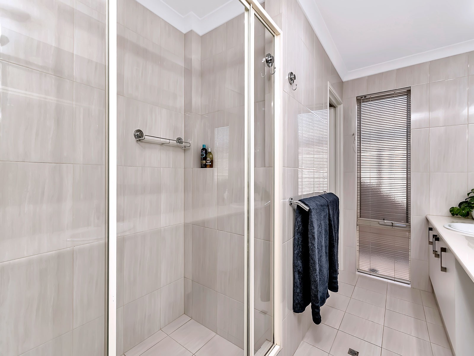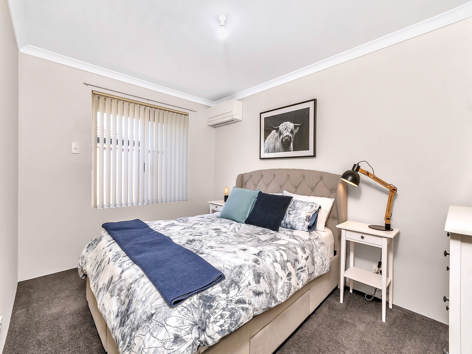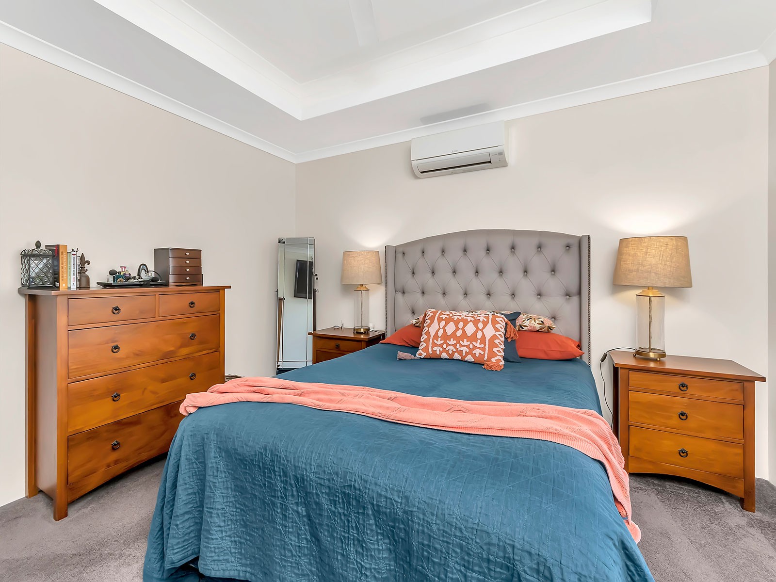 • Tiled living areas and carpeted bedrooms.