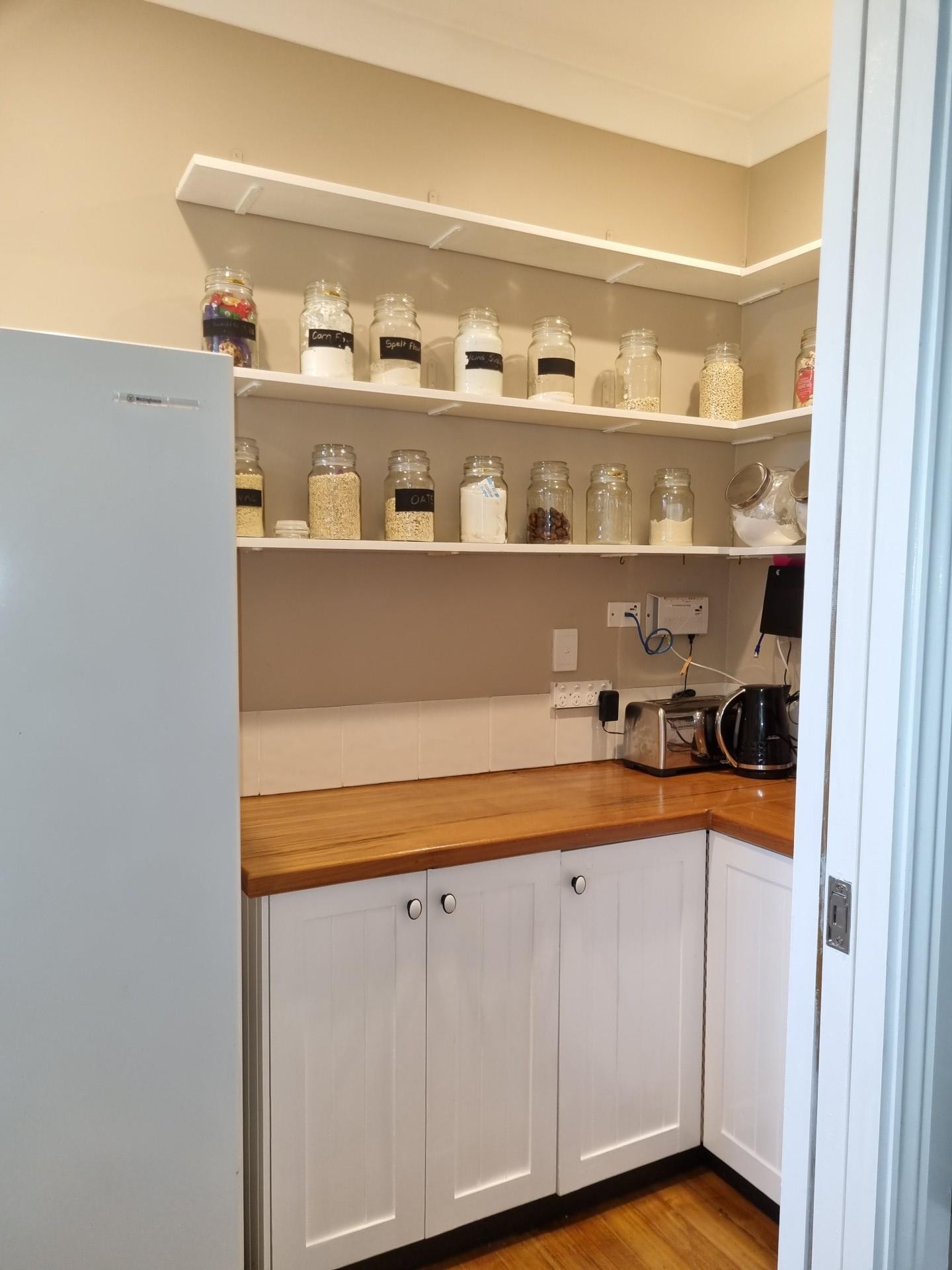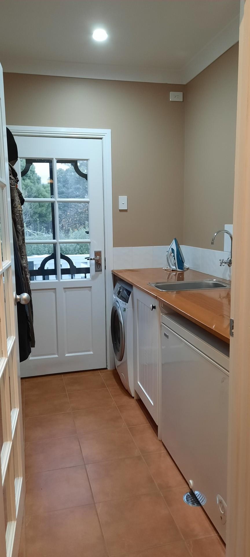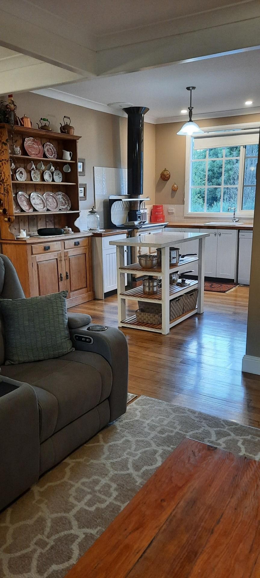 The open plan lounge, dining and attractive kitchen offers a very social living area, kept cosy and warm in winter with a heat transfer system that ensures the heat from a thumping Saxon wood heater is spread evenly throughout the home. A reverse cycle spilt system cools the cottage in summer. The bespoke country-style kitchen features oak benchtops, butler's sink, working combustion stove plus electric hob and oven. The versatile butler's pantry is home to all appliances, including, fridge, m/wave etc.