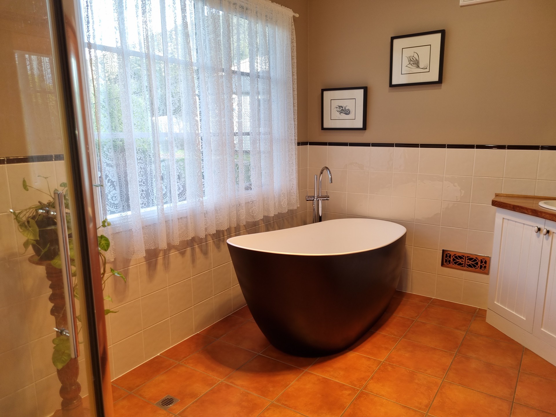 The roomy weatherboard cottage has three generous bedrooms; master with gorgeous rural views, ensuite and WIR, plus two double bedrooms, both with WIR. The spacious main bathroom has a stunning freestanding bath, separate shower alcove, handbasin and WC. A separate powder room provides a third WC.