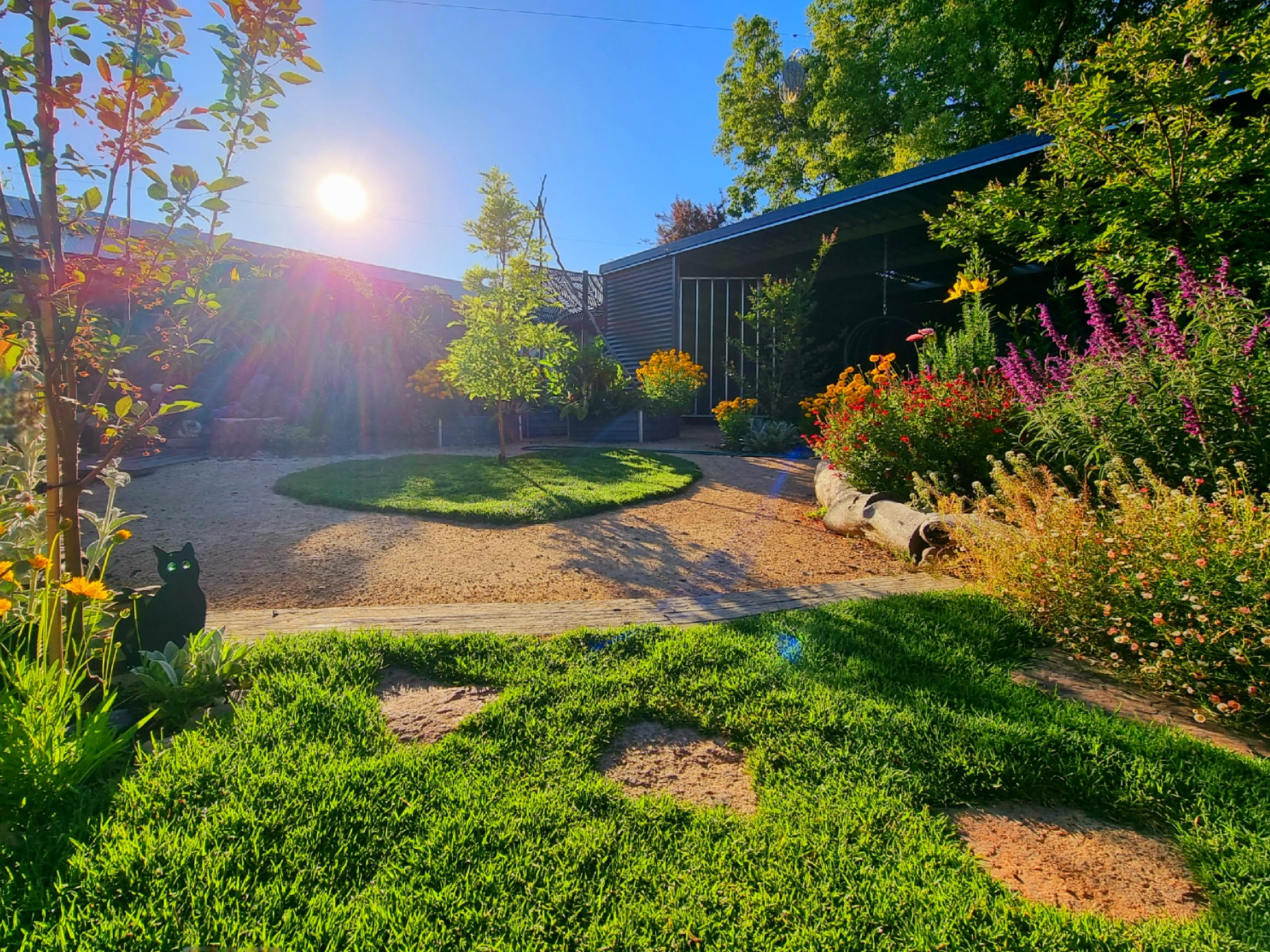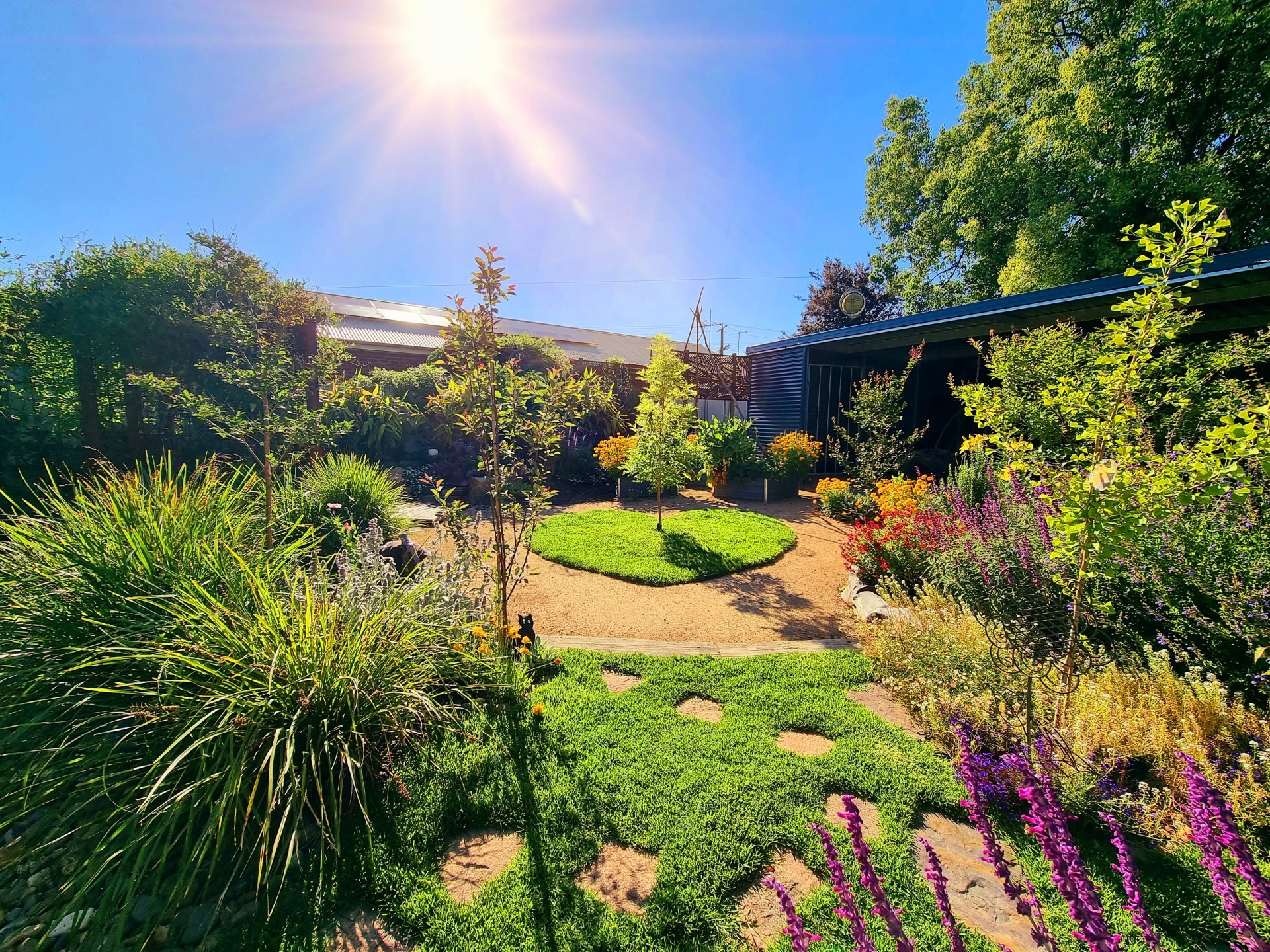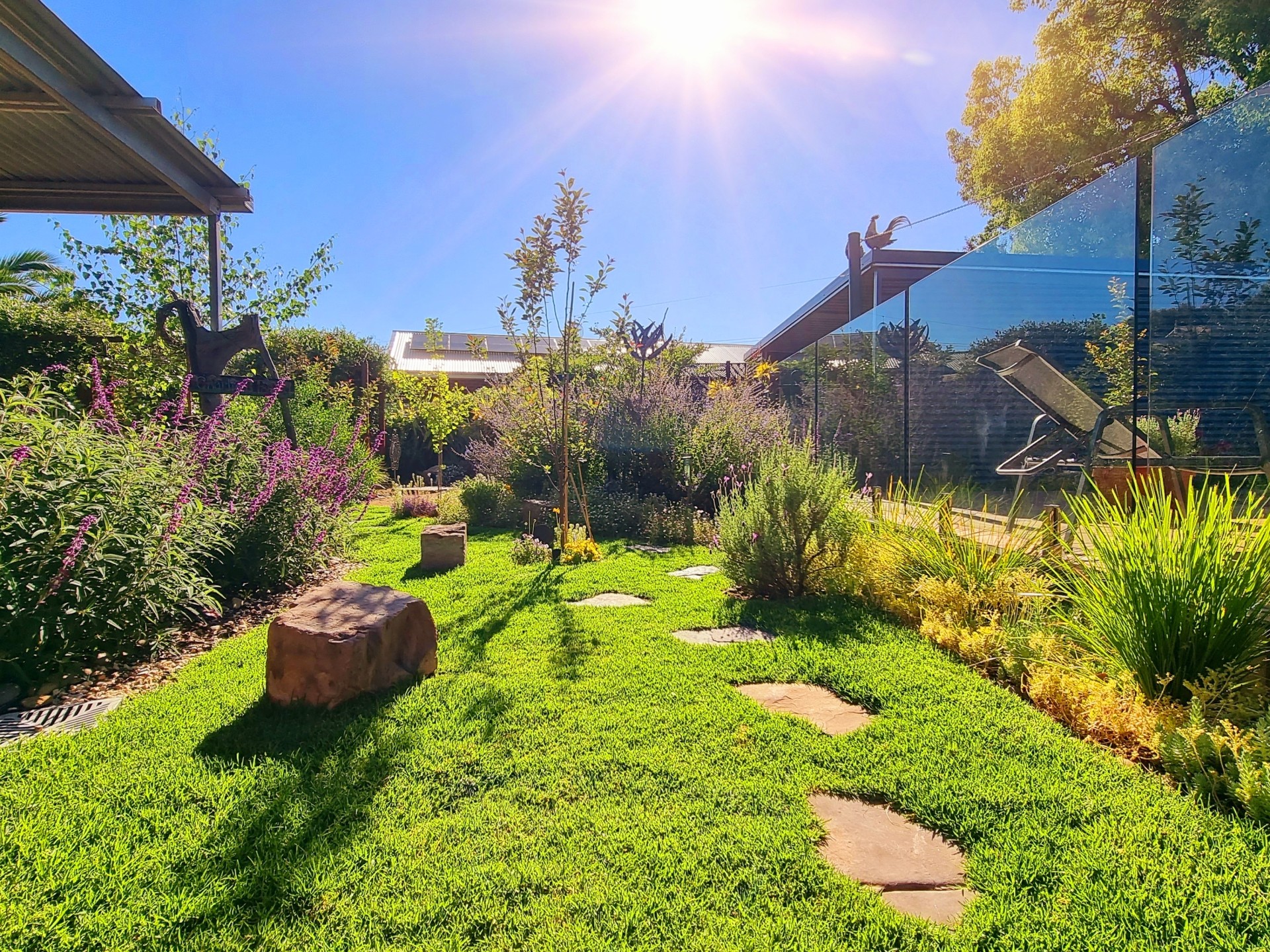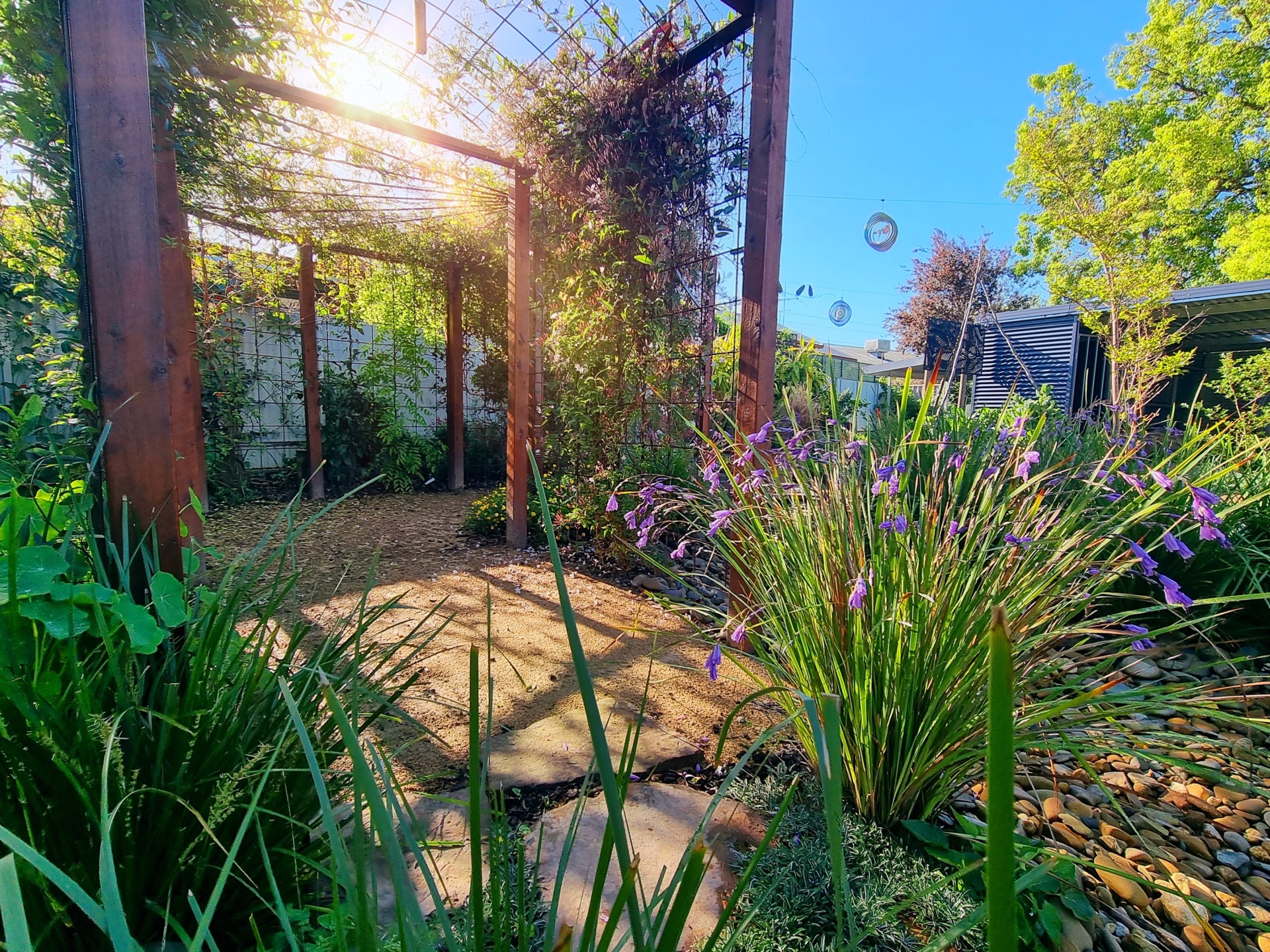 • Very private rear garden includes pergola, many fruiting and ornamental trees, raised garden beds, herbs and veggie patch with garden lighting