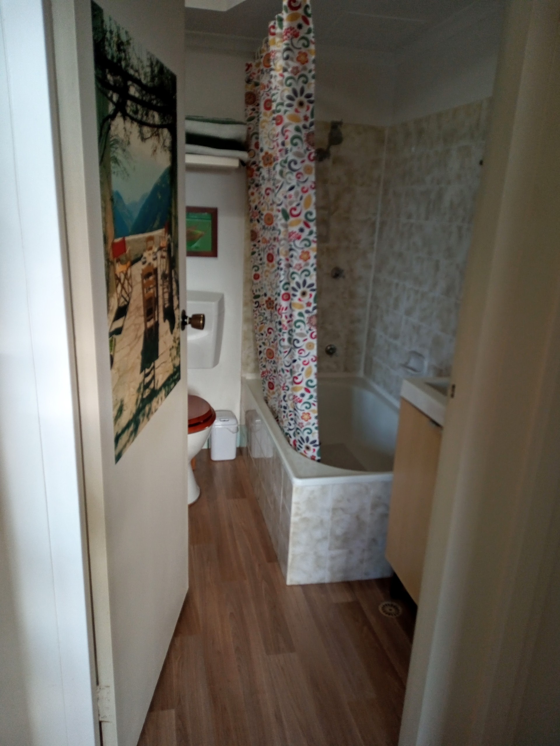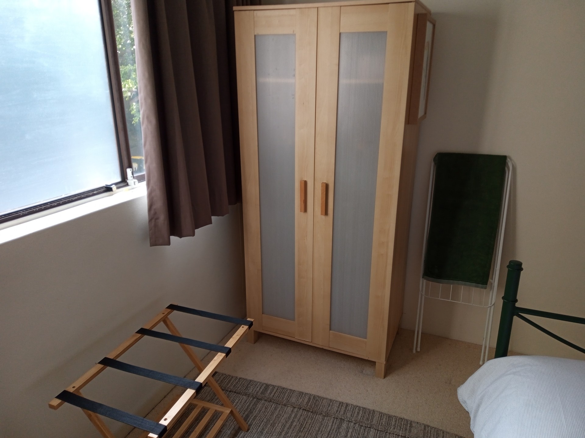 This is a comfortable, pleasant place with a few bonus features - balcony, undercover car space, new air conditioner, ceiling fans, separate laundry, and separate storage cage. The outlook is leafy and private from all but the little bedroom. The flat is on the first floor at the rear of the building in the northeast corner. No traffic noise. The kitchen, living room and main bedroom face east and the little bedroom faces north.
